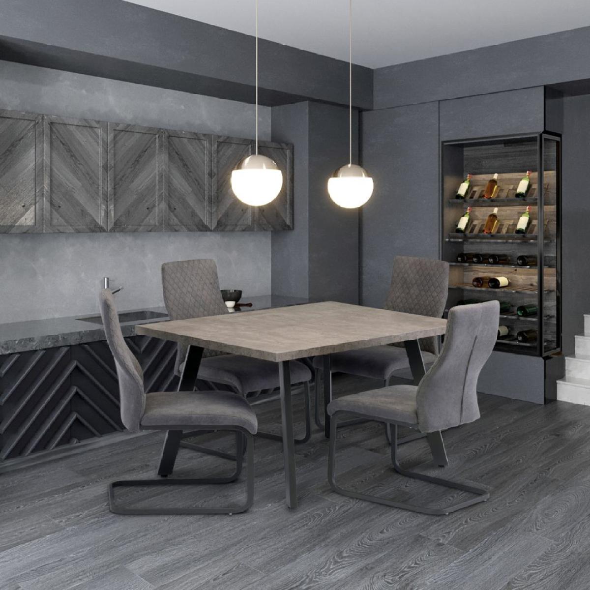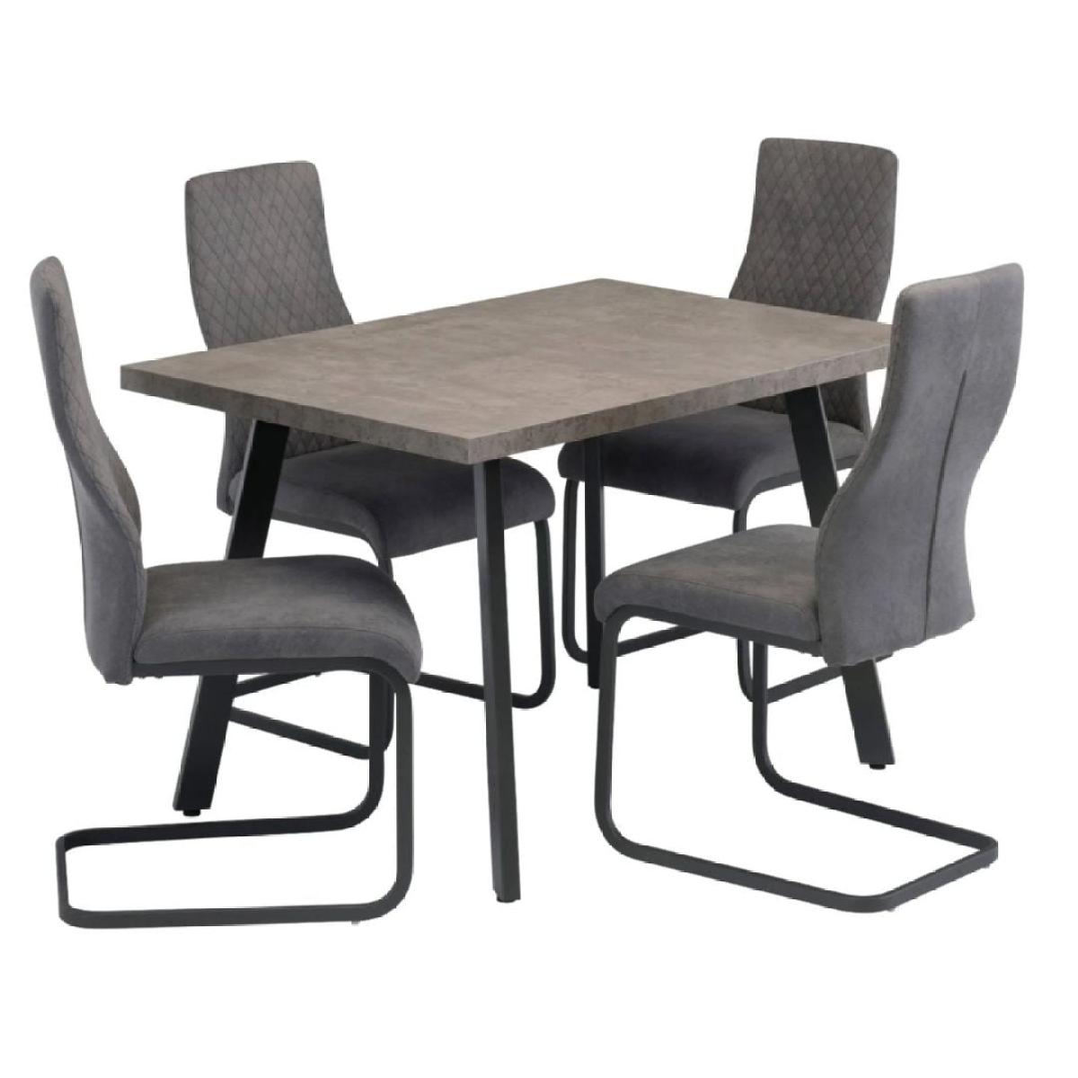 Introducing the Amalfi 4-Seat Dining Set in Grey – a perfect choice for a small dining space. This square dining table and matching chairs create a cozy and stylish dining set for small spaces. The Amalfi dining set is the ideal solution when you're looking for a compact dining set for small rooms. Its elegant design and contemporary gray finish make it a versatile and attractive addition to your home. The table has an ndustrial design with a 'cement-look' melamine finish on a grey powder coated frame. Complimented with modern fabric grey chairs with cross stitch pattern. Introducing the Amalfi 4-Seat Dining Set in Grey – a perfect choice for a small dining space. This square dining table and matching chairs create a cozy and stylish dining set for small spaces. The Amalfi dining set is the ideal solution when you're looking for a compact dining set for small rooms. Its elegant design and contemporary gray finish make it a versatile and attractive addition to your home. The table has an ndustrial design with a 'cement-look' melamine finish on a grey powder coated frame. Complimented with modern fabric grey chairs with cross stitch pattern.