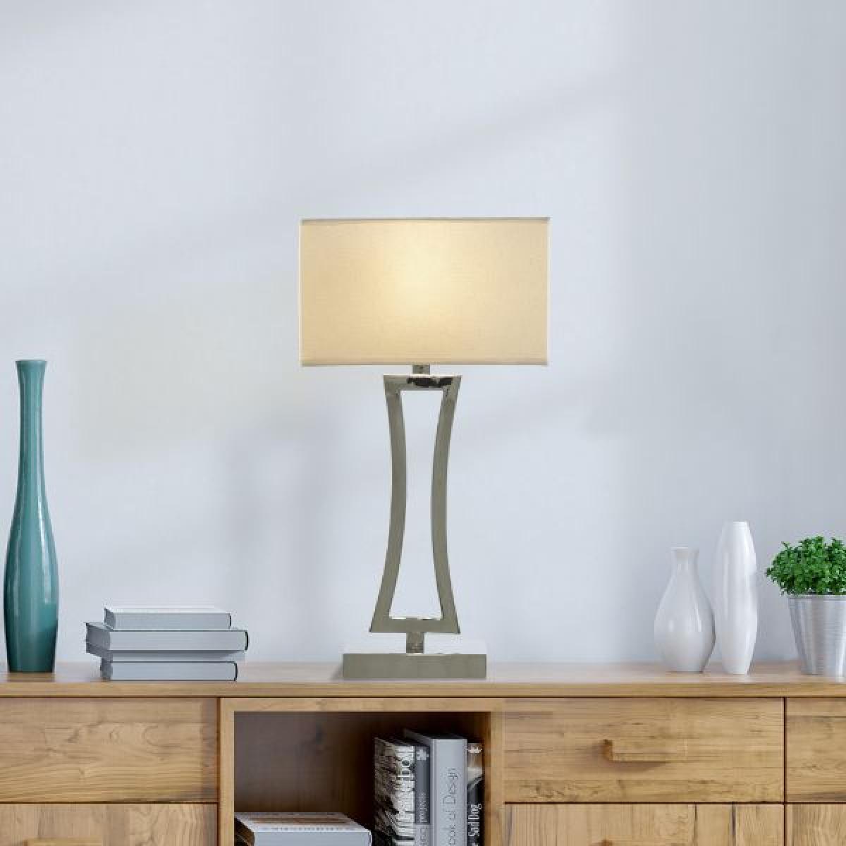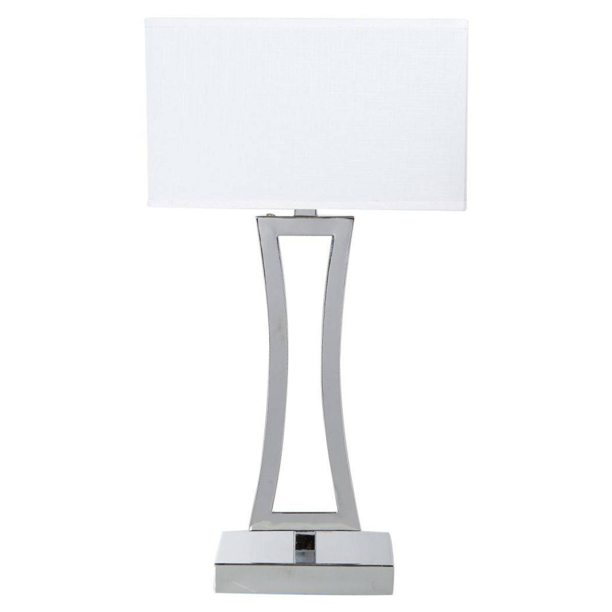 Contemporary table lamp with a polished chrome finish.. An elegant addition to your home, this table lamp is exclusive to Pagazzi Lighting. Finished in polsihed chrome, this stylish table lamp features a cutout design base with a rectangular white fabric shade. Perfect for hallways, living rooms or as a bedside lamp.