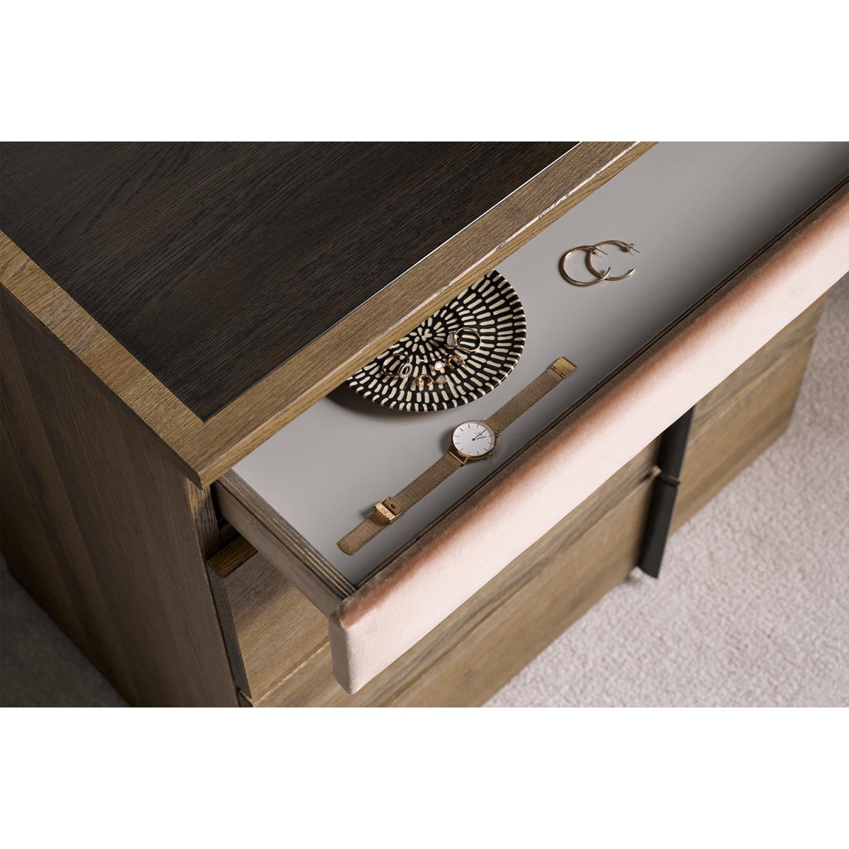 Amalfi modern design and smoked glass inlay cuts a contemporary figure. Providing ample space across 3 drawers, complete with a unique handle design, and a fabric accessory drawer available in our wide selection of velvets, linens, cottons and more, this wooden wonder is the perfect partner to getting ready, day or night.