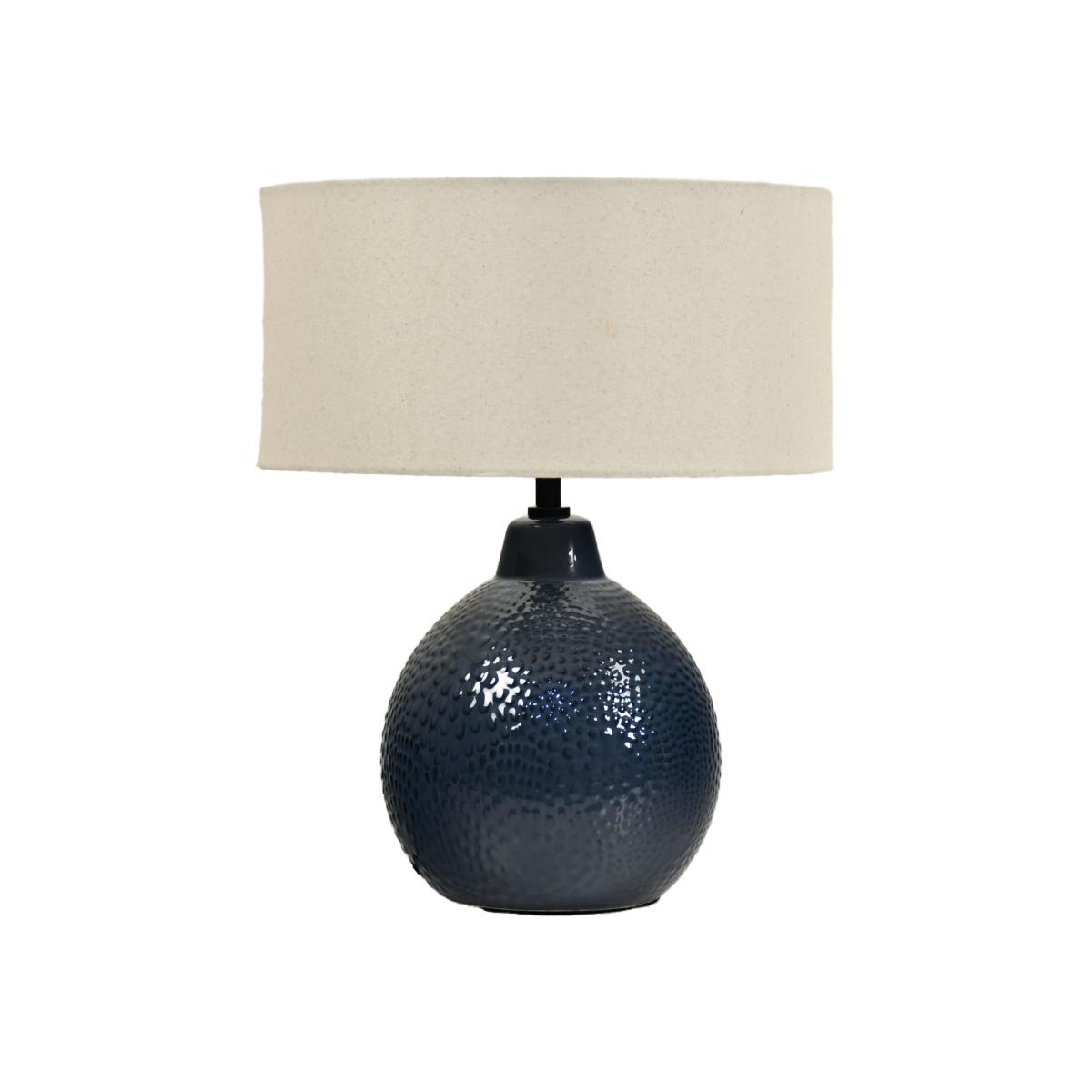 This beautifully crafted ceramic table lamp has a subtle relief texture that captures the light and the blue glaze to give another dimension to the surface. Finished off with a natural cotton effect shade. The table lamp is the perfect proportion for a bedside, side table or console and will look fabulous as a stand alone piece or used in a pair