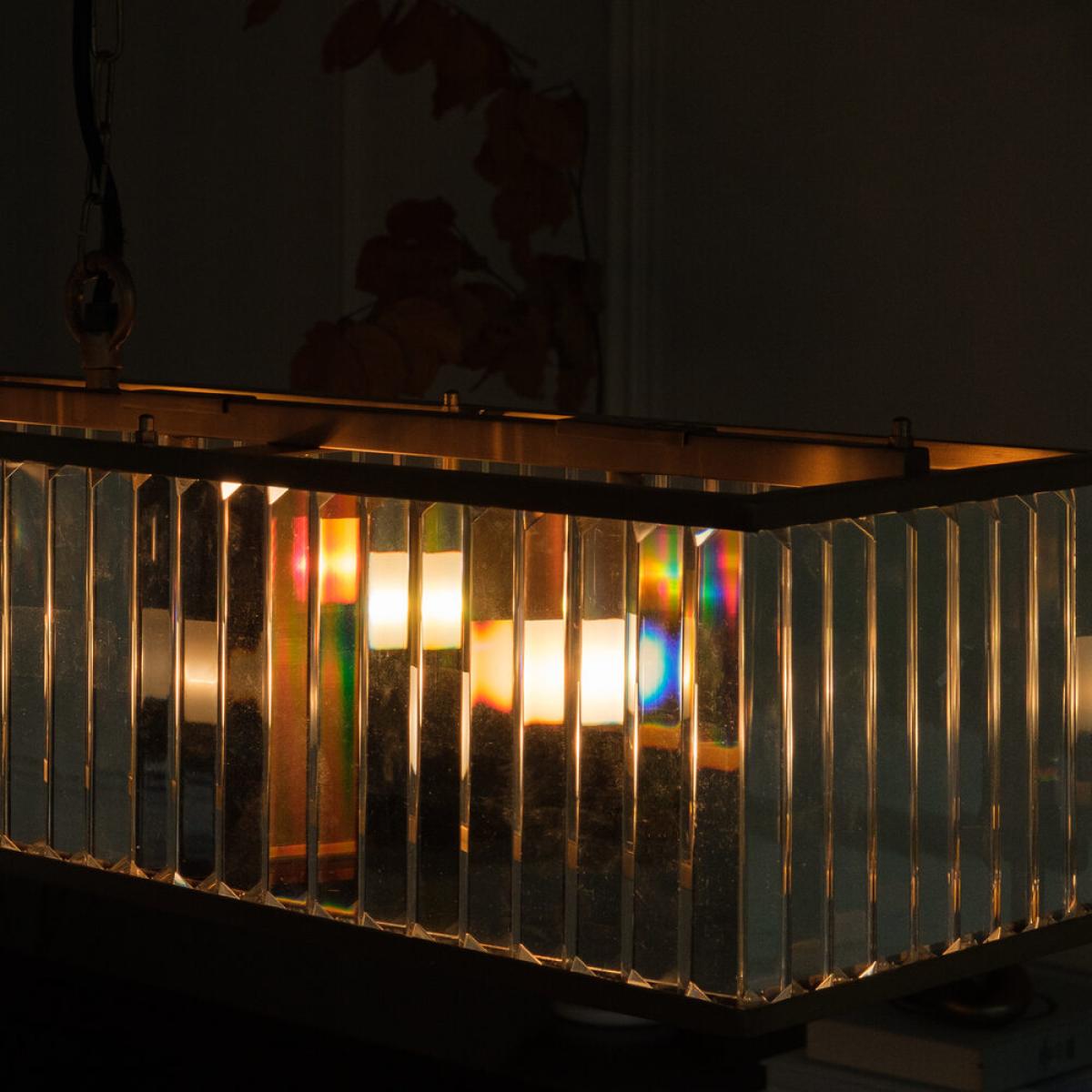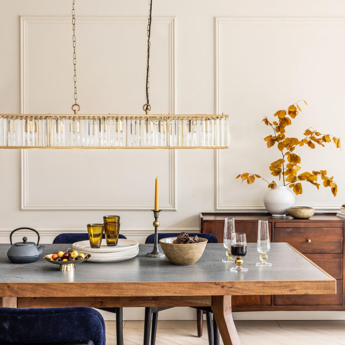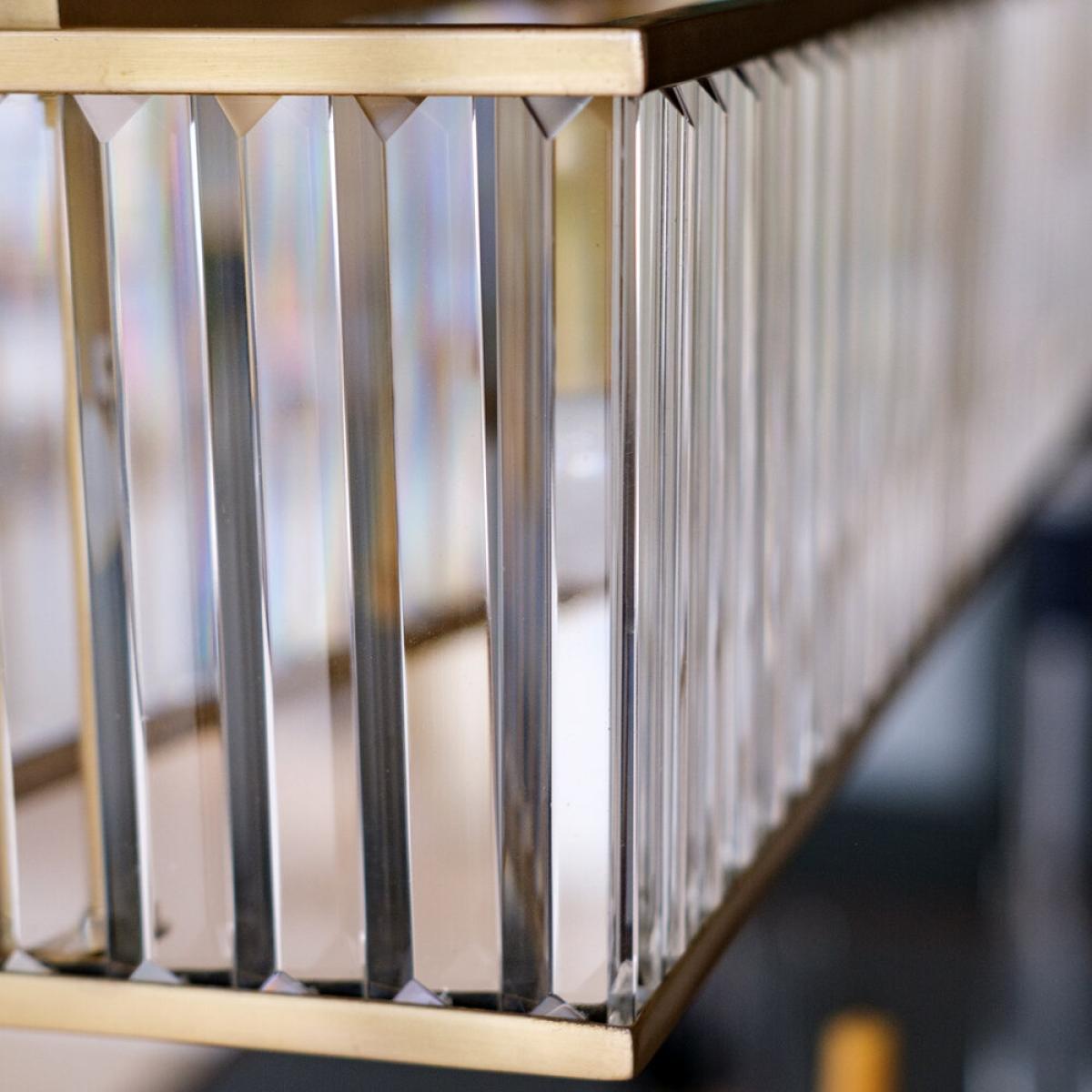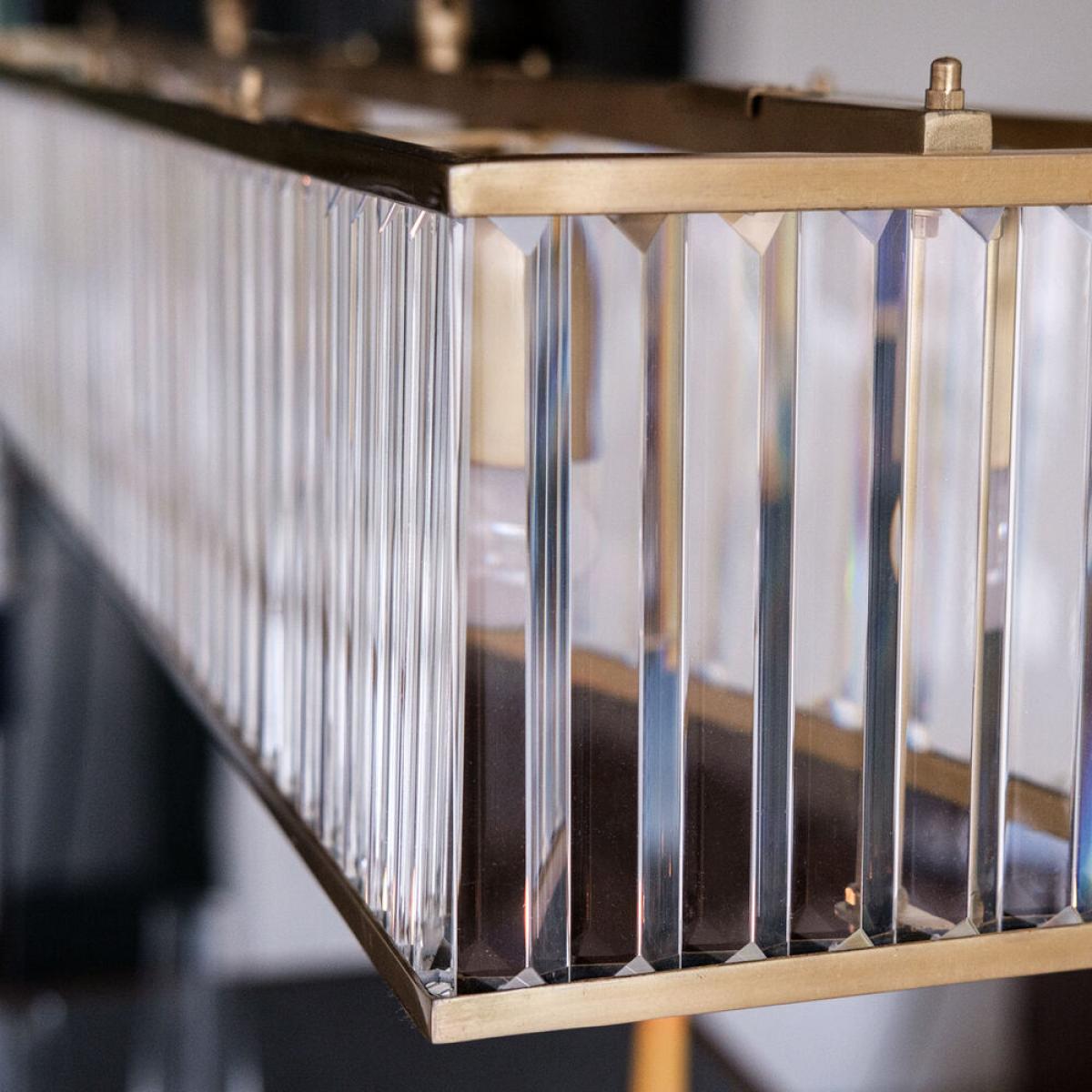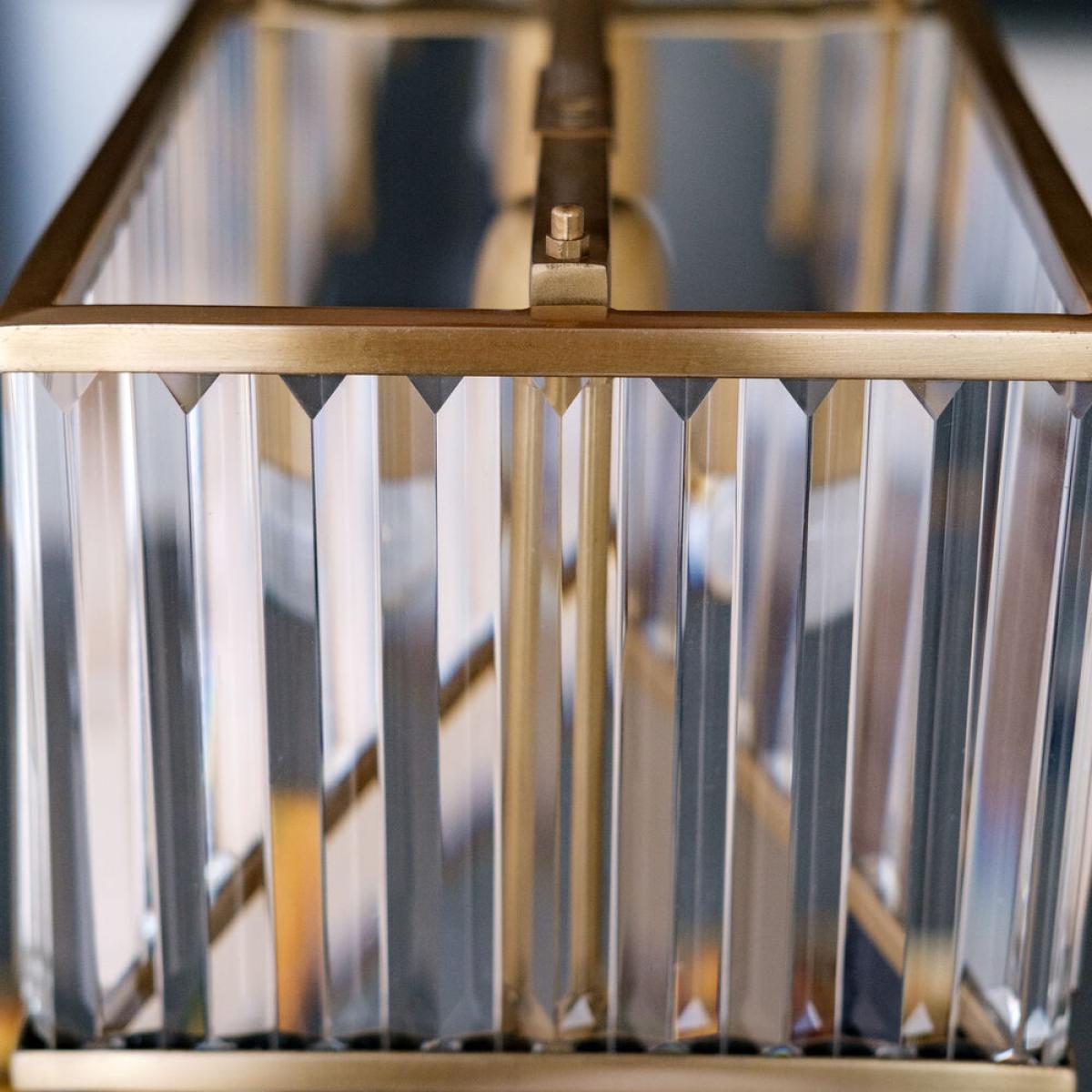 Adding instant impact to any space, our Amalfi Crystal Chandelier is a stunning long rectangular chandelier, expertly crafted with clear glass crystals and antique brass details. Perfect for bringing a luxurious look to a living room or kitchen this is the ultimate chandelier to hang above your dining table. This eye-catching statement piece of lighting that blends a vintage look with enduring glamour.