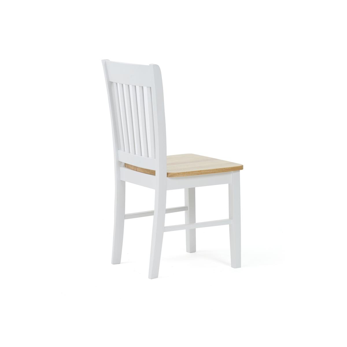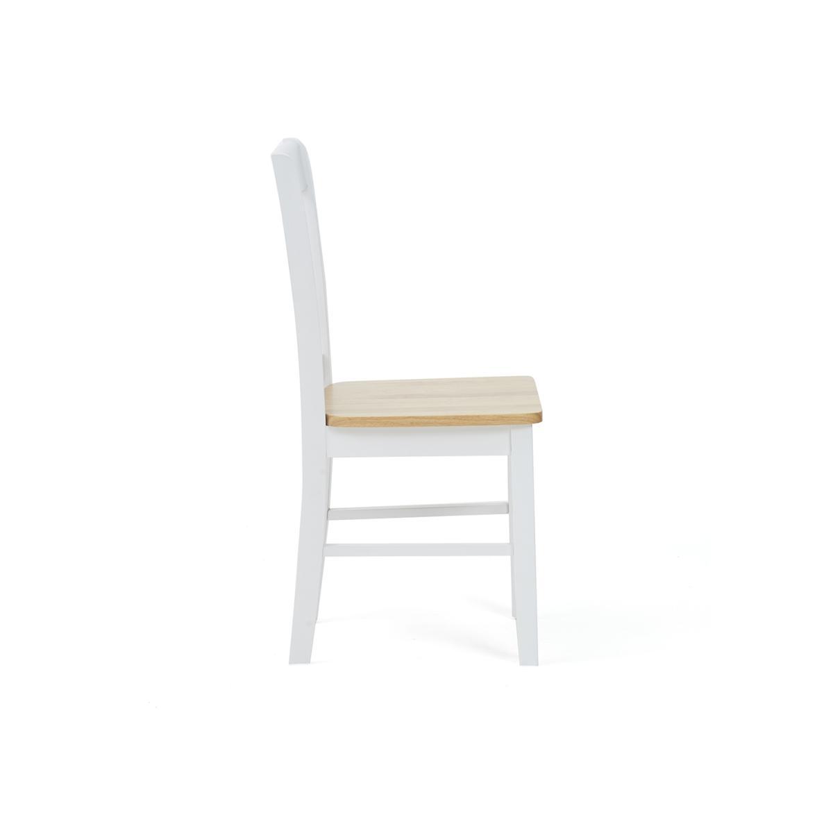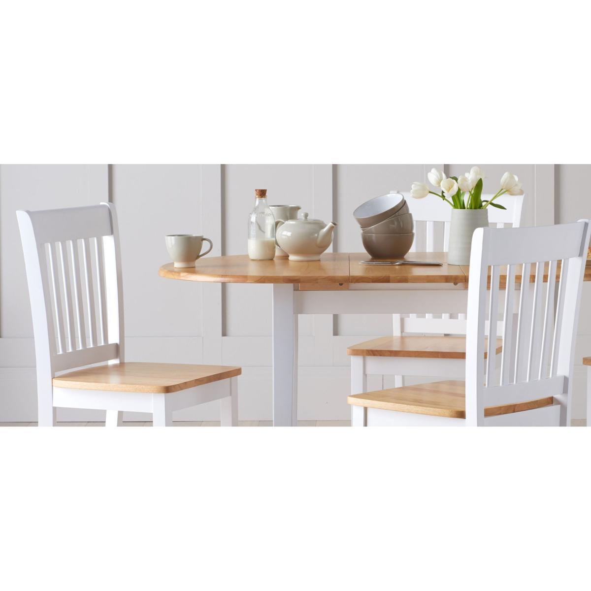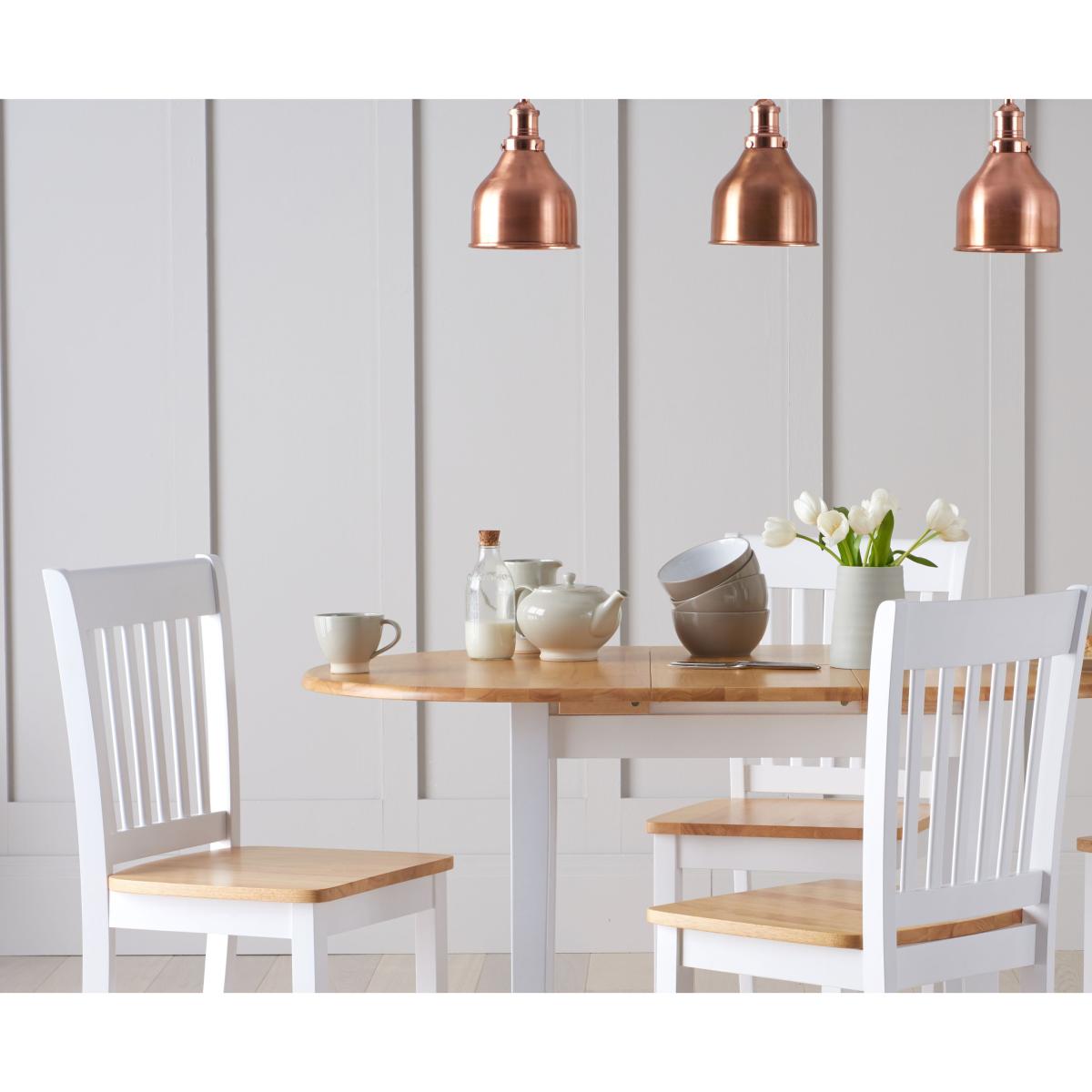 The Amalfi Oak and White Extending Dining Table brings style and practicality to any home. Chic and versatile, the space saving dining table comfortably seats up to 4 people. Crafted with care from resilient solid hardwood, the extending dining table features a smooth table top with a clear lacquered finish supported by durable white painted legs for an attractive contrast. Ideal for kitchens and small dining areas, the painted dining table extends to 135cm in length in moments via a convenient inbuilt butterfly extension feature. Complementing the painted extending table, Amalfi Chairs are crafted from solid hardwood and feature a slatted backrest and white painted finish. The stylish dining chairs are complete with a bevelled timber seat.