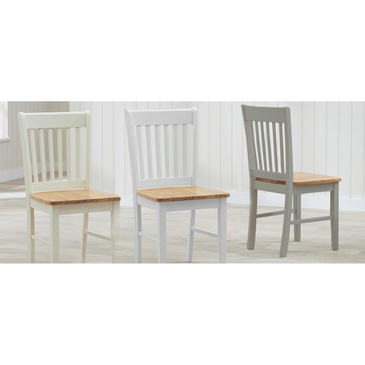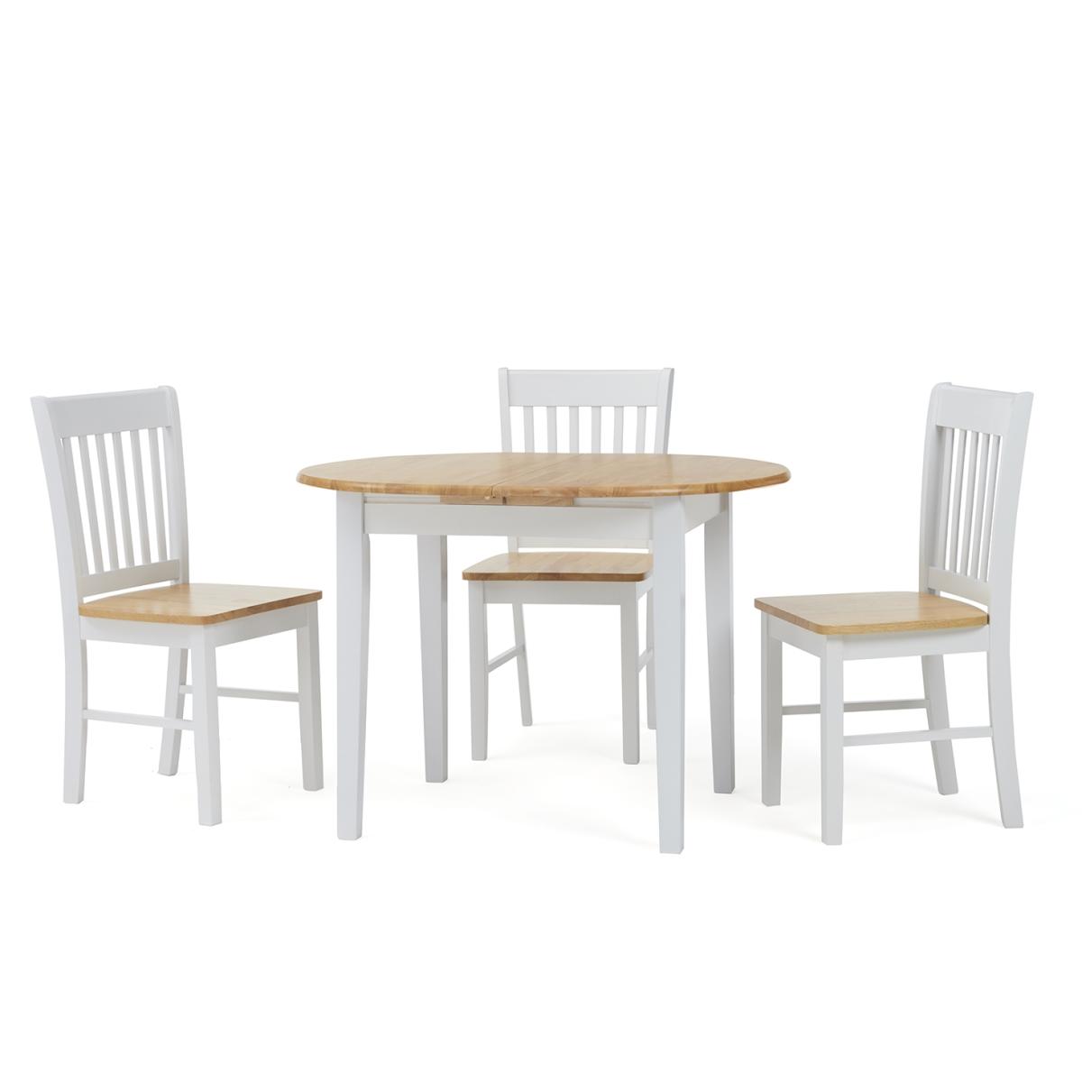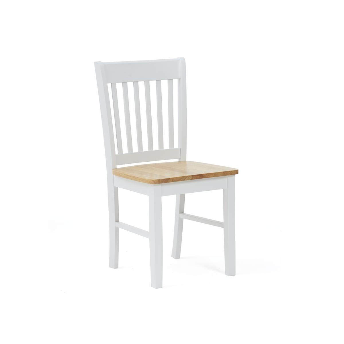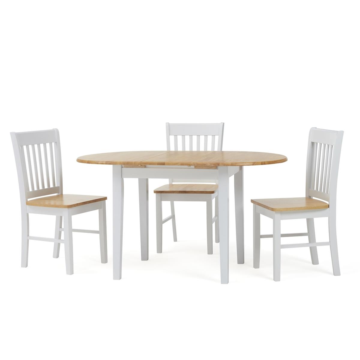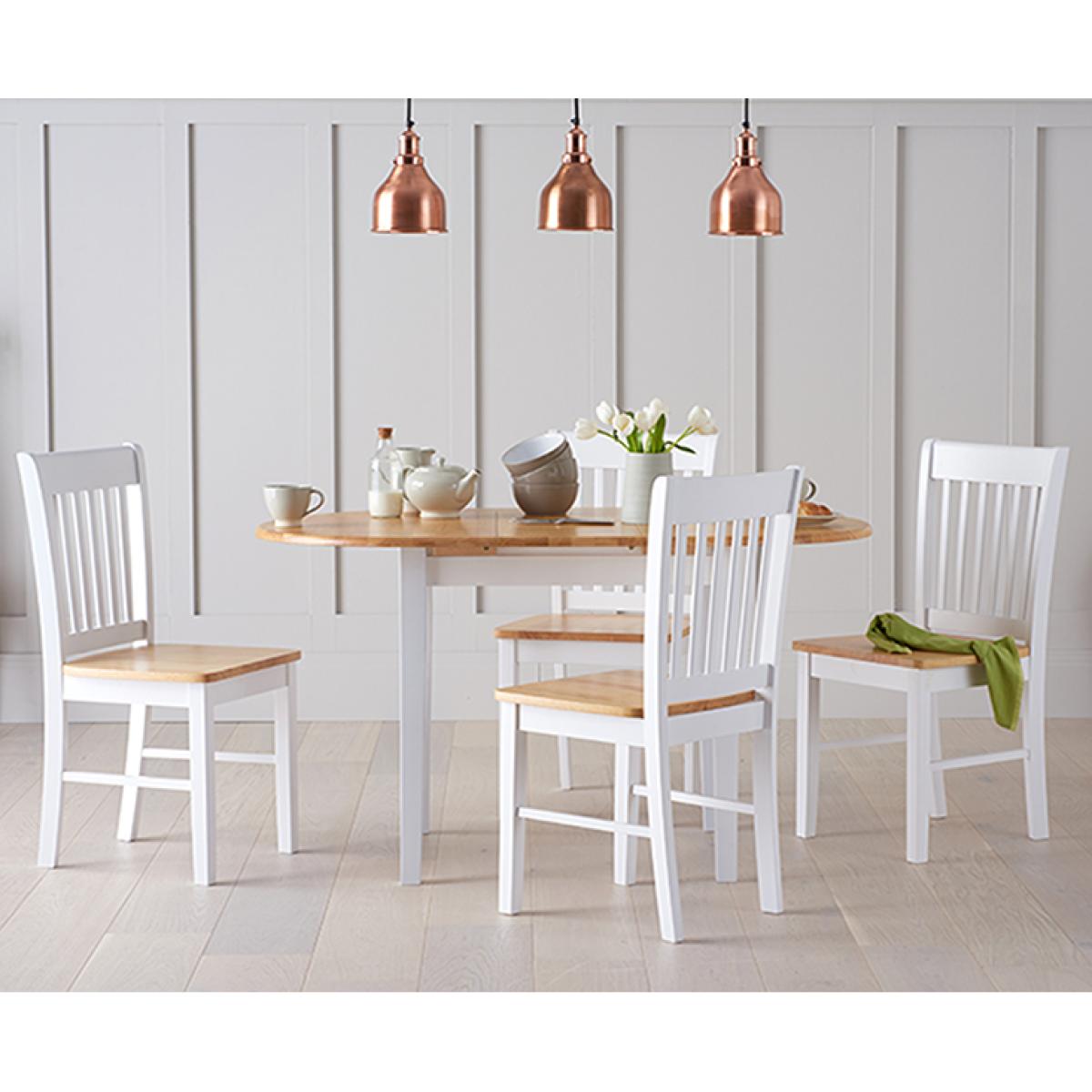The Amalfi Oak and White Extending Dining Table brings style and practicality to any home. Chic and versatile, the space saving dining table comfortably seats up to 4 people. Crafted with care from resilient solid hardwood, the extending dining table features a smooth table top with a clear lacquered finish supported by durable white painted legs for an attractive contrast. Ideal for kitchens and small dining areas, the painted dining table extends to 135cm in length in moments via a convenient inbuilt butterfly extension feature. Complementing the painted extending table, Amalfi Chairs are crafted from solid hardwood and feature a slatted backrest and white painted finish. The stylish dining chairs are complete with a bevelled timber seat.