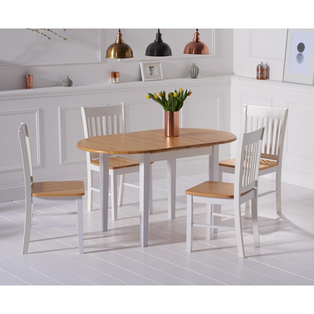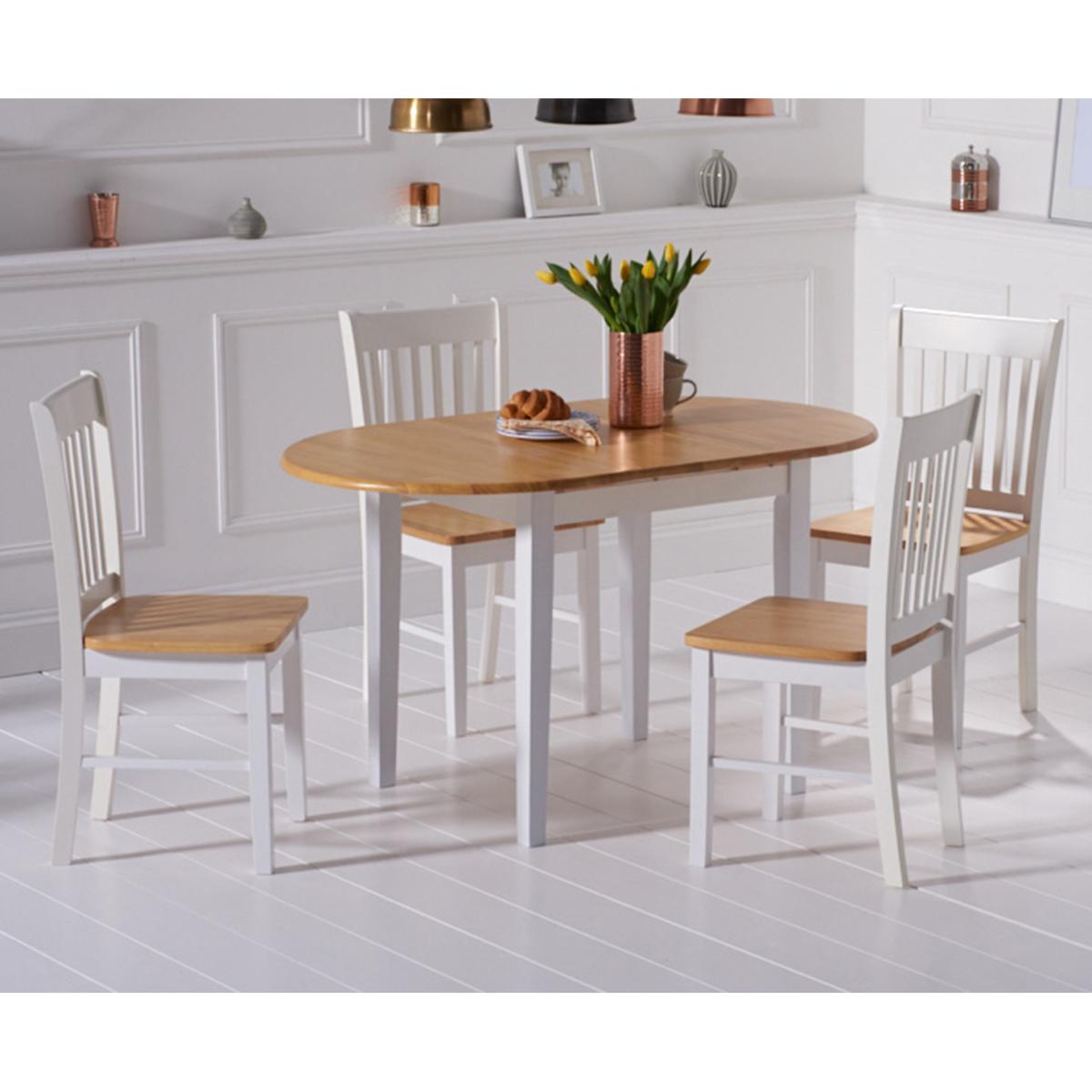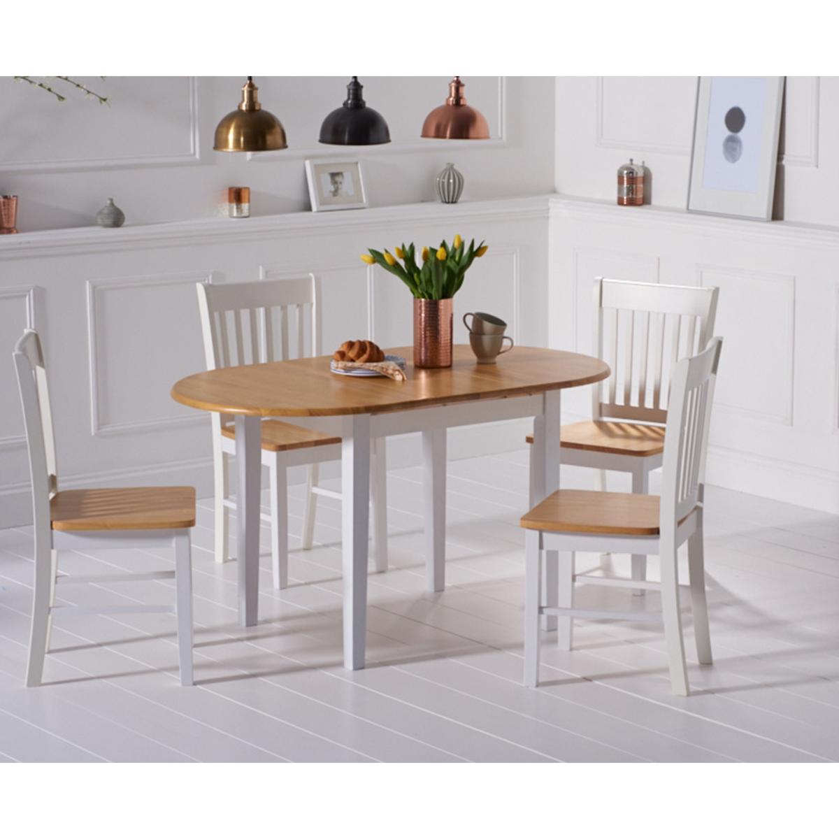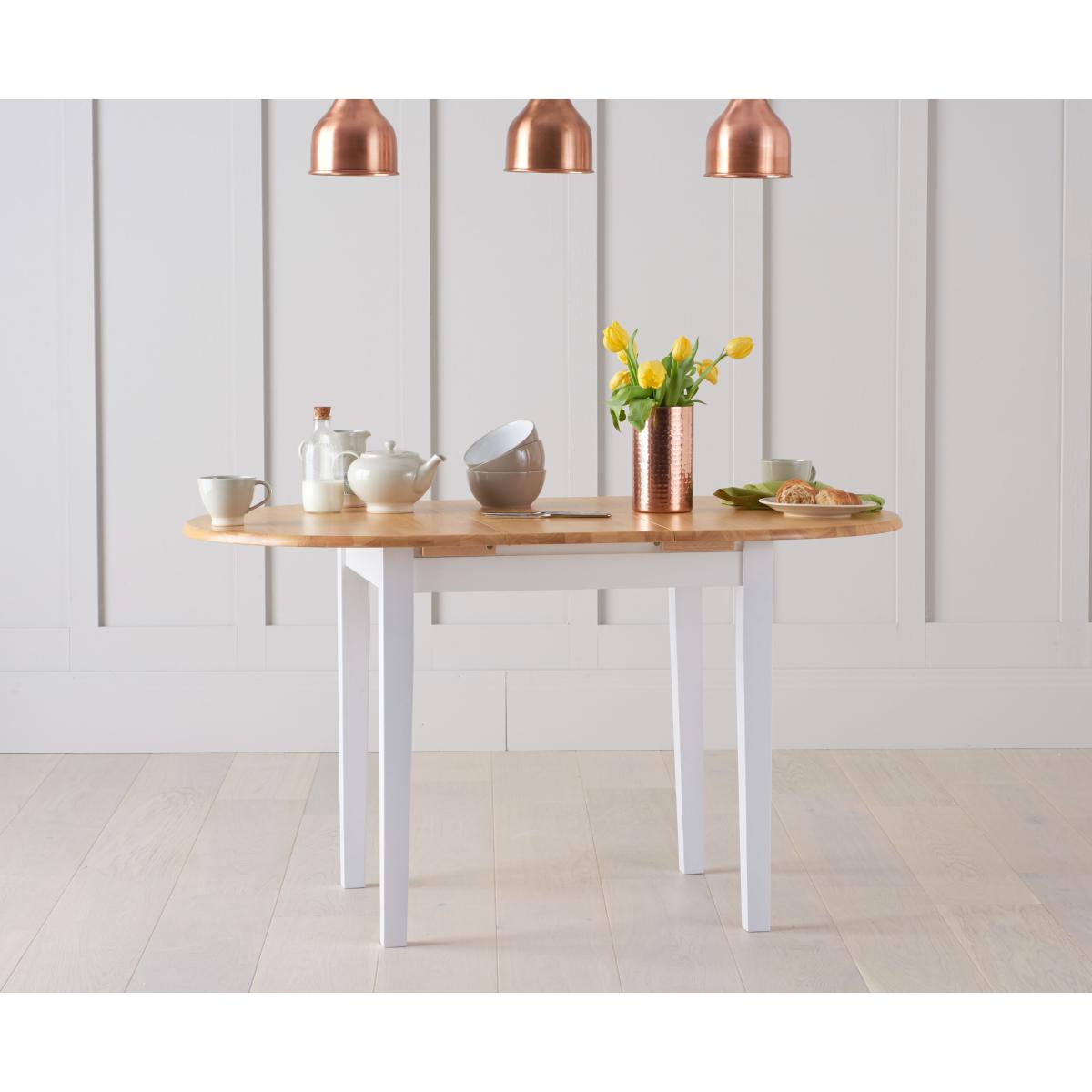 The Amalfi Oak and White Extending Dining Table brings style and practicality to any home. Chic and versatile, the space saving dining table comfortably seats up to 4 people. Crafted with care from resilient solid hardwood, the extending dining table features a smooth table top with a clear lacquered finish supported by durable white painted legs for an attractive contrast. Ideal for kitchens and small dining areas, the painted dining table extends to 135cm in length in moments via a convenient inbuilt butterfly extension feature. Complementing the painted extending table, Amalfi Chairs are crafted from solid hardwood and feature a slatted backrest and white painted finish. The stylish dining chairs are complete with a bevelled timber seat.