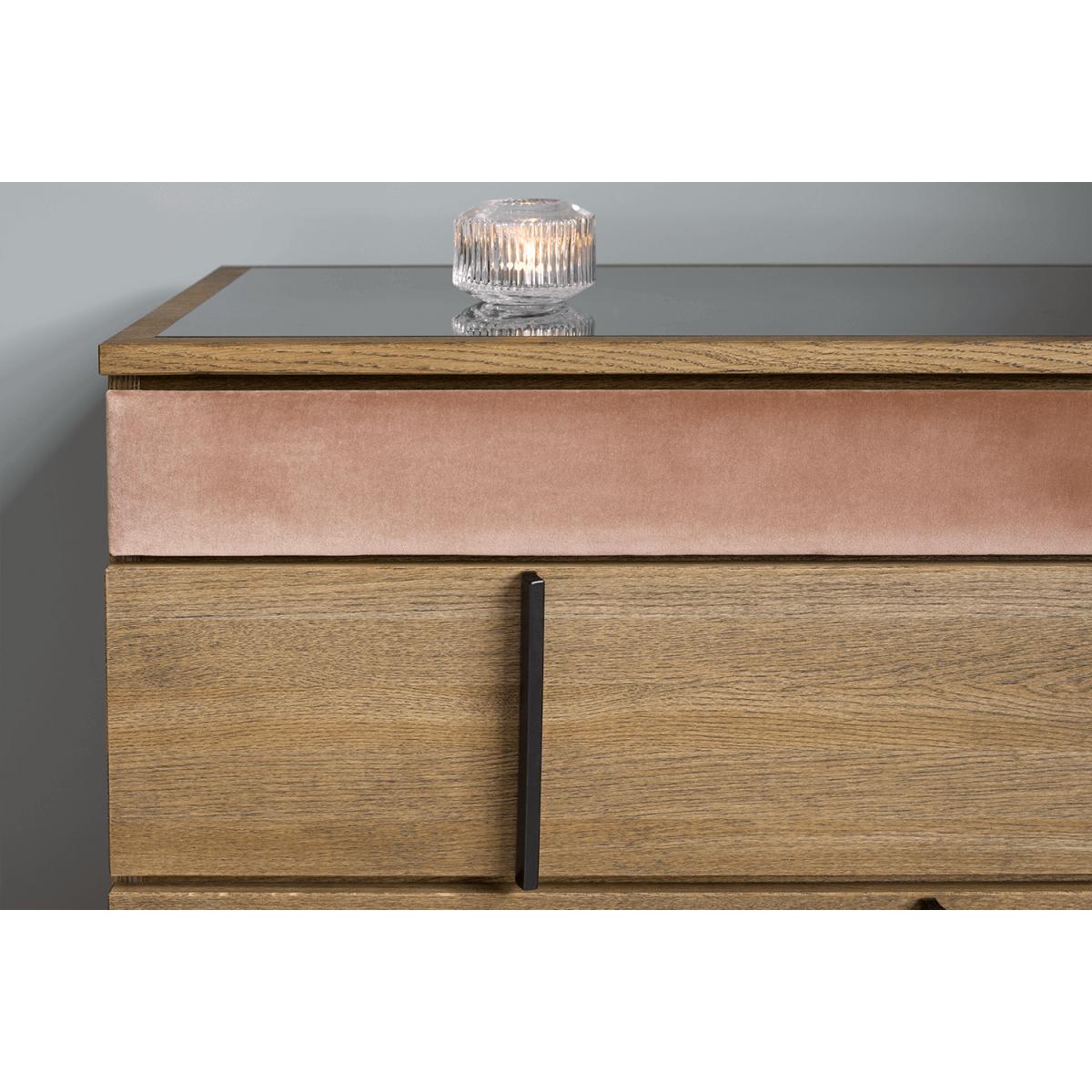 Amalfi modern design and smoked glass inlay cuts a contemporary figure. Providing ample space across 3 drawers, complete with a unique handle design, and a fabric accessory drawer available in our wide selection of velvets, linens, cottons and more, this wooden wonder is the perfect partner to getting ready, day or night.