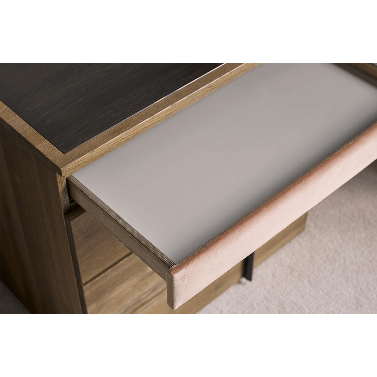 Amalfi modern design and smoked glass inlay cuts a contemporary figure. Providing ample space across 3 drawers, complete with a unique handle design, and a fabric accessory drawer available in our wide selection of velvets, linens, cottons and more, this wooden wonder is the perfect partner to getting ready, day or night.