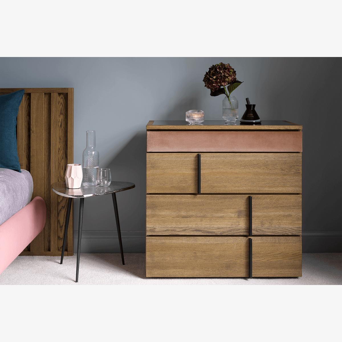 Amalfi modern design and smoked glass inlay cuts a contemporary figure. Providing ample space across 3 drawers, complete with a unique handle design, and a fabric accessory drawer available in our wide selection of velvets, linens, cottons and more, this wooden wonder is the perfect partner to getting ready, day or night.