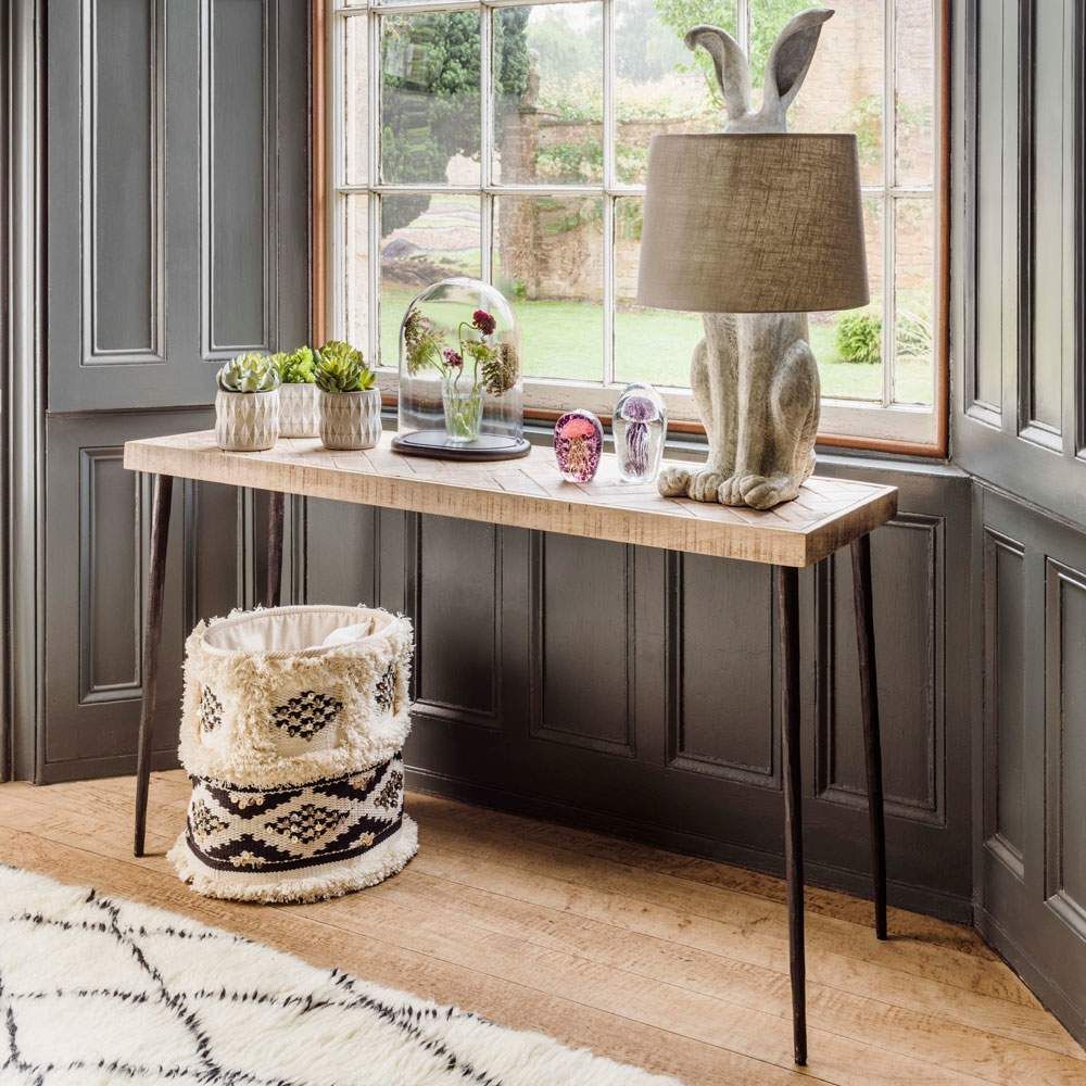 Add some mid-century, Scandi style to your hallway or living space with our Amaliah chevron console table. The unique, handcrafted herringbone pattern emphasises the unique variations in the mango wood, which combined with slender black tapered legs makes for a very stylish piece of furniture. H78 x W135 x D40cm. Made from mango wood and iron. Due to the natural nature of mango wood, the colour may vary slightly. Some self-assembly required. Legs to be to be attached to the table top. These assembly instructions can be found here. To avoid watermarks and heat damage, never place items such as ceramics, tableware or glassware directly onto the surface of any of our furniture without the protection of a heat resistant mat, coaster and/or trivet as this could mark the surface.