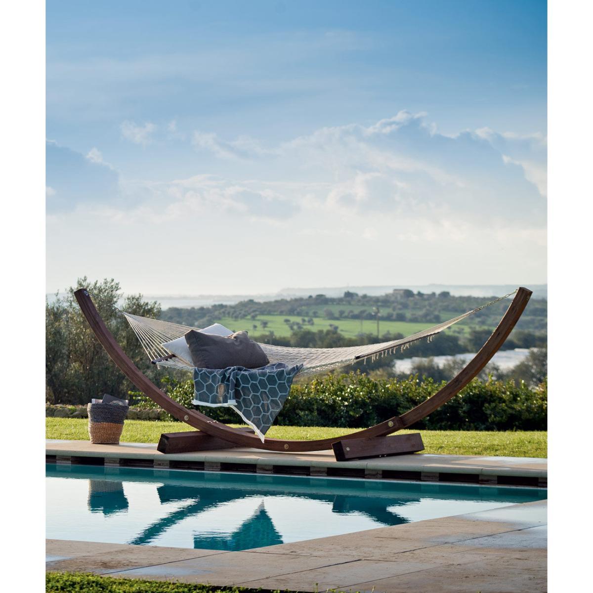 Exceptional piece… Released in 1988, the Amanda hammock has become a timeless icon of Unopiù style. It was born from an idea as simple as it was original: to assemble curved, layered wood with a hand-woven rope net. A cult design object, absolutely essential, the Amanda hammock can boast many imitations around the world. Amanda impresses with its size and the geometric purity of its shape. Solid and refined, the solid wooden structure draws a perfect arc in the air. A construction that’s simple and expressive at the same time! The ultra-minimalist, contemporary design contrasts with the warm appearance of natural wood and rope netting. A construction that’s simple and expressive at the same time. The net is woven by hand in Indonesia using refined, sophisticated traditional techniques. Thanks to its XXL dimensions, the Amanda hammock can comfortably fit two people. Perfect for moments of relaxation as a couple, long summer naps. To improve its comfort, the Amanda hammock comes with its own cushion. The outdoor furniture from Italian brand Unopiù stands out for its careful, considered design, refined finishes and high manufacturing quality. The top-quality materials are worked by mixing skilled craftsmanship and cutting-edge tools. Unopiù represents an Italian lifestyle all over the world in which well-being, design and quality blend together, allowing a unique experience of living outdoors all year round. Thanks to the most advanced technologies, rigorous selection of raw materials and artisanal know-how, Unopiù products can withstand the most extreme weather and climatic conditions.