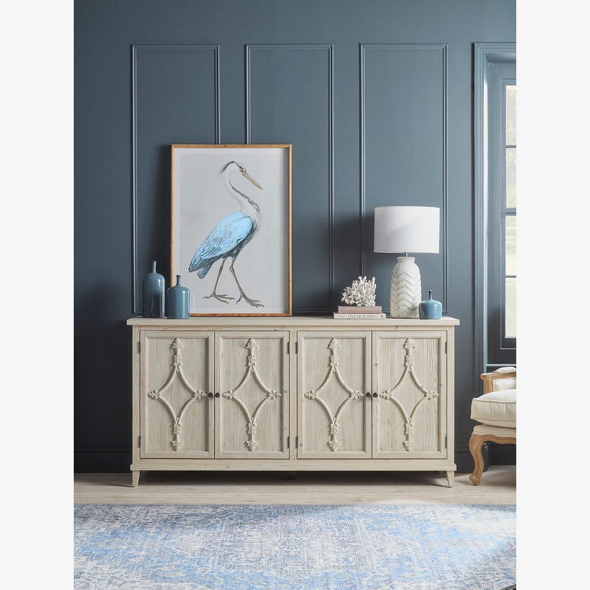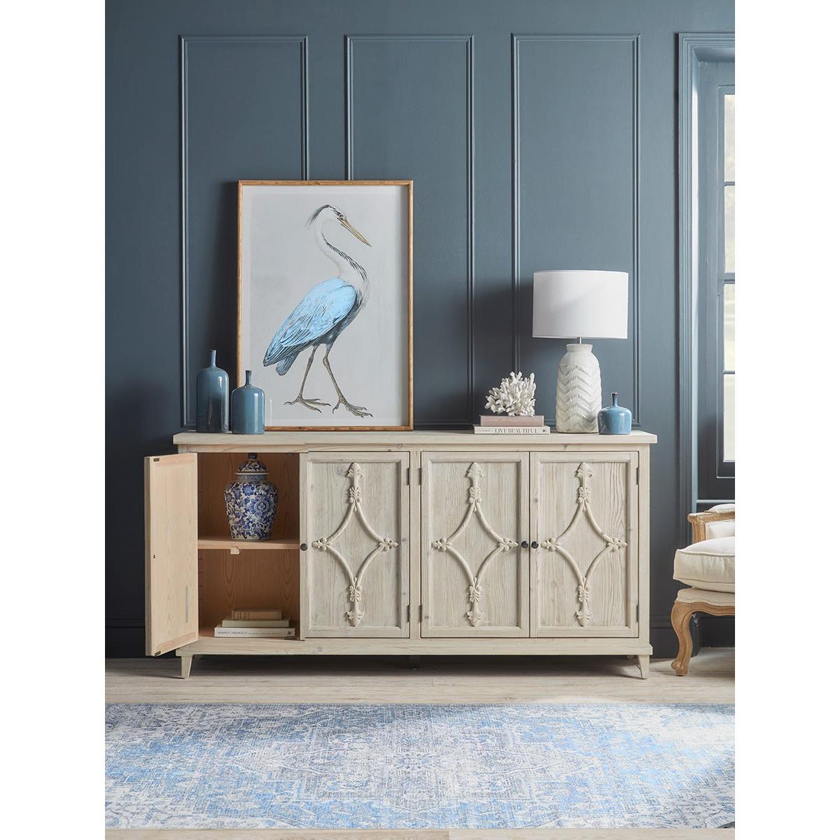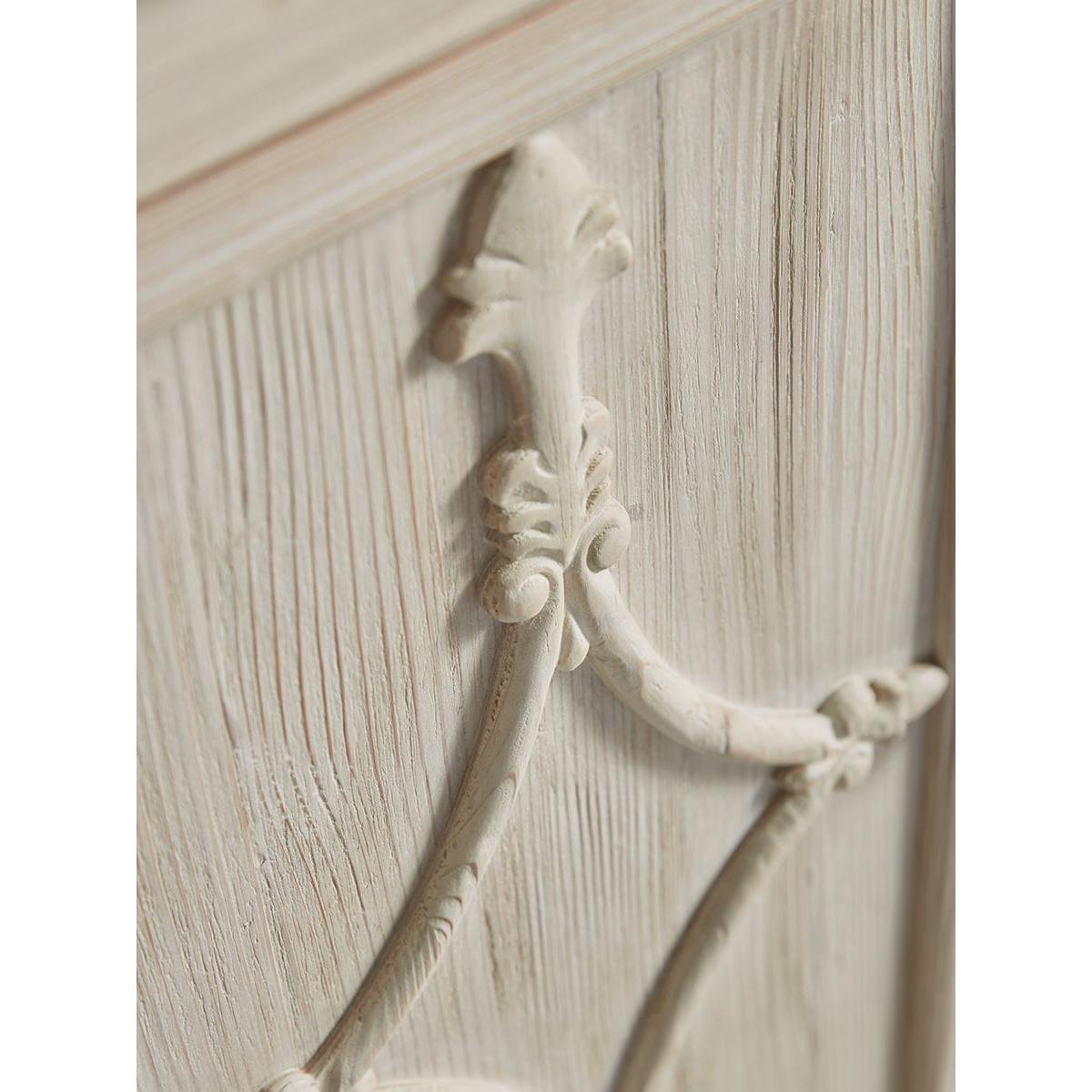 Full of character and charm, our Amandine sideboard is crafted from a light wood, revealing its natural grain for a slightly distressed look. Beautifully carved doors create a romantic look to this sideboard, adding elegance and sense of vintage grandeur to your space. With two cupboards and an adjustable shelf in the interior, this sideboard is perfect for all your storage needs, whilst keeping a neutral and elegant interior scheme.