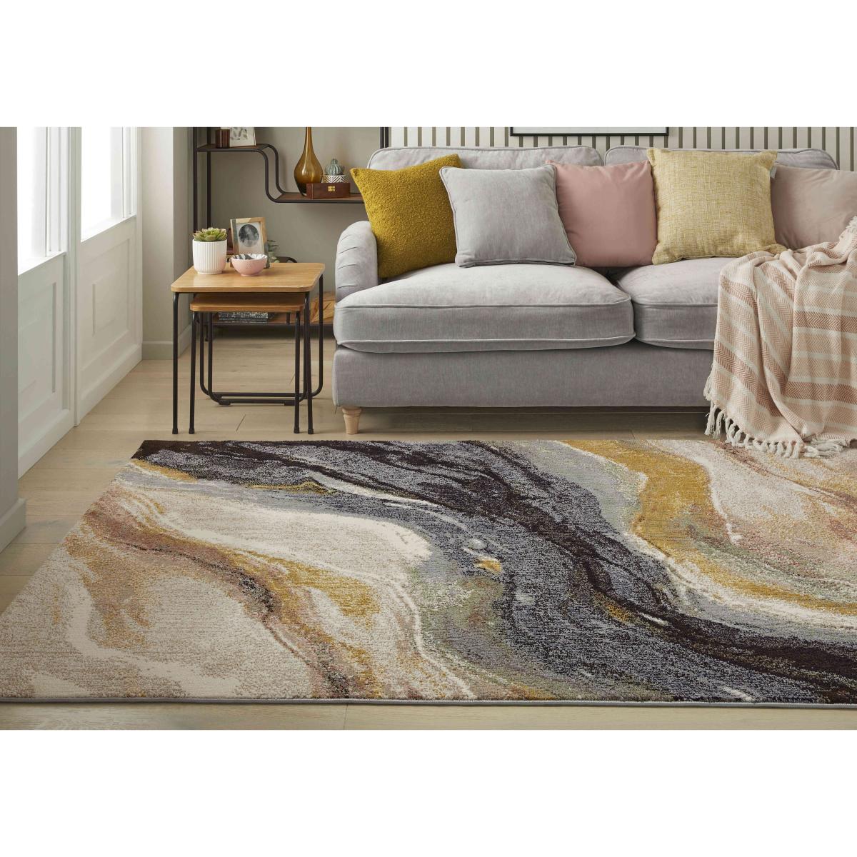 Inspired by natural rock formations, this striking abstract rug brings warmth and style to any space thanks to its velvety-feel texture and contemporary colour palette. Why you'll love it Stunning contemporary rug displays a singular modern aesthetic. Abstract arrangement of layers and swirls inspired by rock formations. Stunning colour palette of charcoal, orange, ivory and sage green. Low velvet-soft pile feels fabulous underfoot. Machine woven for durability. Available in a choice of sizes. Makes a striking statement in any room. This rug is part of the Furniture Village home accessories collection. What you need to know Shallow pile. 100% polypropylene. For indoor use only. Vacuum regularly using a suction vacuum cleaner. Blot stains; do not rub.
