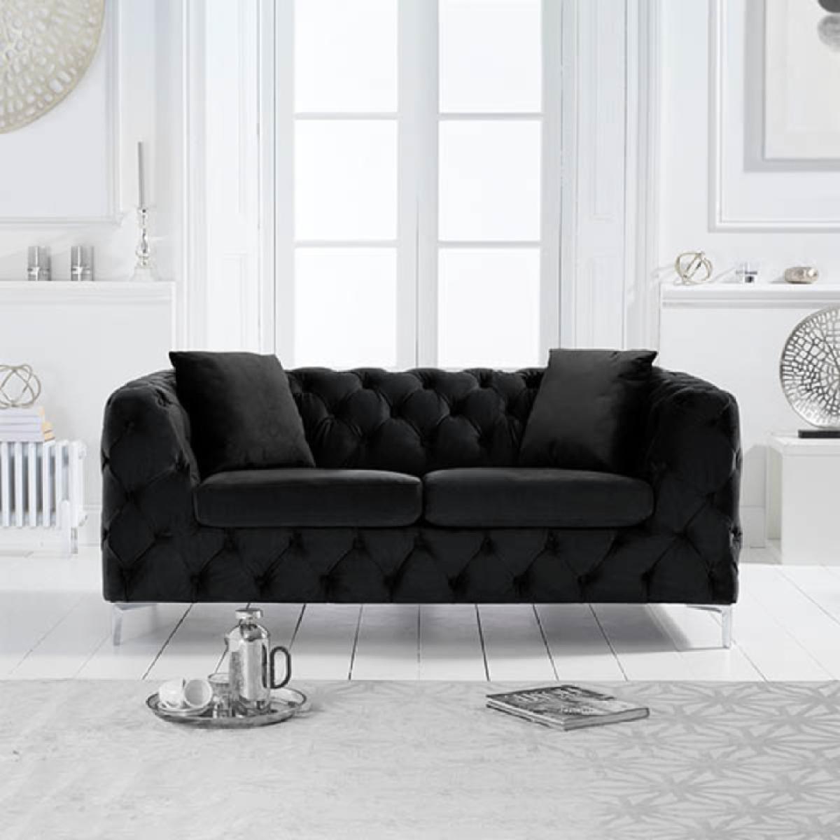 Make a statement with the Amara Black Velvet 2 Seater Sofa. Featuring soft black velvet, the 2 seater sofa features a deep buttoned design throughout and is complete with densely padded seat cushions and sleek metal legs. Black velvet 2 seater sofa with standout design. Soft-touch black velvet is luxe and sophisticated Buttoned design all over for a luxe look. Deep filled seat cushions offer a comfortable sit. Smooth metal legs complete the style*This 2 seater sofa comes with 2 free scatter cushions. Additional Measurements:Seat Depth:60cm. Seat Width:120cm. Seat Height:10cm Armrest Width:20cm Backrest Height:30cm Floor to Seat Height:45cm Leg Thickness:2cm