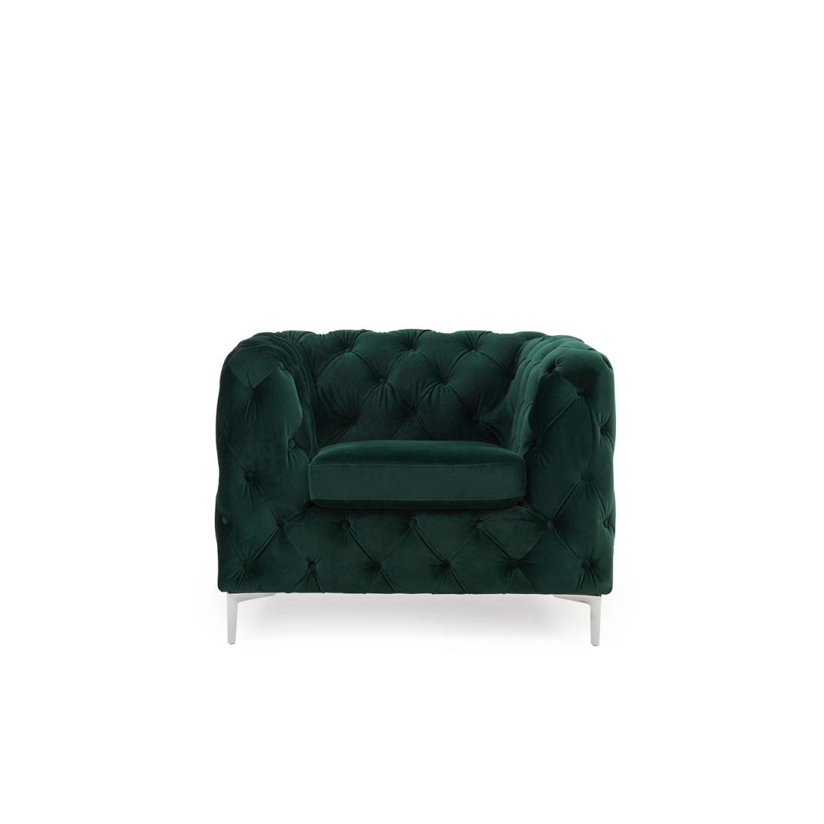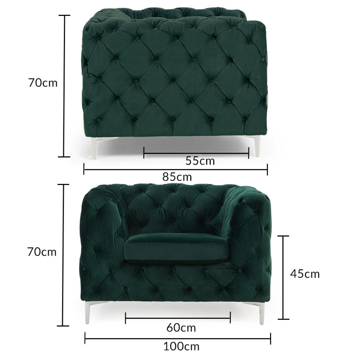 Luxury design and eye-catching colour combine to make the Amara Green Plush Armchair a statement piece for any interior. Upholstered in sumptuously soft green plush fabric, the armchair features high armrests and a tub-style design. Boasting a stunning deep-buttoned style and resilient metal feet, the luxe armchair is complete with a contrasting foam-filled seat cushion for a comfortable sit. The Amara Plush Armchair is also available in blue or grey and is supplied with 1 free scatter cushion. Additional Measurements:Seat Depth:60cm. Seat Width:60cm Seat Height:10cm Armrest Width:20cm Backrest Height:30cm Floor to Seat Height:45cm Leg Thickness:2cm