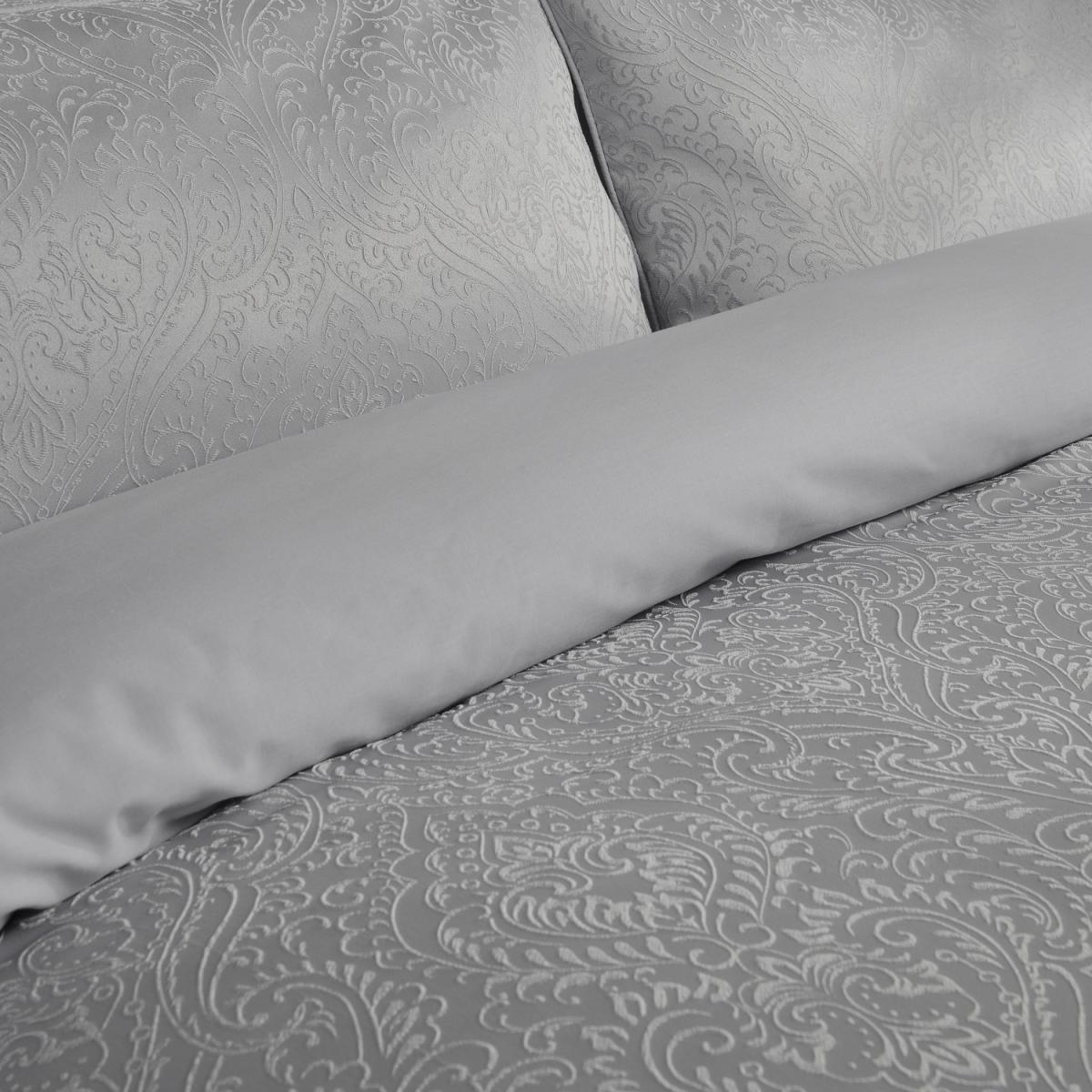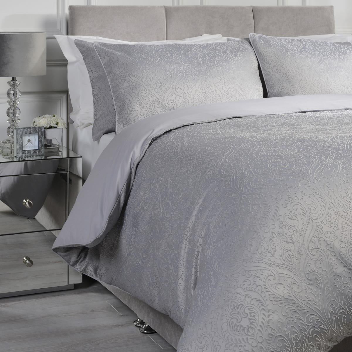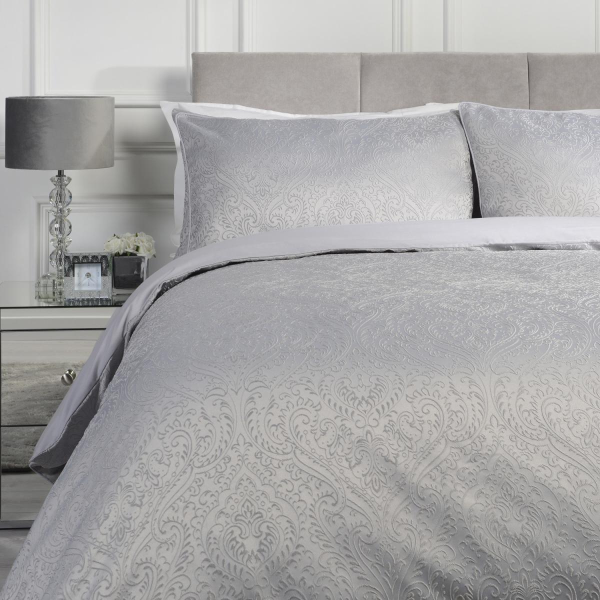 Crafted from lustrous silver fabric and overlaid with a beautifully embossed damask, our Amara Jacquard Duvet Cover and Pillowcase Set emanates stately glamour. Its matching pillowcases showcase the same breathtaking pattern with piped edges, lending your bedroom a lavish and luxurious feel.