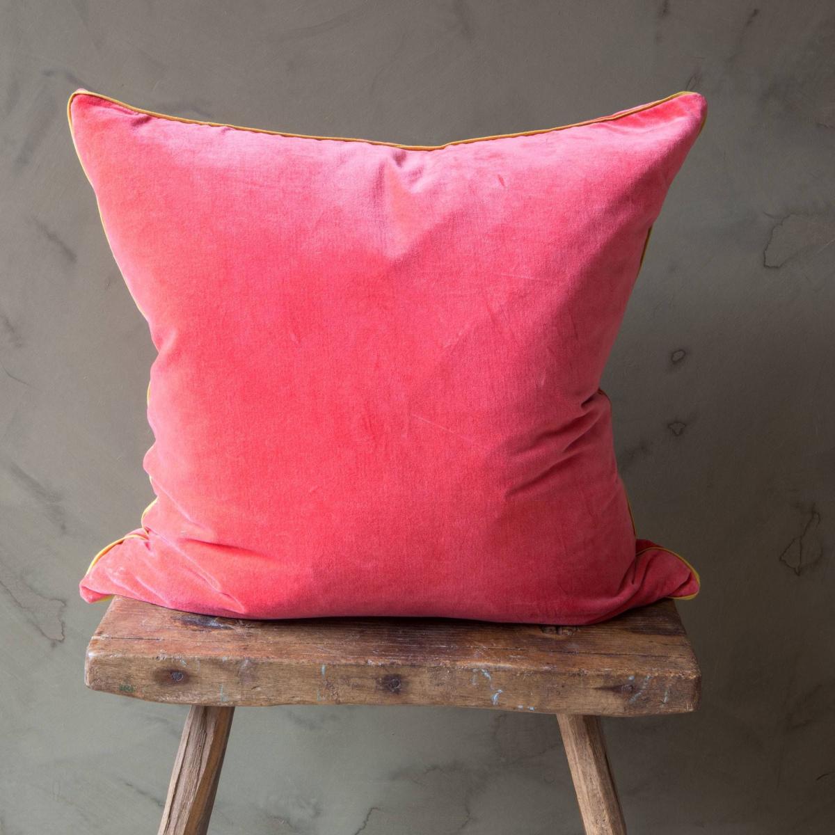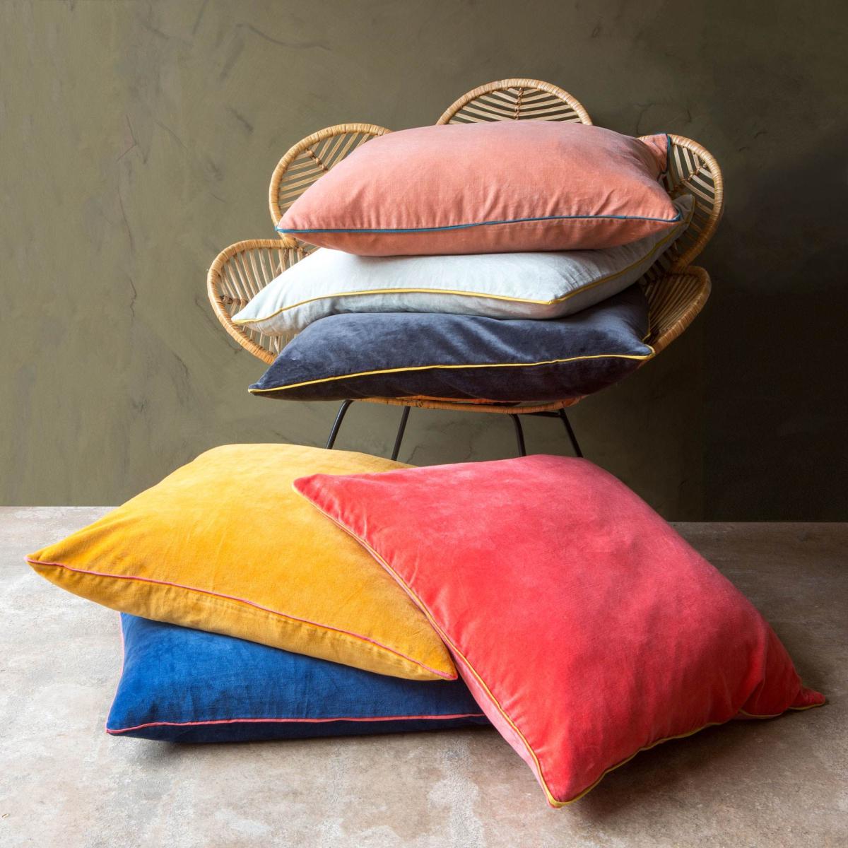 With sumptuous textures and vibrant colours, our collection large Amara cushions are handmade from luxuriously soft cotton velvet with an eye-catching flat fabric trim in contrasting colourways. Bright and bold, these cushions are the perfect finishing touch to instantly brighten up your space.