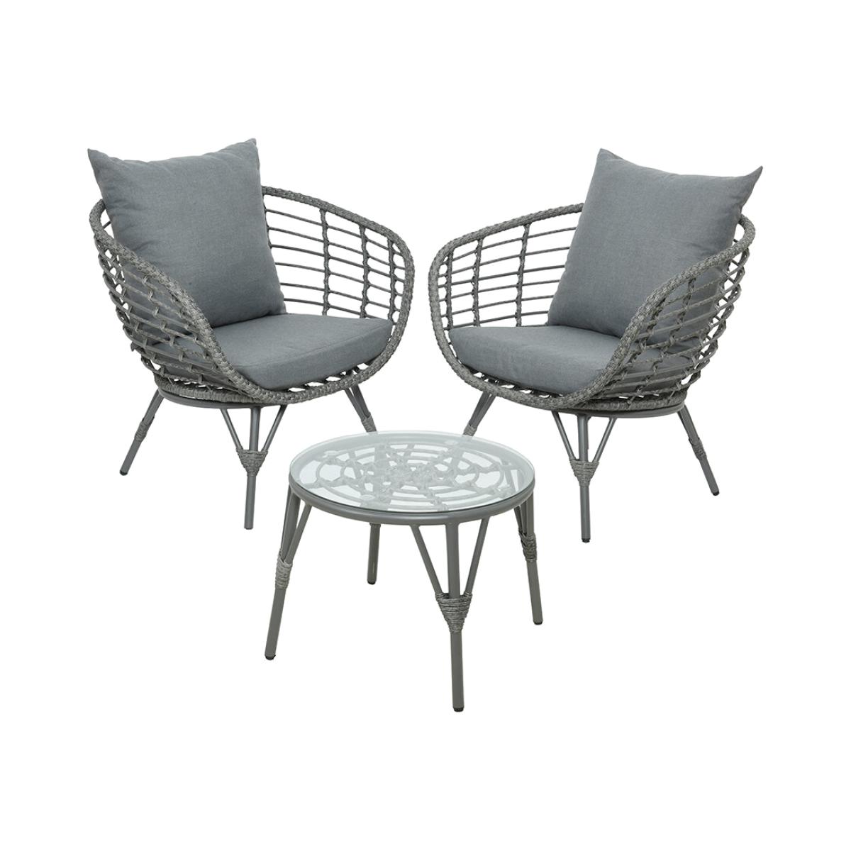 Make the most of your outdoor space with this garden set from AMARA Outdoors. Perfect for enjoying those warm summer evenings, this stylish set includes two chairs and a small table. Key features: * Material: PE wicker, iron, polyester * Dimensions: * 1x table Ø55xH42cm * 2x chairs L86xW80xH83cm * Grey colour * Seats with padded cushions * Seat height: 38cm * Max weight: 120kg * Water repellent