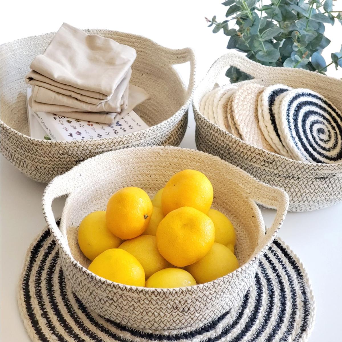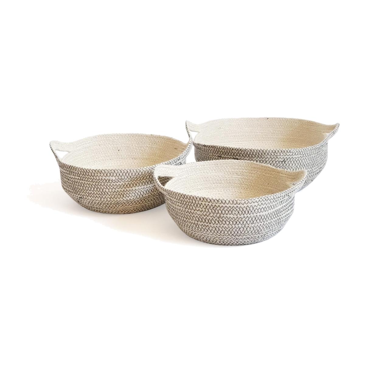 Say Hello to our Must-have Storage Trio. Handwoven and color stitched jute baskets are simple, yet stunning designs. Each product is designed and curated by Korissa, sustainably handmade by Fair Trade artisans in Bangladesh. Material: Jute Color: Off-white with Black Stitch Due to the handcrafted nature, slight variation will occur in design, color and size.