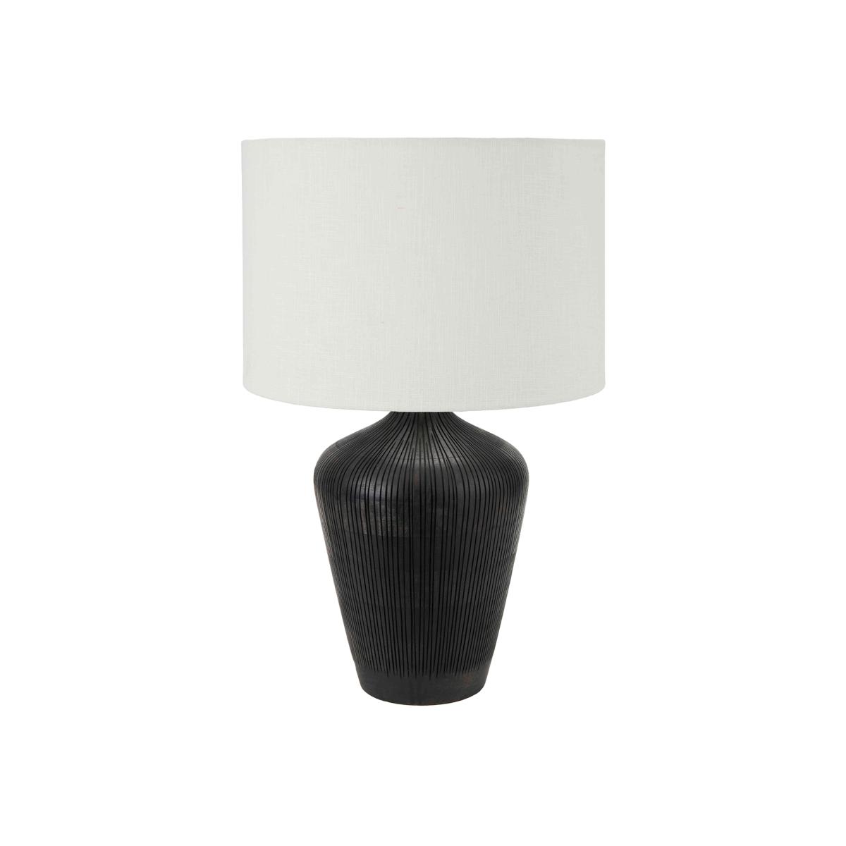 This stunning table lamp combines soft curves and a striking monochrome design to create a real style statement. Perfect for lamp tables and side tables. Why you'll love it Strikingly beautiful design. On-trend curved base. Elegant white linen shade. Only available online. This table lamp is part of the Furniture Village lighting collection. What you need to know Wooden base. Linen shade. Requires 1 x E27 GLS or 10-12W LED bulb (not included). Dimensions Height: 63 cm (25 in). Diameter: 40 cm (16 in).
