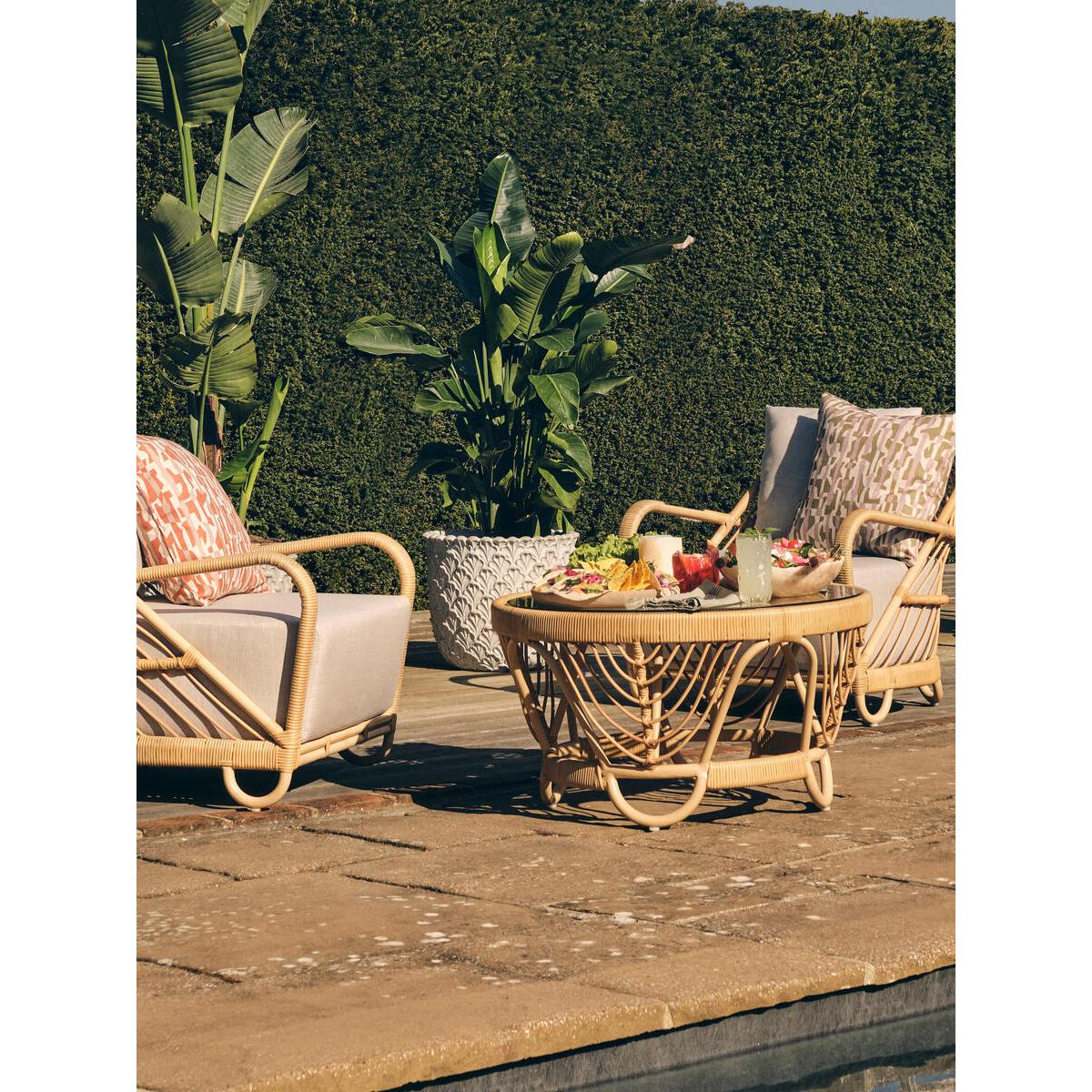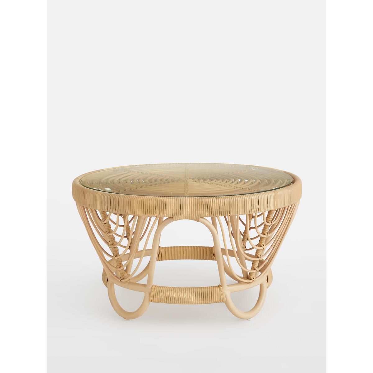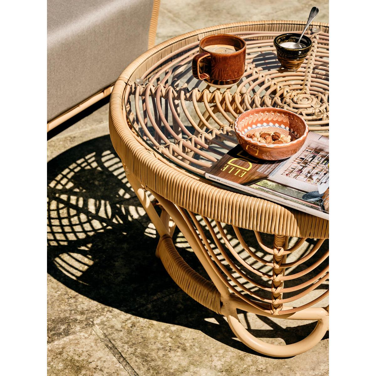 Inspired by Soho Beach House Canouan, our Amaya coffee table isa statement piece that's ideal for outdoor dining. It has asculptural metal frame with weatherproof rattan-style weaving and arounded glass top. Pair with the matching outdoor chairs tocomplete the Beach House-inspired aesthetic. Rattan-style coffee table. Curved metal frame. Weather-resistant. Round glass top. Pair with the Amaya Chairs. Cover when not in use. Inspired by Soho Beach House Canouan.