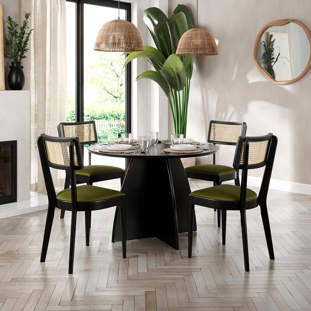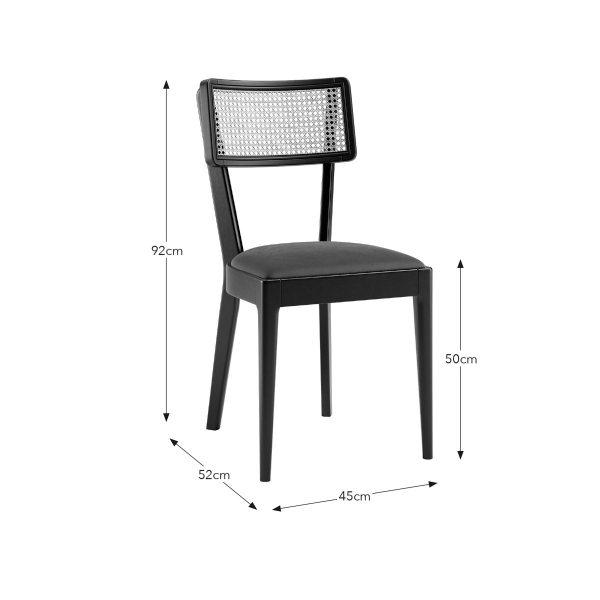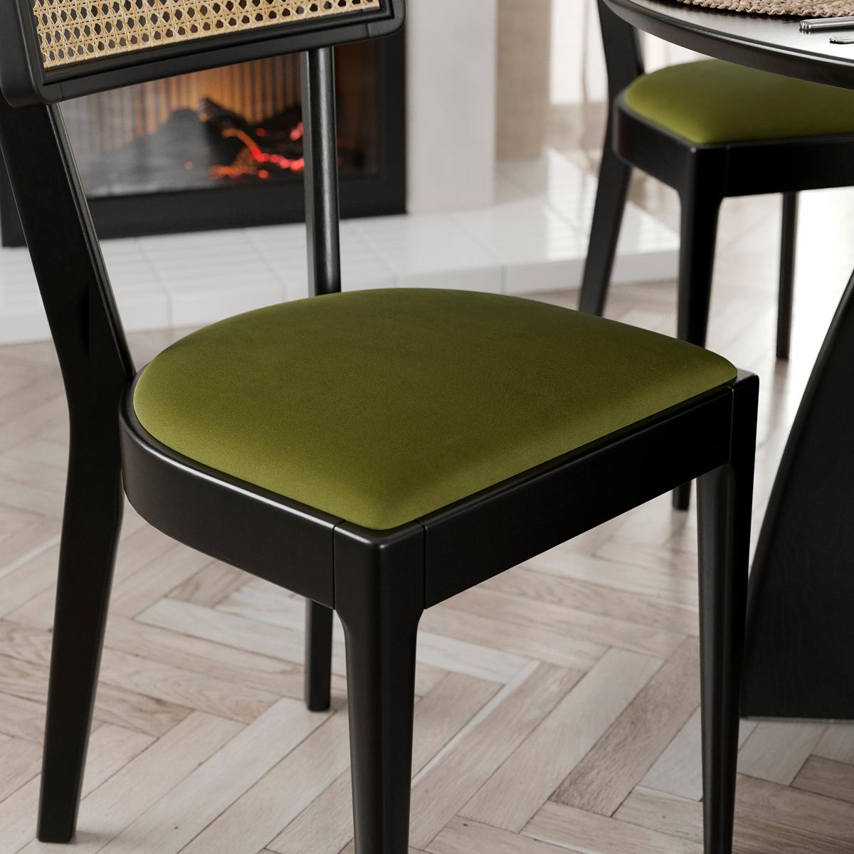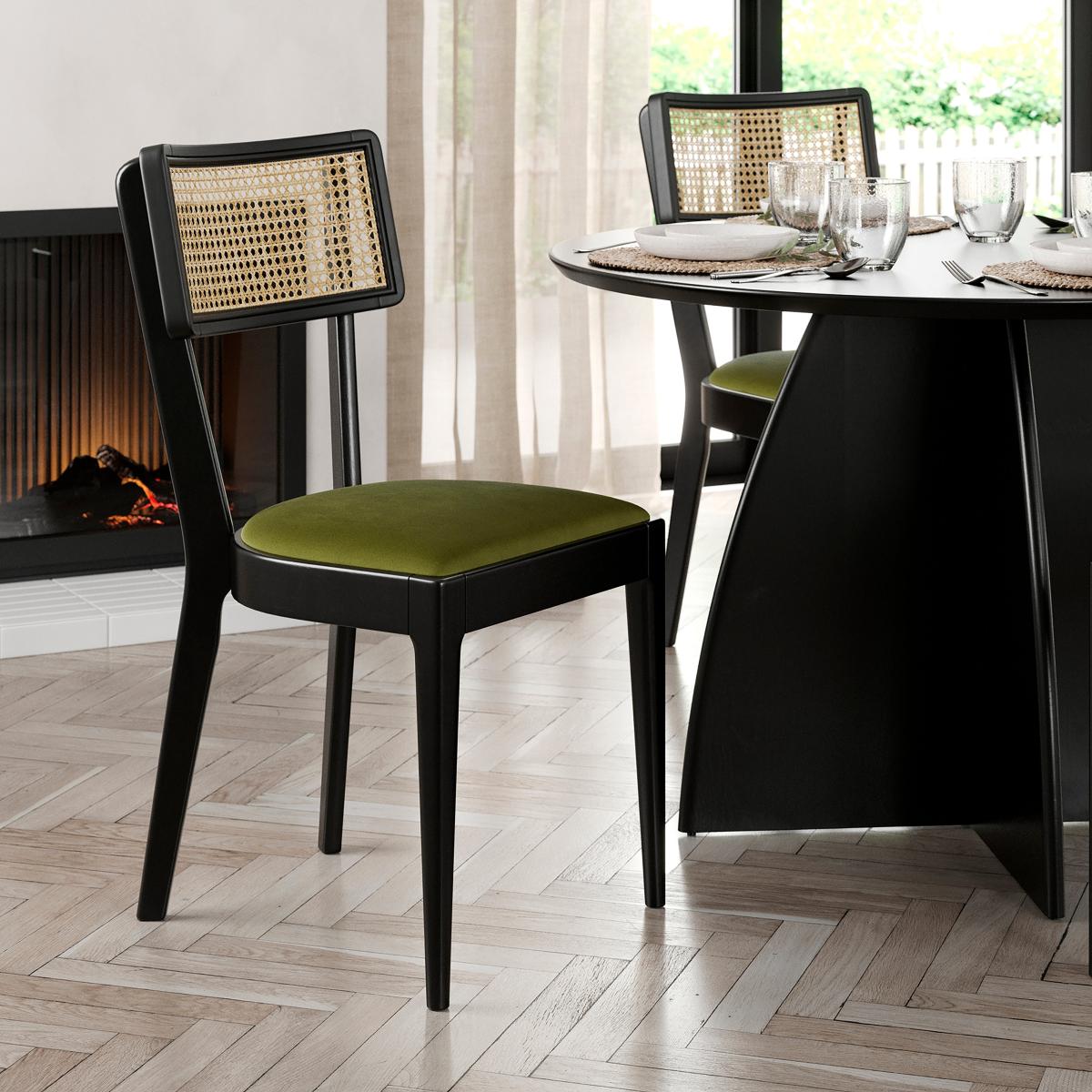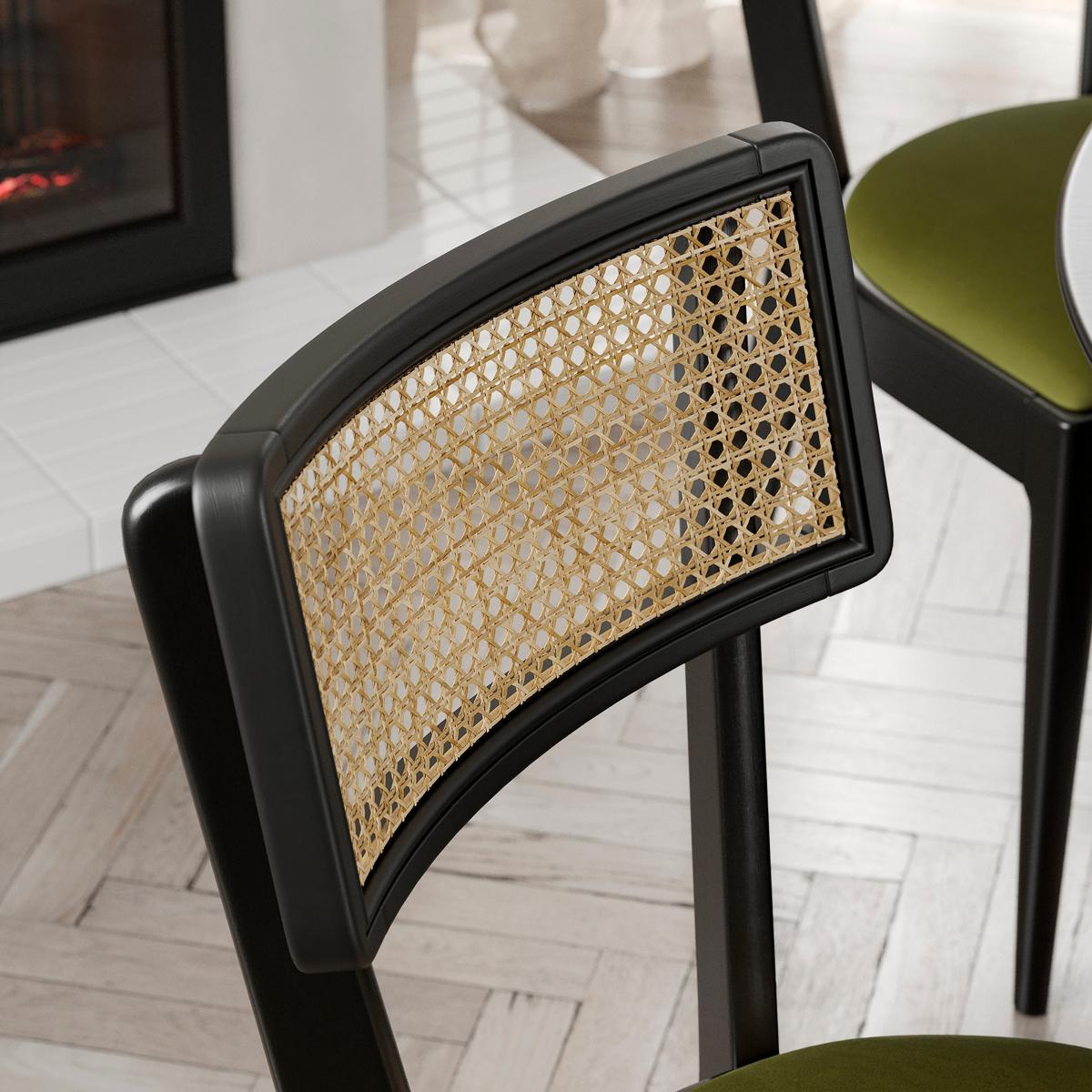 This dining chair boasts a striking cane back detail that adds a touch of global elegance to your dining space. The exquisite cane work reflects skilled craftsmanship, creating a unique and captivating visual appeal. The seat pad, luxuriously upholstered in plush velvet, provides unparalleled comfort during meals, encouraging you to linger at the table long after the dishes have been cleared. The velvet's opulent texture and rich color enhance the chair's overall aesthetic, adding a sense of refinement to your dining area. The combination of the intricate cane back and sumptuous velvet upholstery makes this dining chair a statement piece that effortlessly marries form and function.
