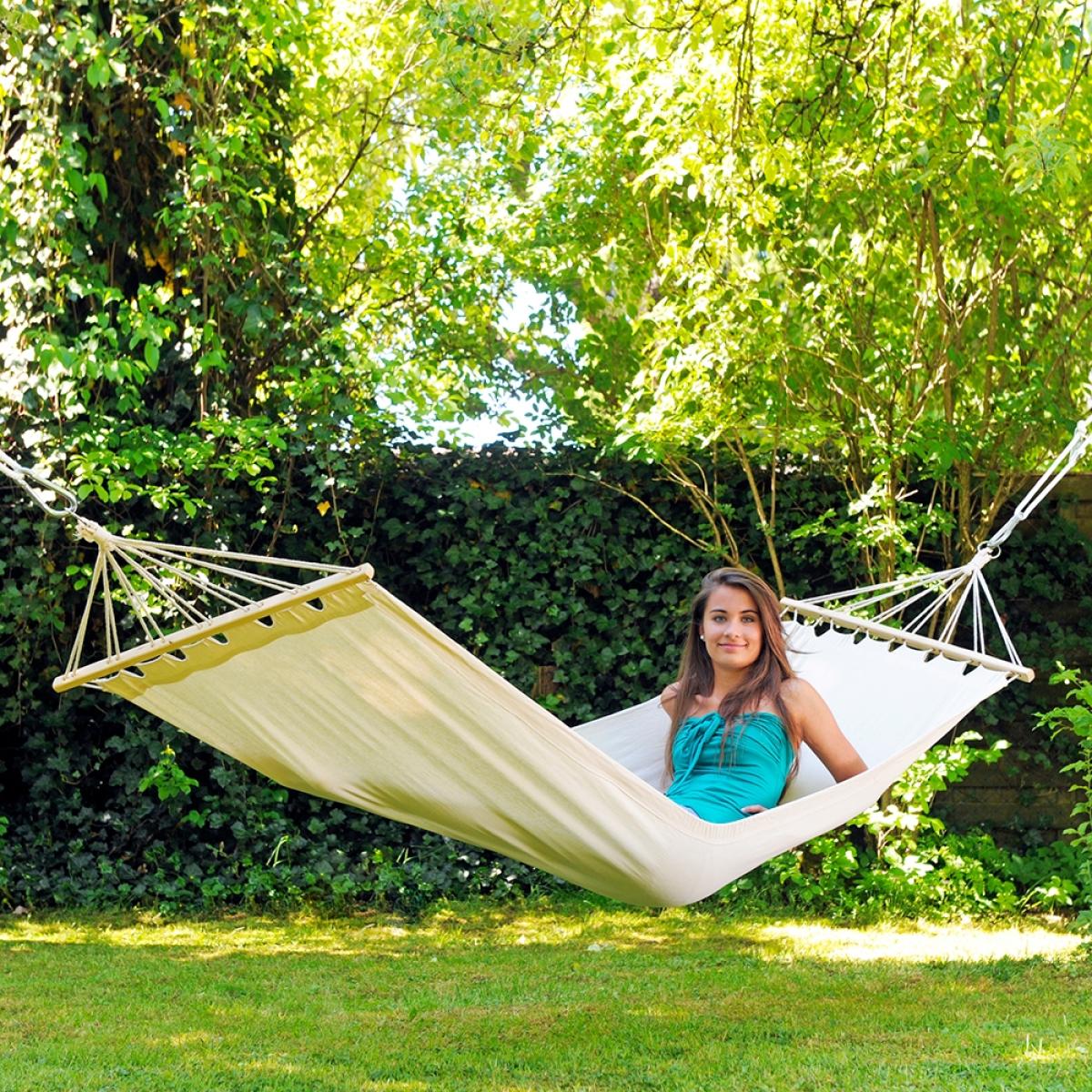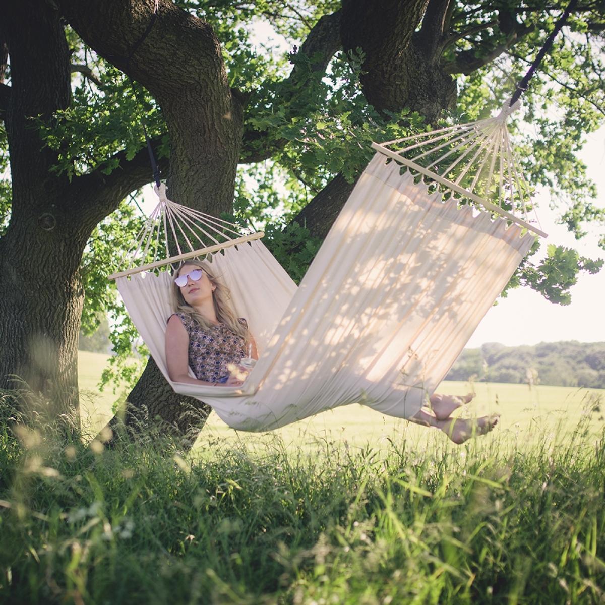 Unwind with the Amazonas Tobago Hammock. Including a handy storage bag it's the perfect outdoor accessory for camping trips, days out at the beach or just hanging out in the garden. Simply secure between 2 trees, use the wall mounted accessories available or pair with the matching Apollo stand and enjoy relaxing outside. Featuring spreader bars at either end, the width of your hammock bed is maximised making it ideal for sunbathing! No more getting tangled up in endless fabric. Made from weatherproof and UV resistant materials, you can leave your hammock outside all year round without worry! So go grab those sunnies and soak up the sun in pure comfort!.