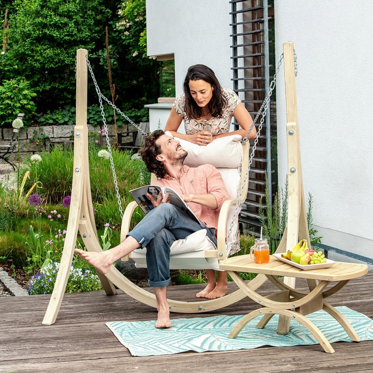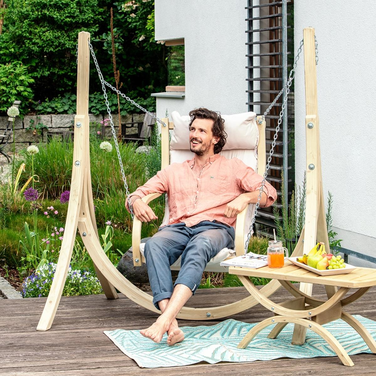 Available in a choice of colours, the Amazonas Wooden Hanging Fat Chair would be a gorgeous addition to your garden. Hang your swing chair from wall mounted fixtures or pair with the sturdy Taurus stand and place your seat in any sunny spot. Handmade with a unique wooden frame, featuring arm rests and a curved seat back; sink into the plush cushions, relax and completely lose yourself. Designed to be weatherpoof; your hanging chair can remain outside come rain or shine. Easy to maintain with a machine washable cover, it's not just easy on the eye, it's practical too. It's sure to be loved by all of the family. So one hanging chair might not be enough!.