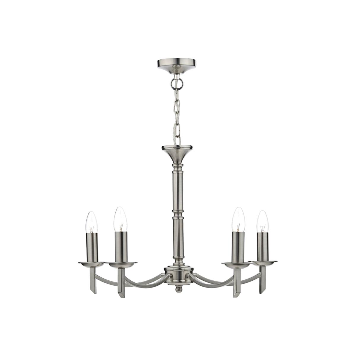 Traditional chandelier boasting a satin chrome finish. An elegant addition to your home, the Ambassador Chandelier is a beautiful fitting. Finished in satin chrome throughout, the chandelier boasts curved arms and a ribbed central stem. Height adjustable at the point of installation, it's dual mount makes it adaptable for use as a semi-flush fitting rather than a dropped pendant, if desired. It also comes complete with 2 sets of candle sleeves, allowing the fitting to be used with or without candle shades. It's design makes it ideal for use in homes boasting traditional and modern home decor, and is set to look great in dining rooms, living rooms and hallways. Pagazzi recommends using our E14 4w LED Light Bulbs for a crisp, clean light.