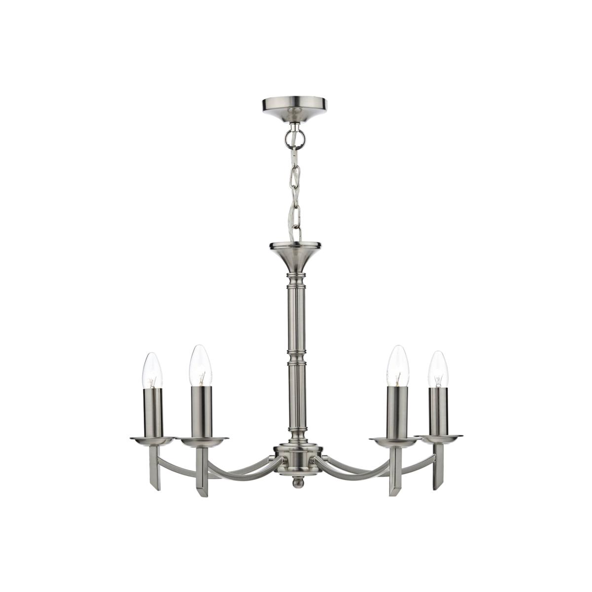 Traditional chandelier boasting a satin chrome finish. An elegant addition to your home, the Ambassador Chandelier is a beautiful fitting. Finished in satin chrome throughout, the chandelier boasts curved arms and a ribbed central stem. Height adjustable at the point of installation, it's dual mount makes it adaptable for use as a semi-flush fitting rather than a dropped pendant, if desired. It also comes complete with 2 sets of candle sleeves, allowing the fitting to be used with or without candle shades. It's design makes it ideal for use in homes boasting traditional and modern home decor, and is set to look great in dining rooms, living rooms and hallways. Pagazzi recommends using our E14 4w LED Light Bulbs for a crisp, clean light. Traditional chandelier boasting a satin chrome finish. An elegant addition to your home, the Ambassador Chandelier is a beautiful fitting. Finished in satin chrome throughout, the chandelier boasts curved arms and a ribbed central stem. Height adjustable at the point of installation, it's dual mount makes it adaptable for use as a semi-flush fitting rather than a dropped pendant, if desired. It also comes complete with 2 sets of candle sleeves, allowing the fitting to be used with or without candle shades. It's design makes it ideal for use in homes boasting traditional and modern home decor, and is set to look great in dining rooms, living rooms and hallways. Pagazzi recommends using our E14 4w LED Light Bulbs for a crisp, clean light.