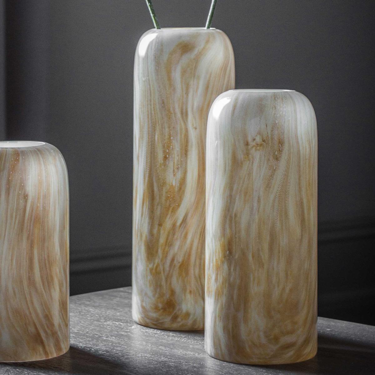 Add a touch of refinement to your space with the Amber Marbled Vase. Distinctive marbled veins run vertically and finish with a dome shaped top that adds a timeless elegance to this piece. Place on a shelving unit, table or sideboard for a modern freshen-up in your home.