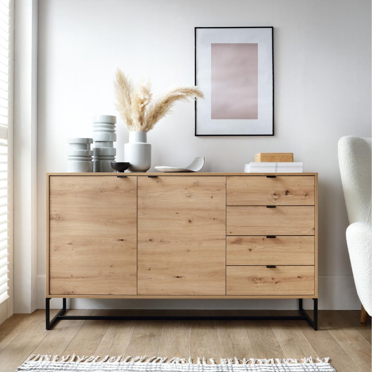 I’m a big fan of this wood sideboard for its clean-lined profile and warm oak-effect veneer balanced on slim black metal legs. Its neutral tone and subtle grain make it versatile enough for Scandi, contemporary or even industrial-leaning schemes, while providing generous hidden storage. Styling-wise, mix a couple of low ceramic vases with dried grasses on one side and a stack of art books on the other, leaving a little negative space in the middle. Add a simple framed print above to tie things together, and consider a soft runner or jute rug in front to ground the piece.