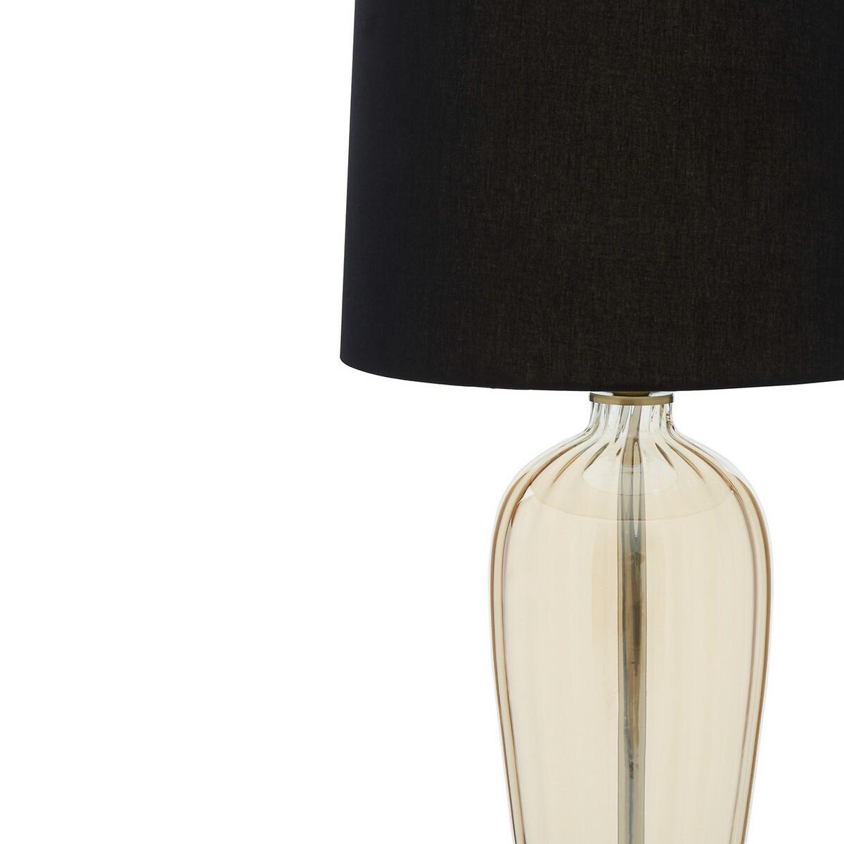 I love this lamp because of its versatile yet sophisticated look. The tall glass base with its subtle amber hue adds warmth and elegance, while the black shade keeps it modern and understated. It works particularly well in both contemporary and transitional interiors, offering a chic centrepiece on side tables or console units. For styling tips, consider pairing it with neutral or muted colour schemes to let the lamp stand out, or add metallic accents around it to enhance its luxe vibe. Its shape and colour make it a great option for both living rooms and bedrooms, providing both ambient light and a touch of visual interest.