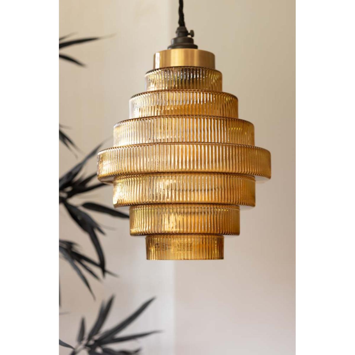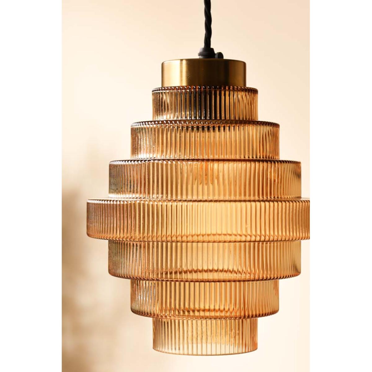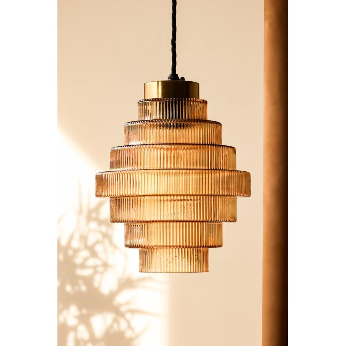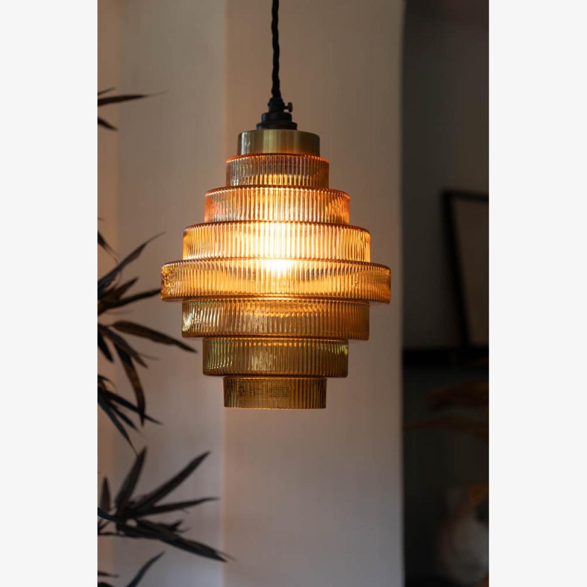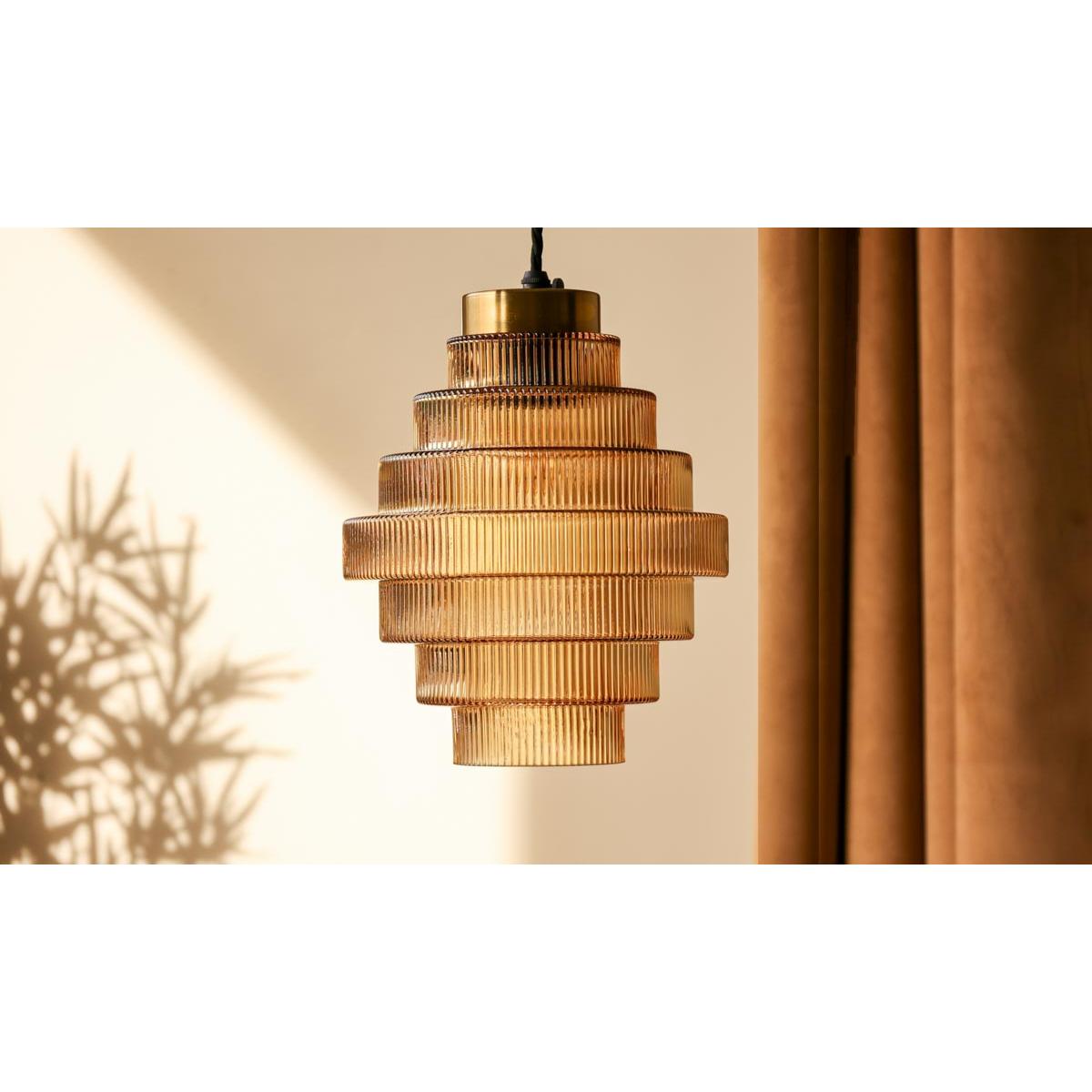 About The Amber Tiered Glass Easyfit Ceiling Shade Designed to help transform standard pendant sets, the Amber Tiered Glass Easyfit Ceiling Shade ensures a fabulous lighting feature in any room of the house. Measuring H24.5cm x W22cm x D22cm, the glass lamp shade pairs tiered amber glass with a chic gold ring that is designed to rest on top of the shade for the perfect final touch. Why We Think You Will Love The Amber Lamp Shade Finding a fabulous pendant light for every room of the house is not always an option, especially if you rent your home and are limited to what is already set up in the space. As a result, the Amber Tiered Glass Easyfit Ceiling Shade is the ideal solution. Designed to sit on top of existing basic pendant sets, the glass lampshade recreates the statement chandelier on a smaller scale and without the hassle of having to involve an electrician. From the on-trend fluted glass detailing to the warm amber colour palette, we adore everything about this versatile ceiling light shade and know you will too! How To Style The Amber Tiered Glass Ceiling Lamp Shade The beauty of the easy-fit design is that the Amber Tiered Glass Easyfit Ceiling Shade can be introduced to any room of the home where a basic pendant is already in place. One of our favourite spots for this amazing lighting accessory has to be the bedroom as the glass pendant lamp shade is guaranteed to instantly transform the room. However, the styling options are endless and the Amber Tiered Glass Ceiling Lamp Shades will also look gorgeous anywhere, from the kitchen to the bathroom or hallway!