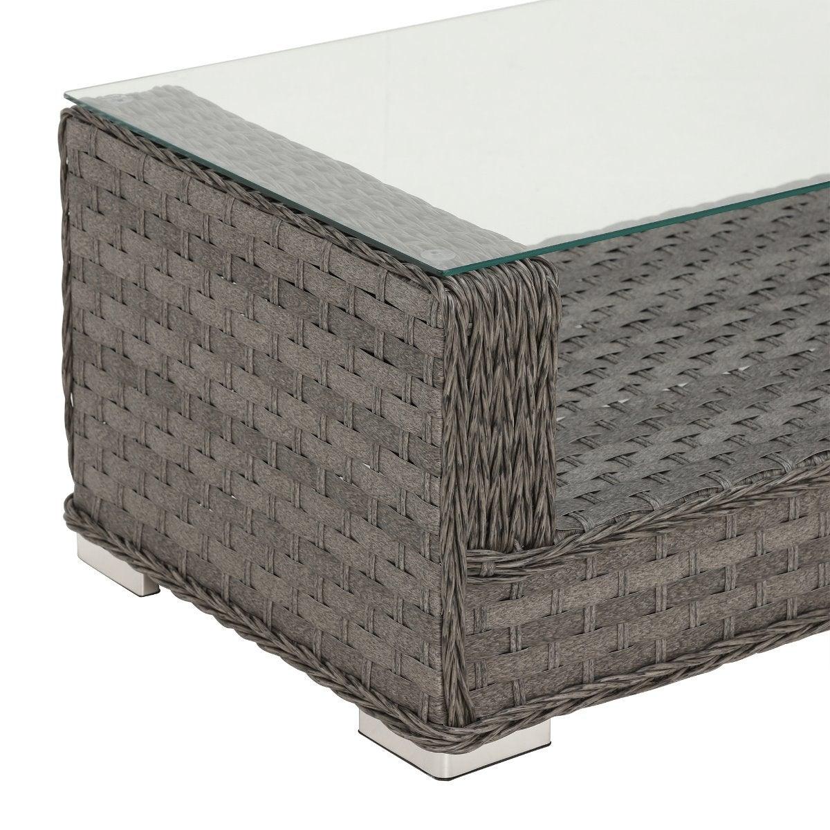 Design. A contemporary suite that brings an elegant edge to traditional rattan furniture, the Amberley garden sofa set is comprised of a two-seater sofa, two matching armchairs and a glass top table. Perfect for gathering around for a game of cards, settling into conversation under the sun or enjoying drinks into the night, you’re guaranteed a luxuriously comfortable experience. Simple in design yet full of quality, the seats feature ample cushioning, wide armrests and smooth weave surfaces. Easy to wipe clean and with plenty of surface space for beverages and nibbles, the table looks great as it is or styled up with accessories.