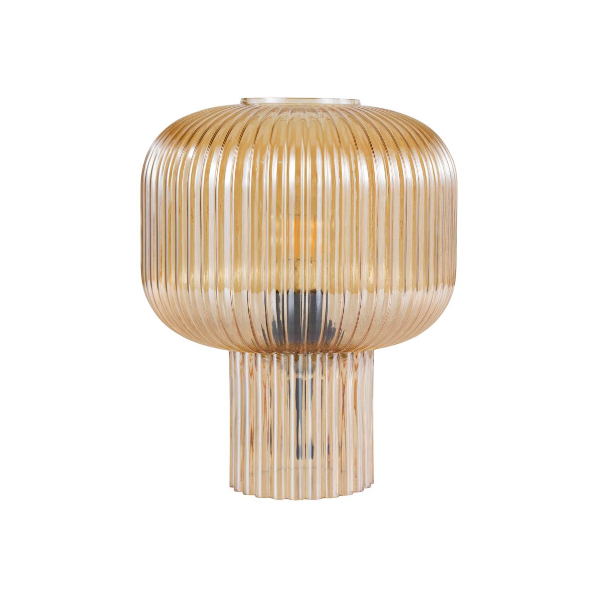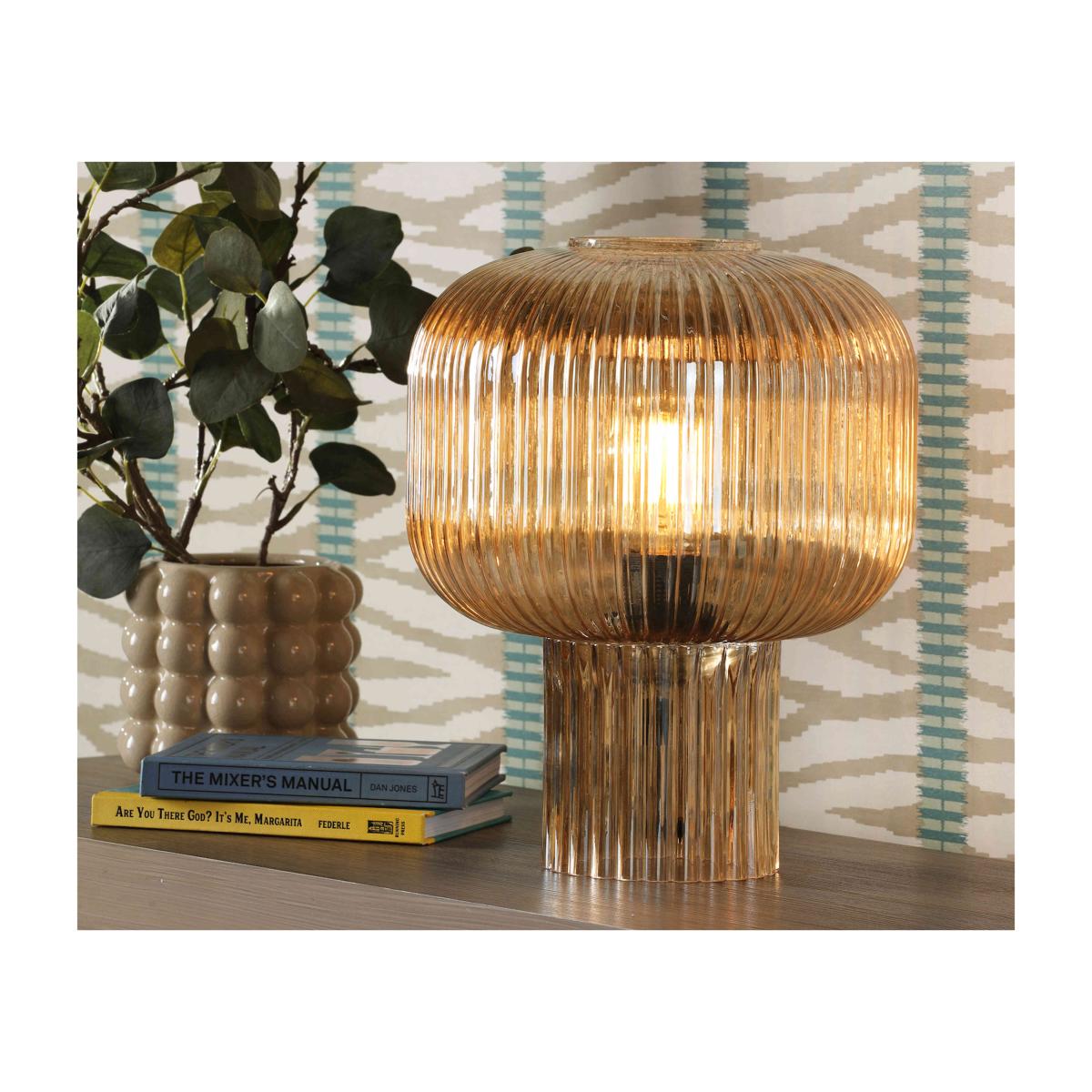 With a touch of retro flair, this amber glass table lamp is just what you need to bring some light and warmth to your home. Why you'll love it With a warm amber hue, this eye-catching glass lamp is ultra cosy. Beautiful ribbed design runs seamlessly from its shade to its base. Creates an inviting feeling in your living room, bedroom, or home office. What you need to know Made from glass. 1.4 metre cable with an inline rocker switch. Takes 1 x ES GLS bulb, max. 60. W. Dust with a soft, lint-free cloth. Dimensions Height: 32 cm (13 inches) Width: 25 cm (10 inches) Depth: 25 cm (10 inches) Weight: 1.6 kg