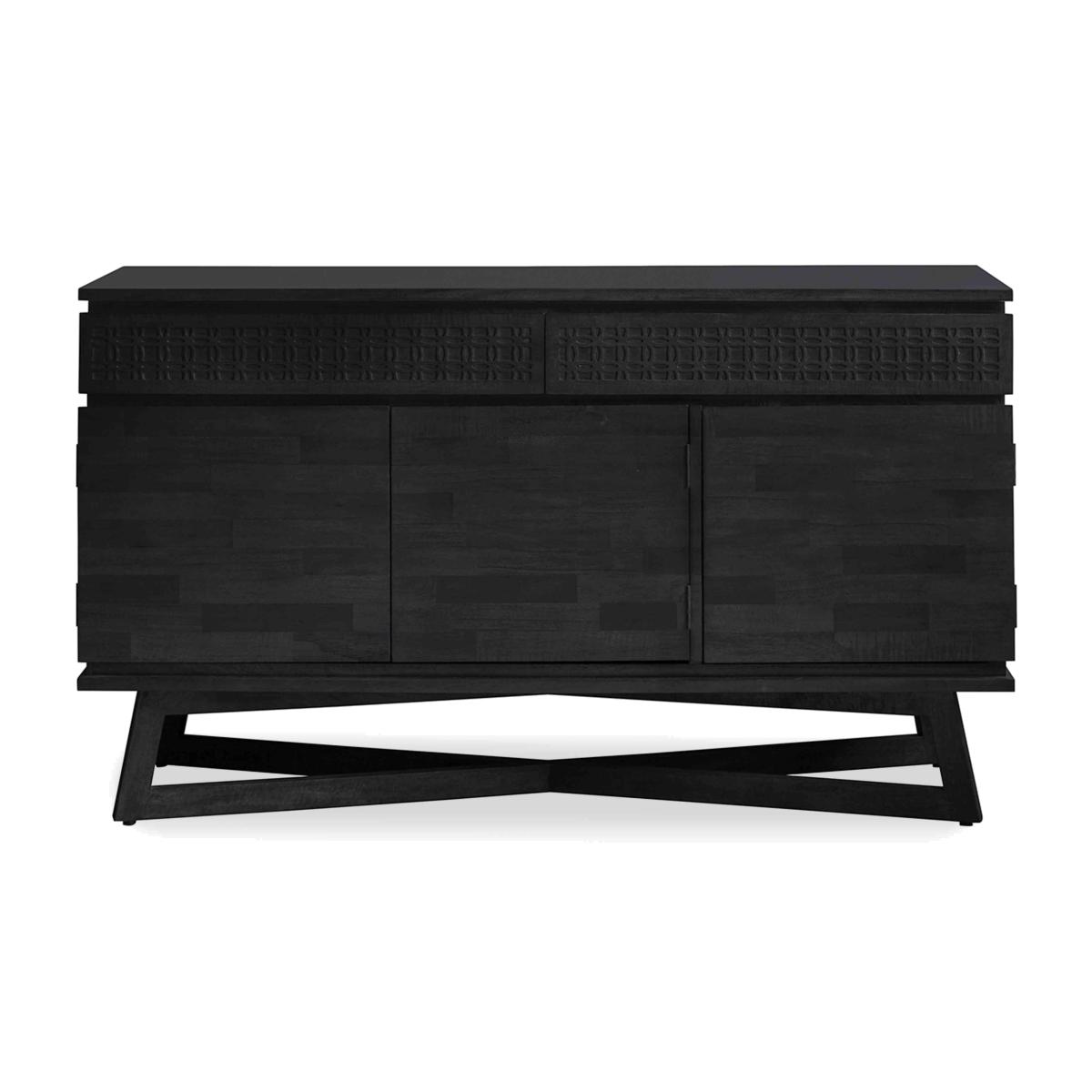 Carefully crafted with teak, mahogany, mindi ash and mango wood veneers and embellished with intricate decorative friezes, the pieces in the Ambre range bring to mind vintage furniture from far flung places. This well-curated collection includes both bedroom and living room furniture, allowing you to enjoy its beautiful patina, matt black finish, roomy storage spaces and authentic style in more than one room. Bring a unique look to your bedroom with the range’s four-poster bed and open wardrobe, and stylish practicality to your dining room in the form of a charming drinks cabinet as well as occasional tables. With a one-of-a-kind feel, vintage rustic flair and intricately patterned details, this lovely three-door sideboard suits all kinds of spaces. Why you'll love it Beautifully detailed with a gently rustic finish that suits eclectic spaces. Inspired by authentic vintage Indian furniture. Drawer fronts feature an intricately patterned fretwork frieze in mango wood. Finished in teak, mahogany, mindi ash and mango wood veneers. Such a wide array of woodgrains creates a rich and varied pattern. Matt black finish. Effortlessly charming and coordinates well with both modern and classic pieces. This 3-door sideboard is part of the Ambre range. What you need to know 3 drawers and 2 cupboards. 1 single-door cupboard and 1 double-door cupboard, each with a shelf. We recommend using coasters and placemats at all times. Our Ambre living room range includes a wide choice of occasional furniture and tables. Love the look? Be sure to browse our Ambre bedroom furniture collection. WARNING!