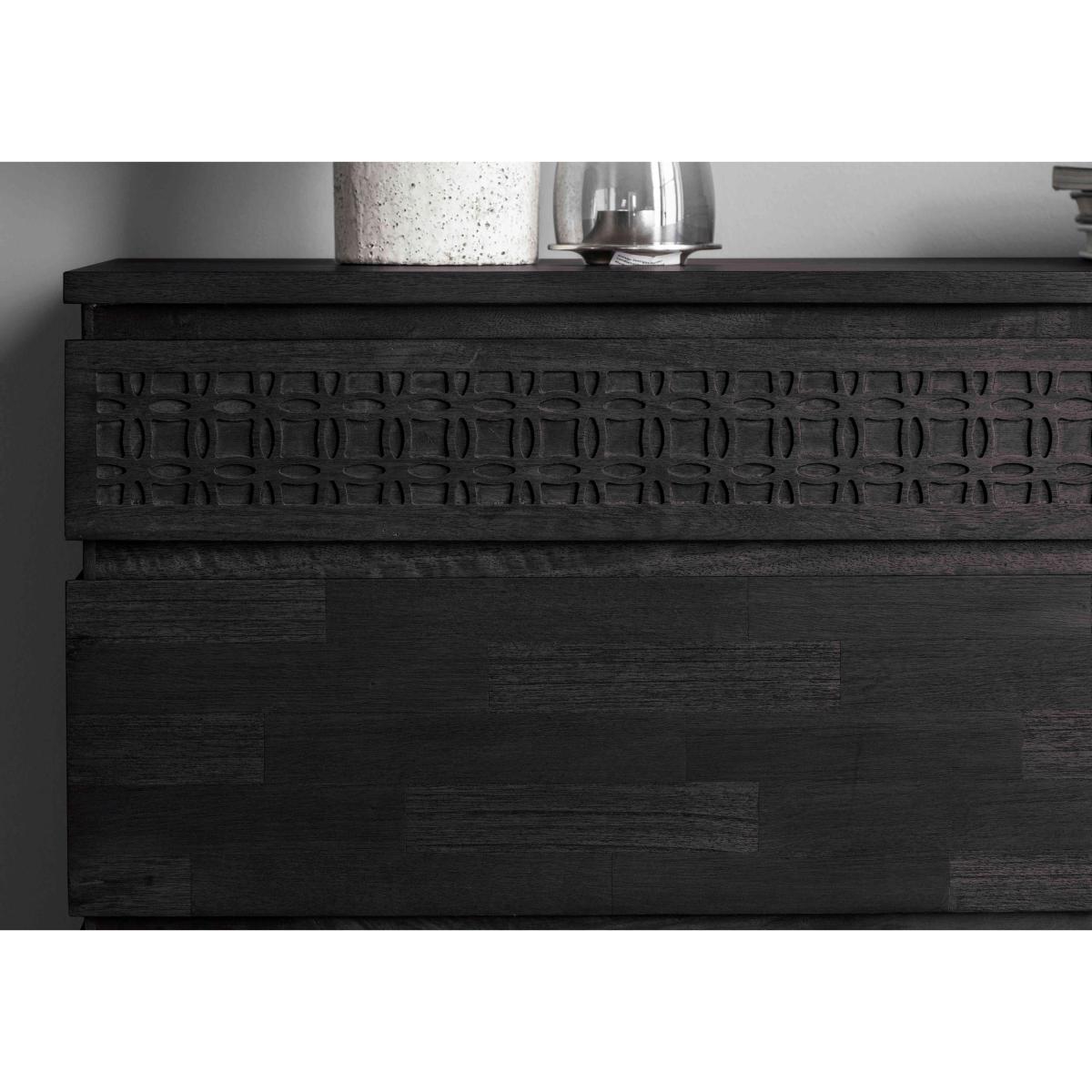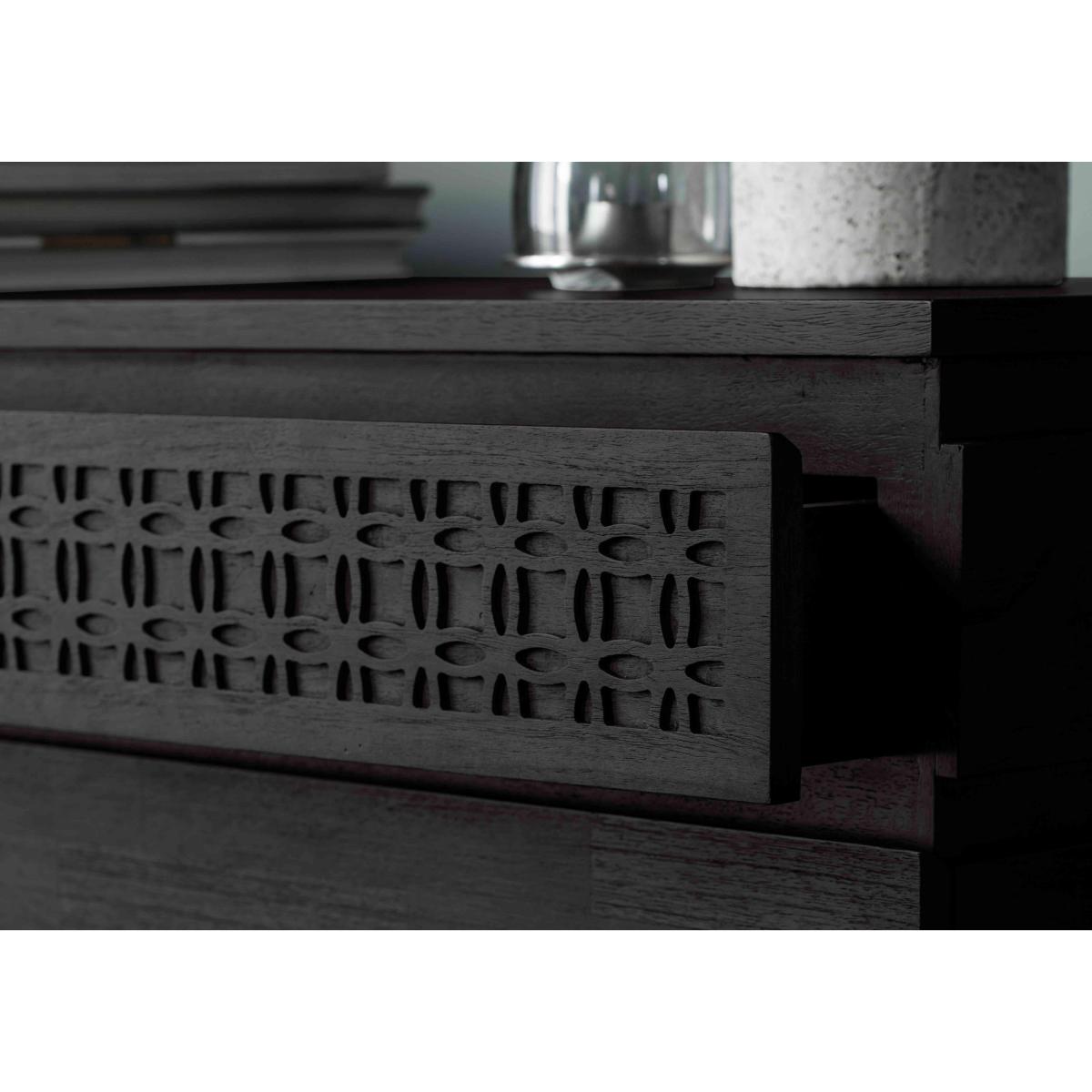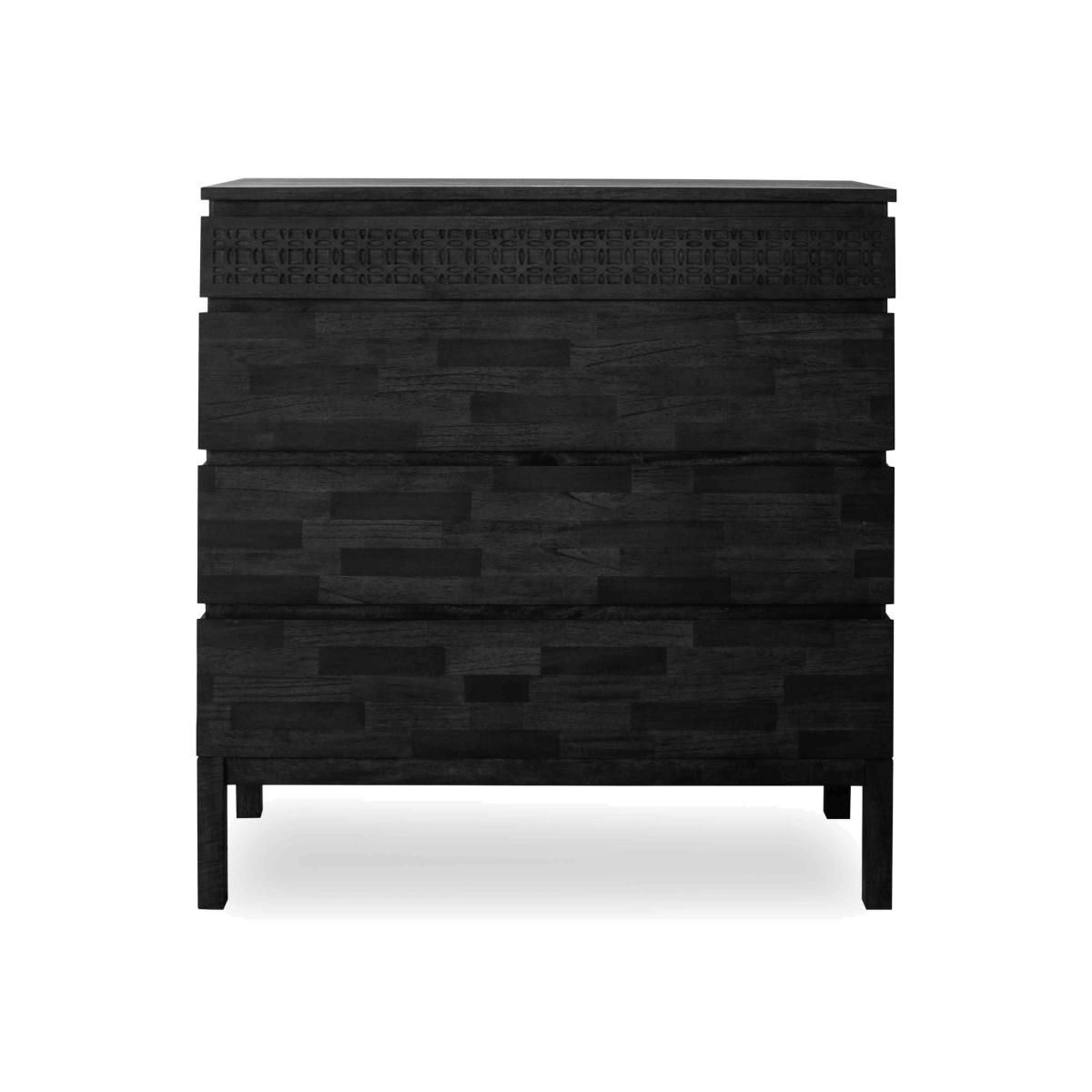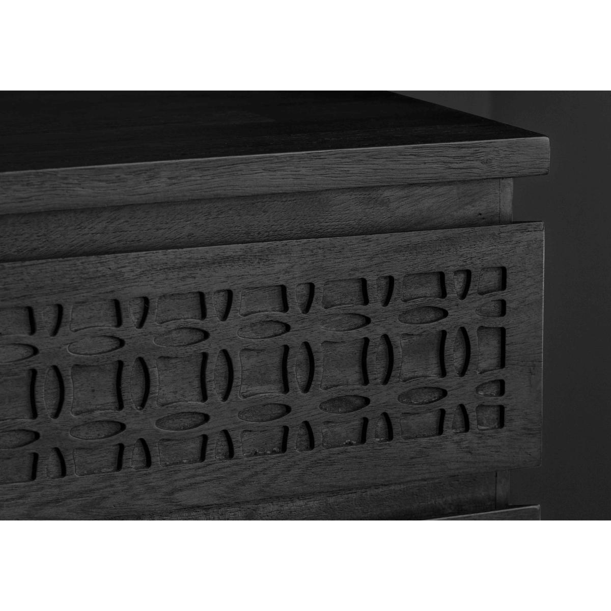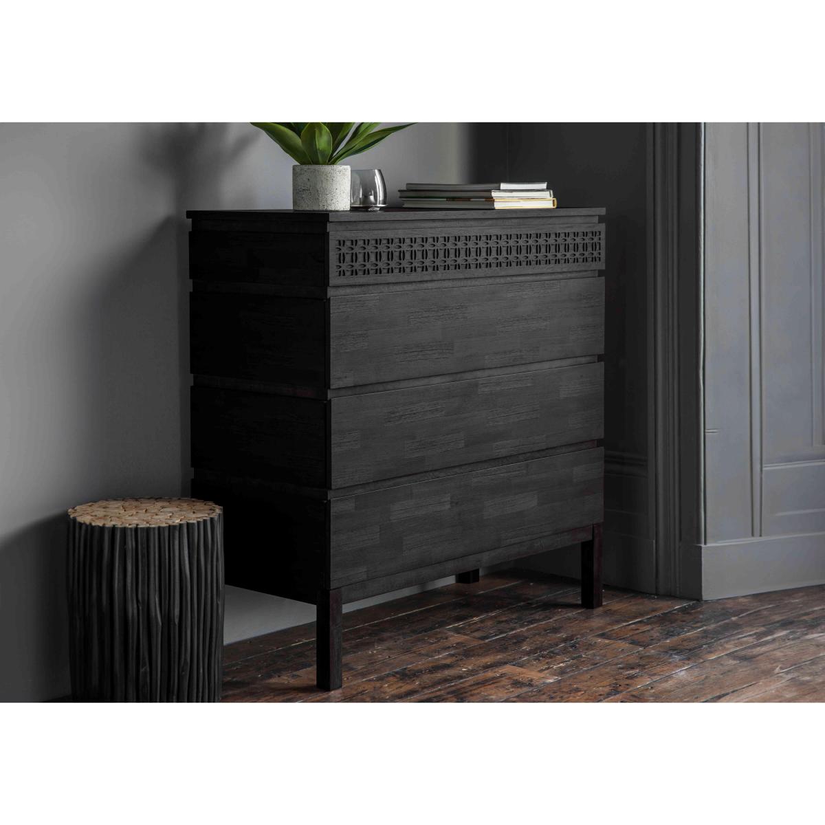 Carefully crafted with teak, mahogany, mindi ash and mango wood veneers and embellished with intricate decorative friezes, the pieces in the Ambre range bring to mind vintage furniture from far flung places. This well-curated collection includes both bedroom and living room furniture, allowing you to enjoy its beautiful patina, matt black finish, roomy storage spaces and authentic style in more than one room. Bring a unique look to your bedroom with the range’s four-poster bed and open wardrobe, and stylish practicality to your dining room in the form of a charming drinks cabinet as well as occasional tables. With all the charm and patina of a piece of vintage furniture, this lovely – and very spacious – four-drawer chest of drawers will set the stage for a stylish and unique bedroom. Why you'll love it Beautifully detailed with a gently rustic finish that suits eclectic spaces. Inspired by authentic vintage Indian furniture. Upper drawer front features an intricately patterned fretwork frieze in mango wood. Finished in teak, mahogany, mindi ash and mango wood veneers. Such a wide array of woodgrains creates a rich and varied pattern. Matt black finish. Effortlessly charming and coordinates well with both modern and classic pieces. This 4-drawer chest of drawers is part of the Ambre range. What you need to know We recommend using coasters and placemats at all times. Our Ambre bedroom range includes bed frames and storage pieces. Love the look? Be sure to browse our Ambre living room furniture collection. WARNING!