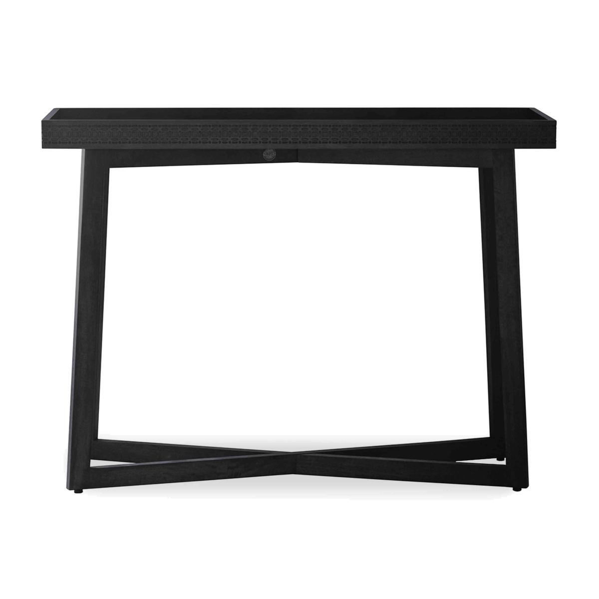 Carefully crafted with teak, mahogany, mindi ash and mango wood veneers and embellished with intricate decorative friezes, the pieces in the Ambre range bring to mind vintage furniture from far flung places. This well-curated collection includes both bedroom and living room furniture, allowing you to enjoy its beautiful patina, matt black finish, roomy storage spaces and authentic style in more than one room. Bring a unique look to your bedroom with the range’s four-poster bed and open wardrobe, and stylish practicality to your dining room in the form of a charming drinks cabinet as well as occasional tables. This elegant console table is beautifully crafted with a variety of real wood veneers for a lovely, variegated finish and has a decorative frieze around its edge. Why you'll love it Beautifully detailed with a gently rustic finish that suits eclectic spaces. Inspired by authentic vintage Indian furniture. Tray-style console table keeps books, magazines and more neatly contained. Edge features an intricately patterned fretwork frieze in mango wood. Top is finished in teak, mahogany, mindi ash and mango wood veneers. Such a wide array of woodgrains creates a rich and varied pattern. Matt black finish. Effortlessly charming and coordinates well with both modern and classic pieces. This console table is part of the Ambre range. What you need to know We recommend using coasters and placemats at all times. Our Ambre living room range includes a wide choice of occasional furniture and tables. Love the look? Be sure to browse our Ambre bedroom furniture collection.