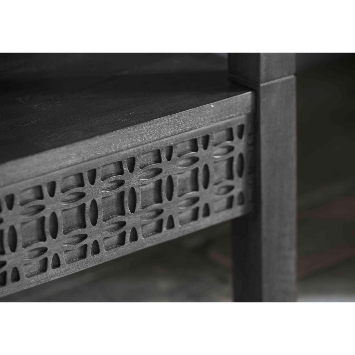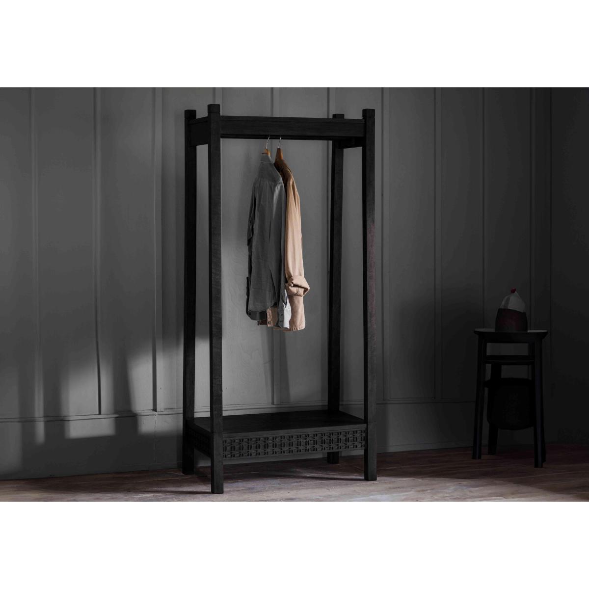 Carefully crafted with teak, mahogany, mindi ash and mango wood veneers and embellished with intricate decorative friezes, the pieces in the Ambre range bring to mind vintage furniture from far flung places. This well-curated collection includes both bedroom and living room furniture, allowing you to enjoy its beautiful patina, matt black finish, roomy storage spaces and authentic style in more than one room. Bring a unique look to your bedroom with the range’s four-poster bed and open wardrobe, and stylish practicality to your dining room in the form of a charming drinks cabinet as well as occasional tables. No room for a large wardrobe? This stylish open wardrobe offers practical storage for clothes. It's beautifully crafted with a variety of woods and features a lower shelf decorated with a fretwork frieze. Why you'll love it Beautifully detailed with a gently rustic finish that suits eclectic spaces. Inspired by authentic vintage Indian furniture. Lower shelf features an intricately patterned fretwork frieze in mango wood. Finished in teak, mahogany, mindi ash and mango wood veneers. Such a wide array of woodgrains creates a rich and varied pattern. Matt black finish. Effortlessly charming and coordinates well with both modern and classic pieces. This open wardrobe is part of the Ambre range. What you need to know Our Ambre bedroom range includes bed frames and storage pieces. Love the look? Be sure to browse our Ambre living room furniture collection. WARNING!