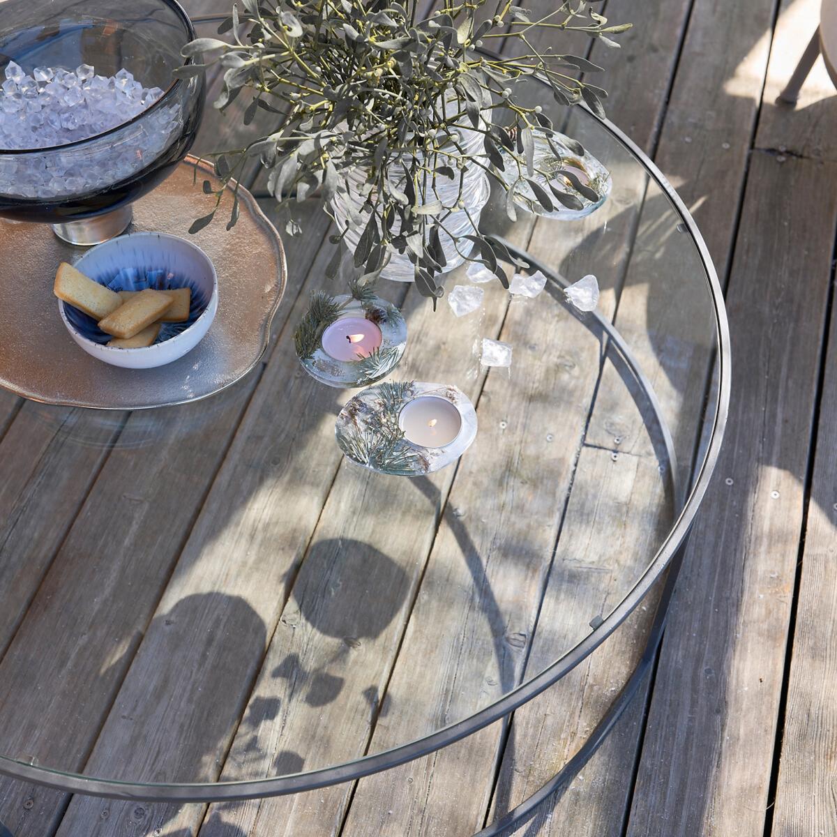 I love this round glass and metal garden table for its sleek, modern silhouette that works well in both contemporary and minimalist outdoor spaces. Its transparent glass top creates a sense of openness, making it ideal for smaller patios or terraces. Styled correctly, it can serve as a versatile centrepiece-pair it with wicker chairs and colourful cushions for a relaxed vibe, or keep it simple with monochrome outdoor furniture for a sophisticated look. Practical tips include layering with a few outdoor coasters and a small tray to keep everything neat, plus contrasting it with lush greenery or vibrant planters to add texture and colour. It’s a functional piece that combines clean design with durability, making it a great addition to most garden settings.
