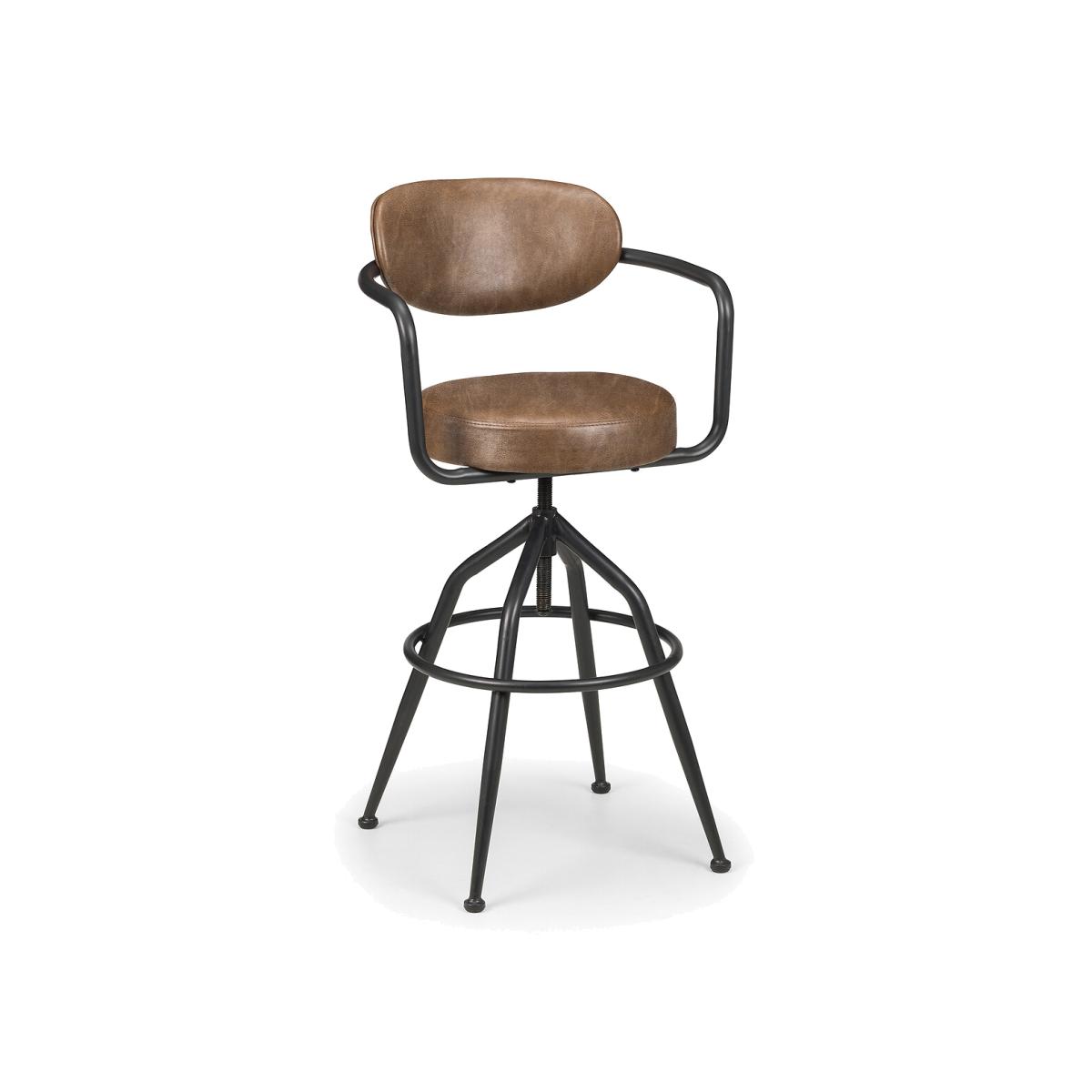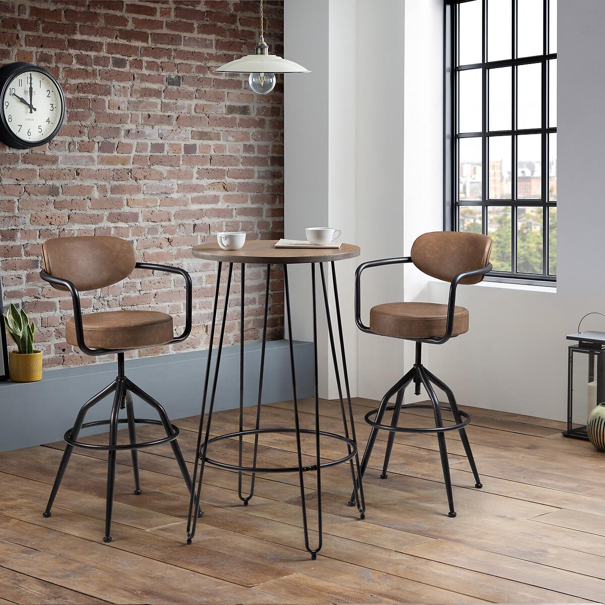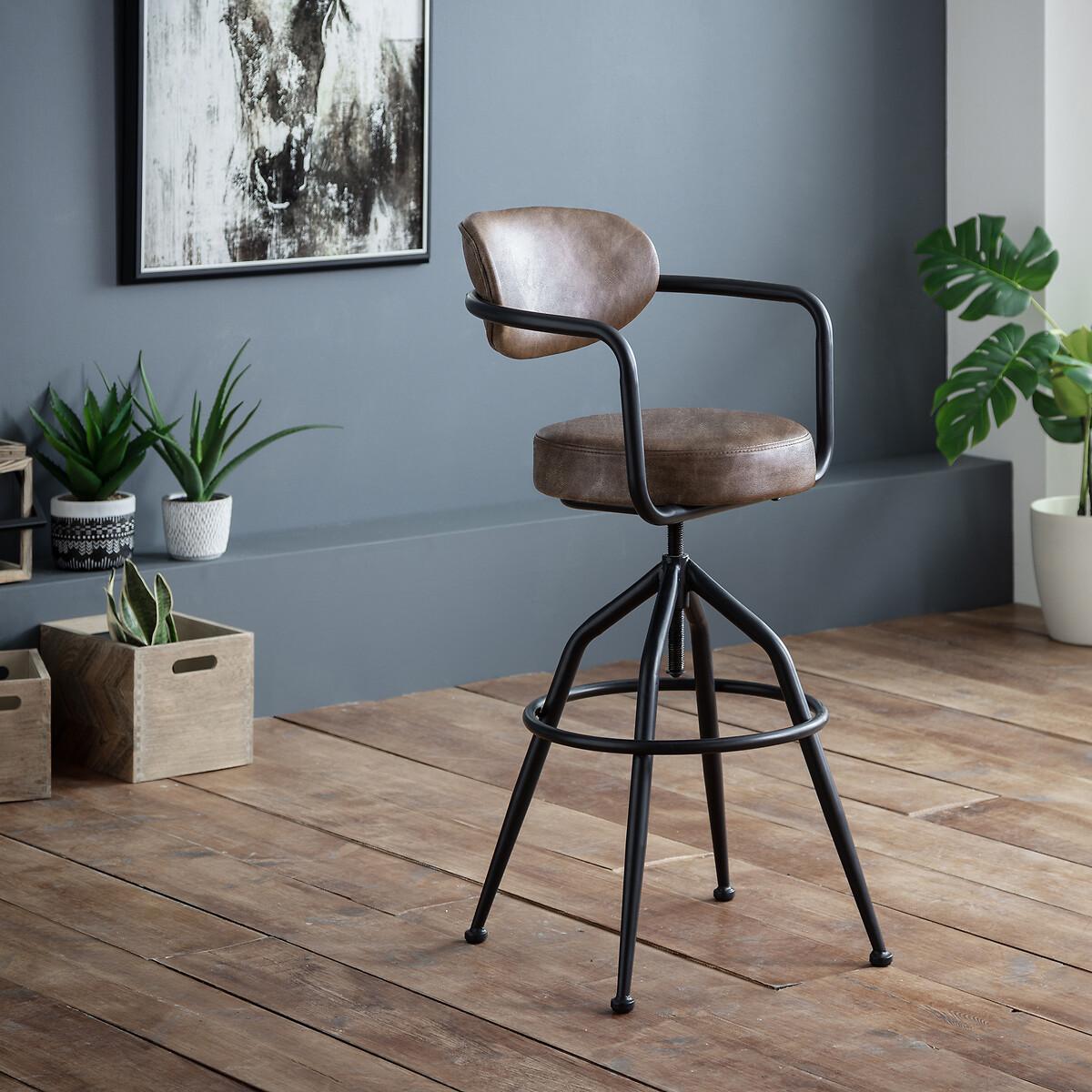 The iconic design of the Ambrose Barstool is a piece of revived history, influenced by the statement barber chairs, a perfect eye-catching centrepiece for any room. Crafted from a black metal frame with a brown faux leather upholstered seat pad and back rest, it's sure to prove a talking point in the kitchen. Product Details • Black metal frame • Foam fillings • Metal arm rests • Faux leather upholstery • Assembly required • Fixings included • 12 month manufacterers guarantee • Recommended for use with standard kitchen countertops of 90 cm height. Product Composition - 80% Brown Faux Leather & 20% Metal Frame. Product Dimensions - 51 cm x55 cm x100 cm , Weight - 9 KGSeat height - 64.5 - 81 cm (adjustable)Package Dimensions - 58 cm x 48 cm x 46 cm, Weight 10.5 kg. Please check your measurements before ordering. We recommend purchasing stools to be no less than 15cm and no more than 25cm from the top of the stool to the underside of the countertop. Please note: this product cannot be be delivered to all Offshore Islands Northern Ireland or Republic of Ireland. This product will be dispatched by one of our trusted suppliers. You’ll be contacted by their selected courier about your delivery.