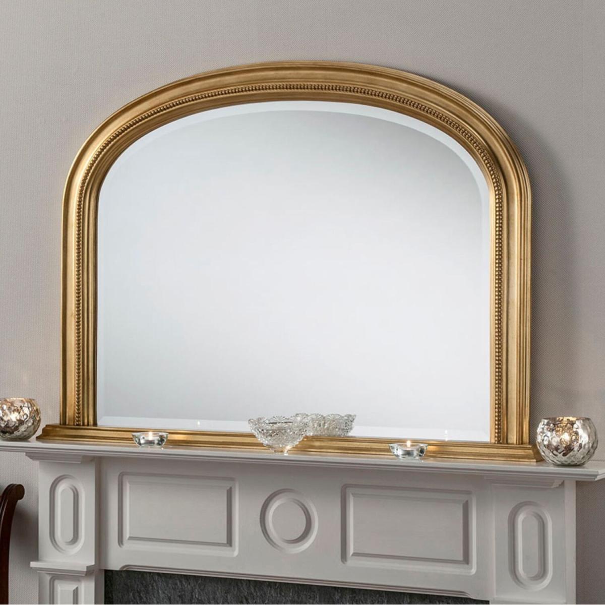 The Amelia, a beautiful gold bevelled beaded overmantle mirror. This item will add style to any living room or bedroom. The gold frame in this overmantle mirror adds a definite elegant edge to a room. The beading sits close to the glass, around the arch so is easy to spot. This mirror looks fantastic and boasts a contemporary look when placed sitting atop a white fireplace.
