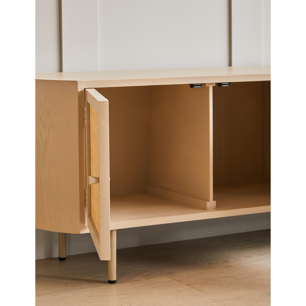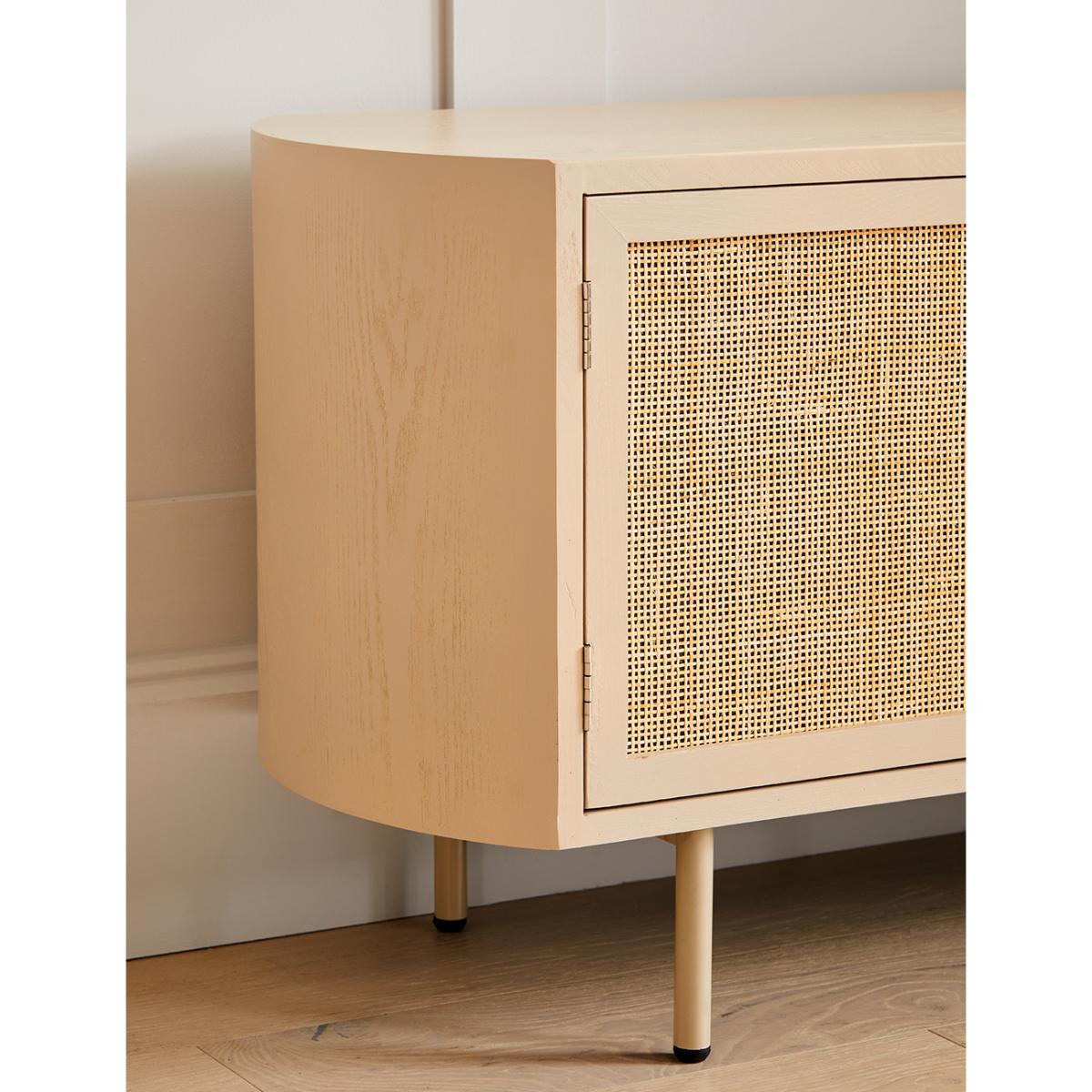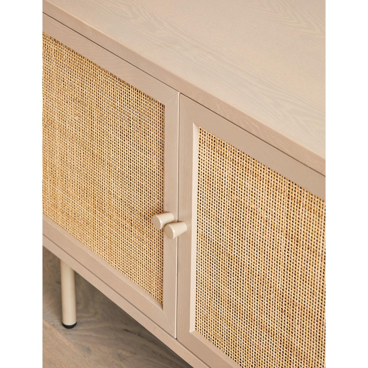 Incorporate nude tones and natural textures into your home with the Amelia Cream Rustic Sideboard. In a beautiful creamy taupe shade, this wooden sideboard has plenty of space to keep your home organized and clutter-free. The natural rattan on the doors adds organic texture to the room, whilst the sleek lines and expert craftsmanship add a contemporary touch. With a curved silhouette and open shelves, this rattan sideboard is the perfect fusion of farmhouse and midcentury style. Pair with the Amelia Cream Rattan Console Table and curate a matching furniture set.