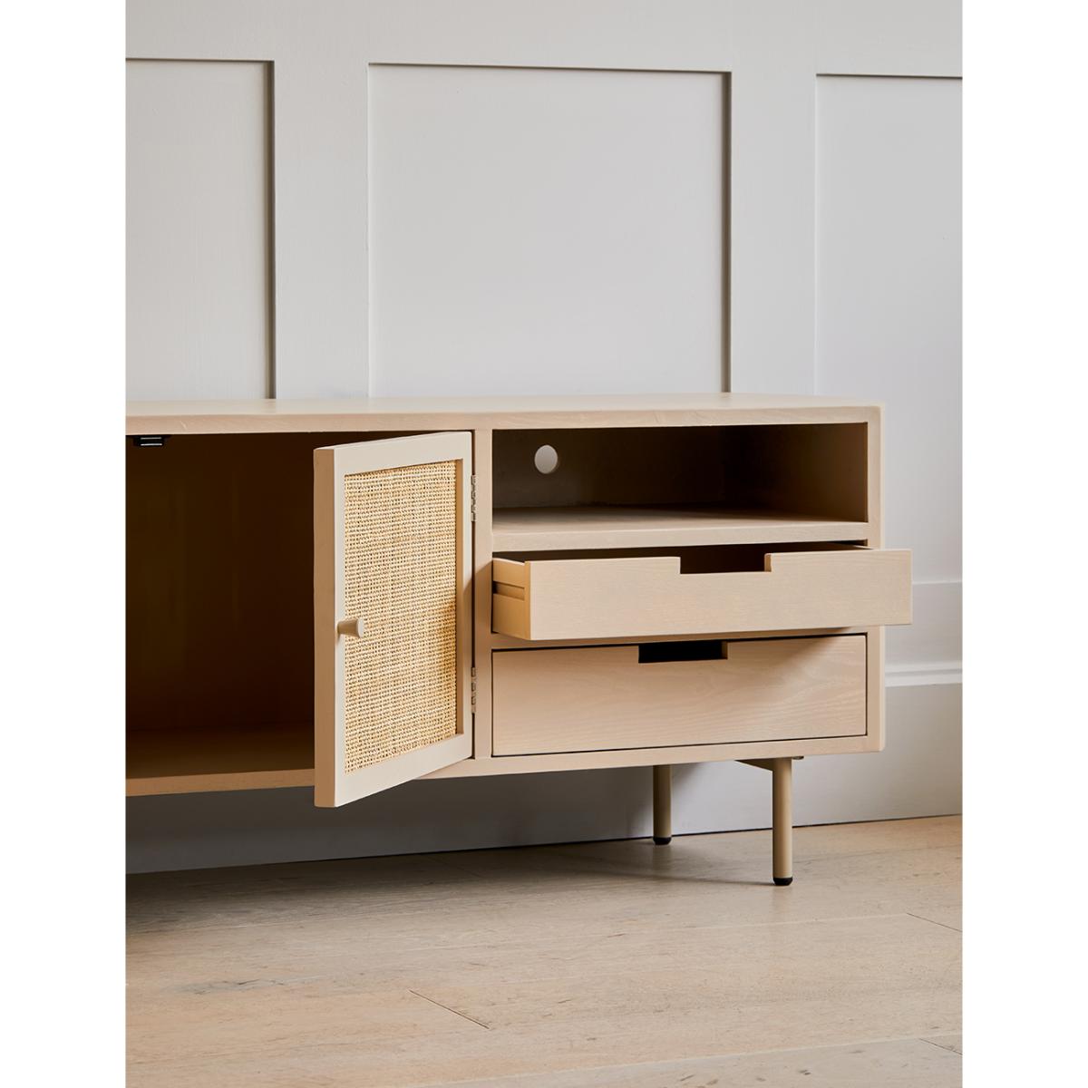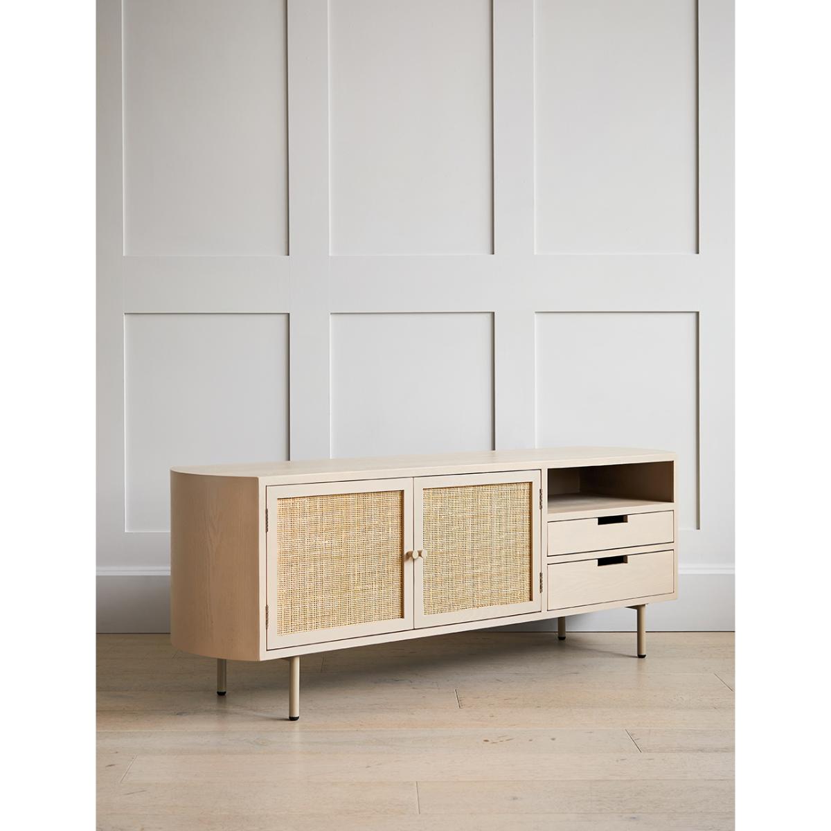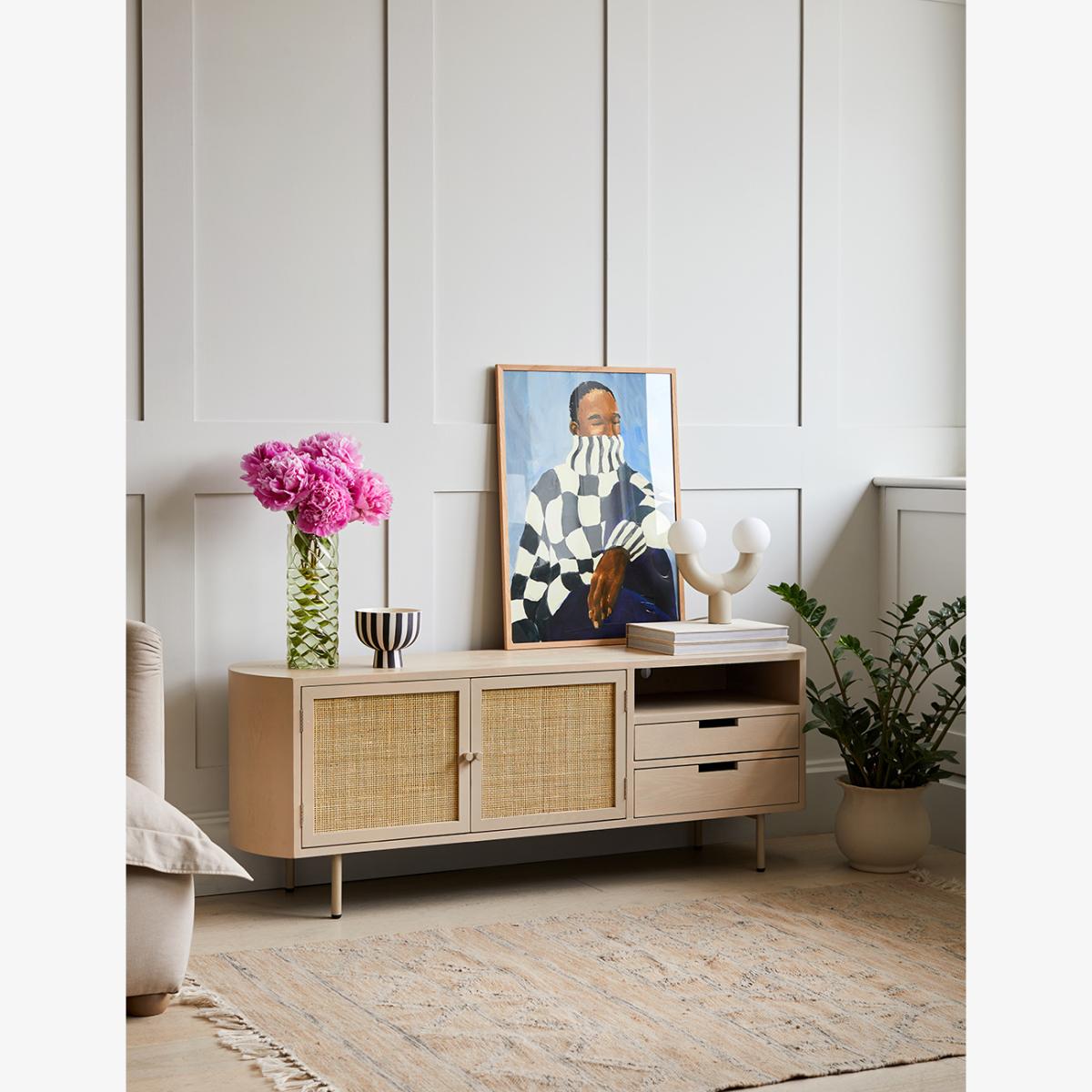 Incorporate nude tones and natural textures into your home with the Amelia Cream Rustic Sideboard. In a beautiful creamy taupe shade, this wooden sideboard has plenty of space to keep your home organized and clutter-free. The natural rattan on the doors adds organic texture to the room, whilst the sleek lines and expert craftsmanship add a contemporary touch. With a curved silhouette and open shelves, this rattan sideboard is the perfect fusion of farmhouse and midcentury style. Pair with the Amelia Cream Rattan Console Table and curate a matching furniture set.