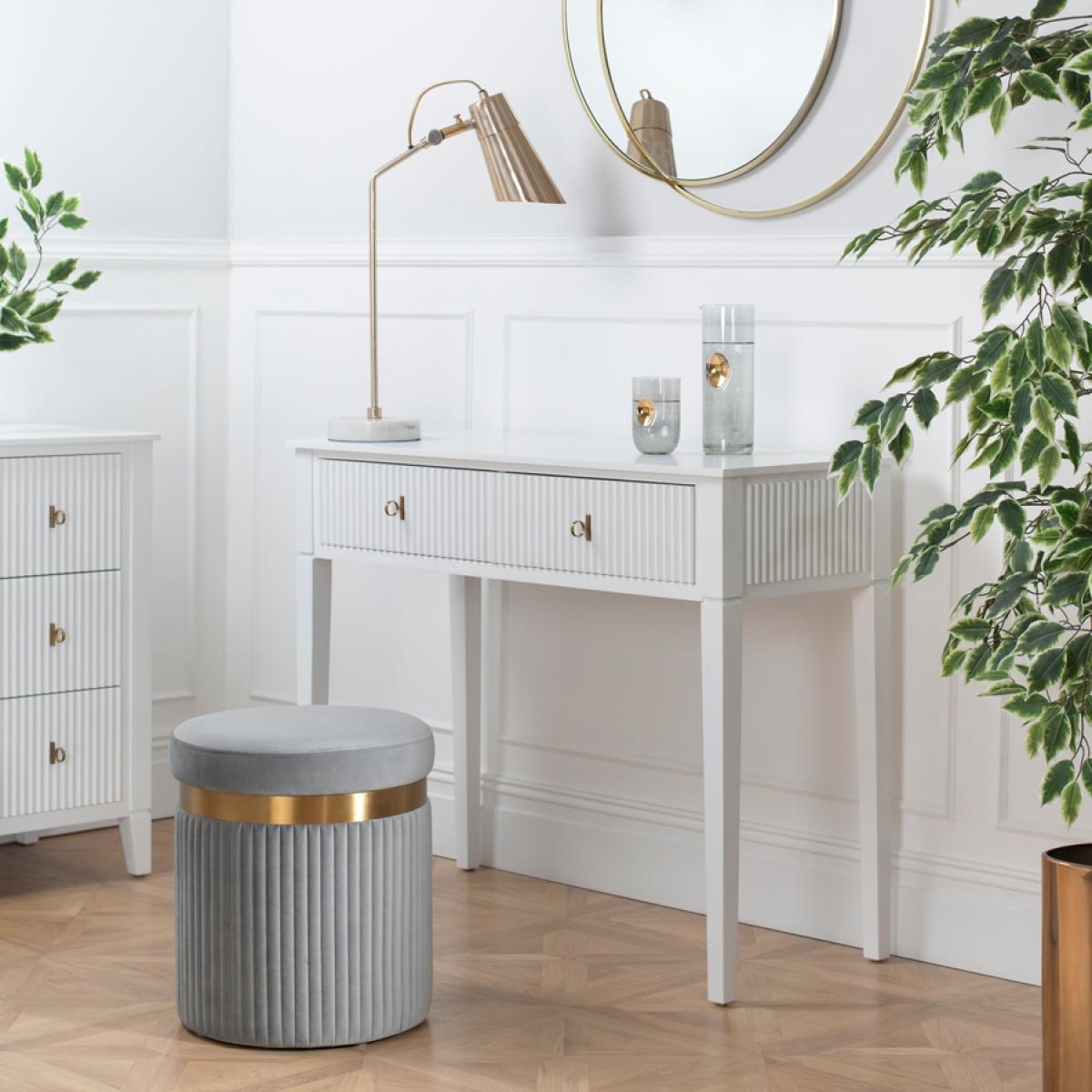 I love this little footstool for its versatile design and tactile texture. Its understated elegance makes it suitable for both contemporary and classic interiors, adding a touch of sophistication without overpowering the space. The neutral grey colour ensures it can blend seamlessly with a range of colour schemes, while the ribbed detailing provides visual interest. It works particularly well in living rooms as a practical footrest or additional seating, and can also serve as a stylish accent in bedrooms or dressing areas. For styling tips, consider pairing it with plush sofas or neutral carpets to keep the look cohesive, and don’t be afraid to play with contrasting textures-like velvet cushions or shaggy rugs-to make the stool stand out.