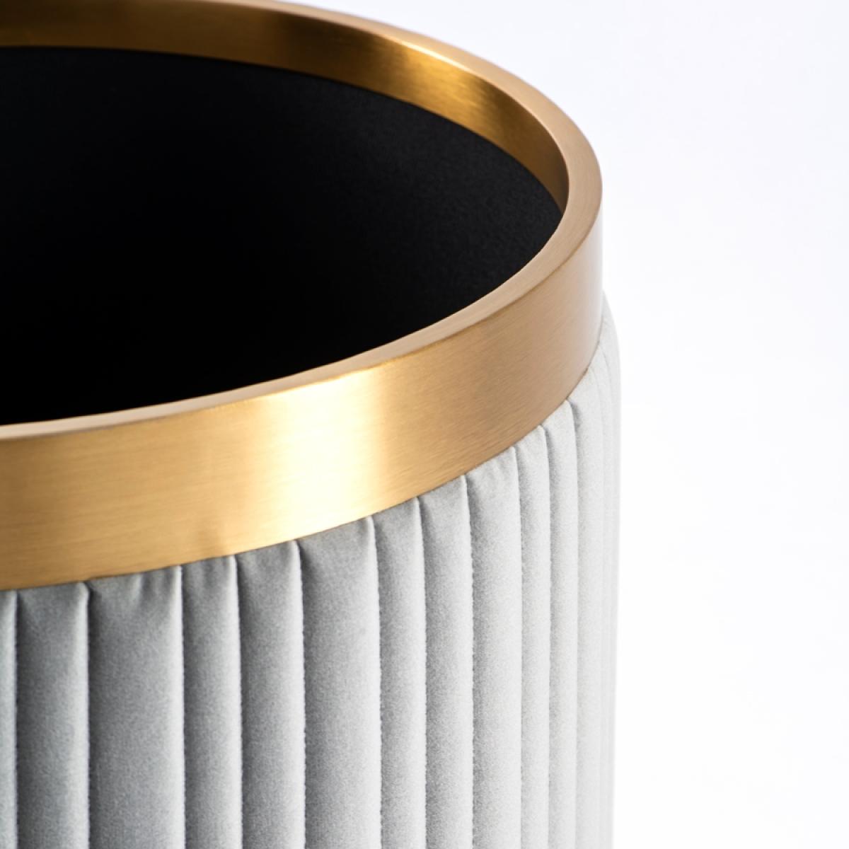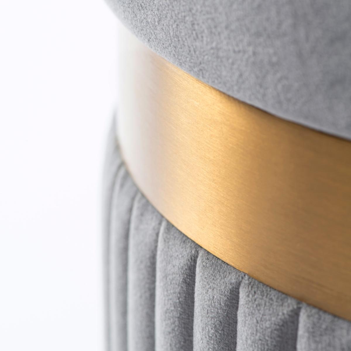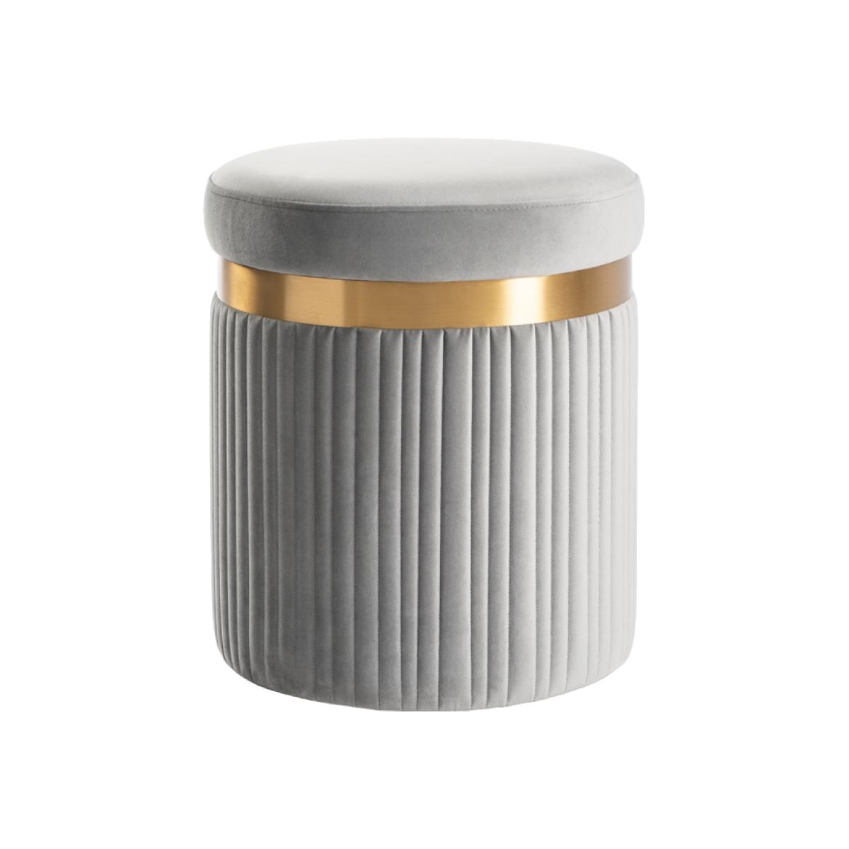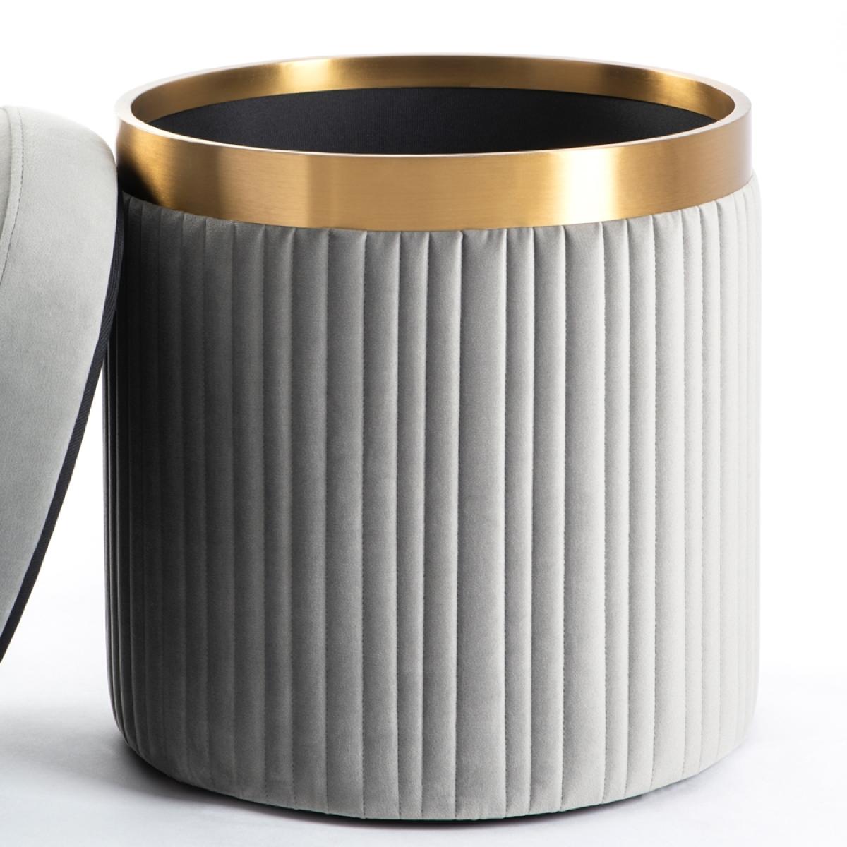 A pretty, classic design which may be used as a dressing stool, footstool or storage container. Foam padded top for comfort. Velvet upholstery fabric with fluting detail. Internal storage space perfect for storing blankets, cushions, toys, books, chargers etc. Brushed stainless steel metal work with brass finish. Tough black lining cloth.