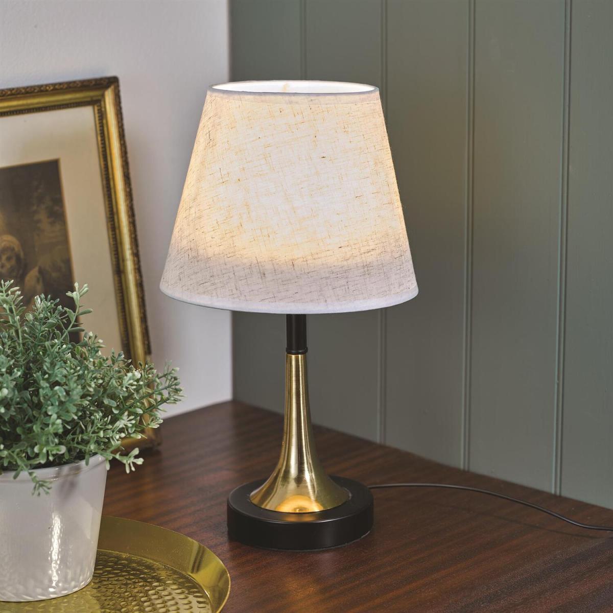 This lamp sheds a comforting glow and can be moved around easily where you need it. The stem has a brass colour finish, with black at base and top, and it comes with 3W LED bulb that will give up to 50,000 hours of light. With linen coloured shade, it's ideal for the bedside or study.