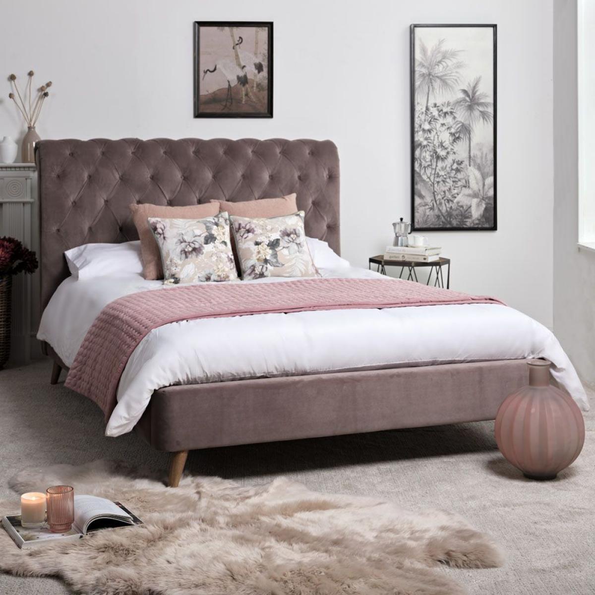The Amelia velvet bedframe in truffle features a traditional buttoned headboard with a scroll top. The bedframe is fully upholstered all down both siderails and footend and comes ready to assemble with an easy-fit slatted base which is held in place with velcro strips. The Amelia is a gorgeous bed and its design lends itself to so many different home styles. Also available in grey. Dimensions: Double to Fit Mattress W135cm x L190cm Outer Dimensions: Double W151cm x L210cm x H134cm. Dimensions: King to Fit Mattress W150cm x L200cm Outer Dimensions: Kingsize W166cm x L220cm x H134cm Velvet upholstery Wooden legs. Slatted base included. Simple self assembly