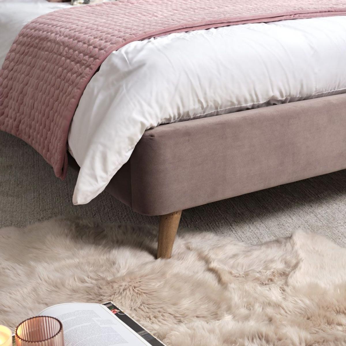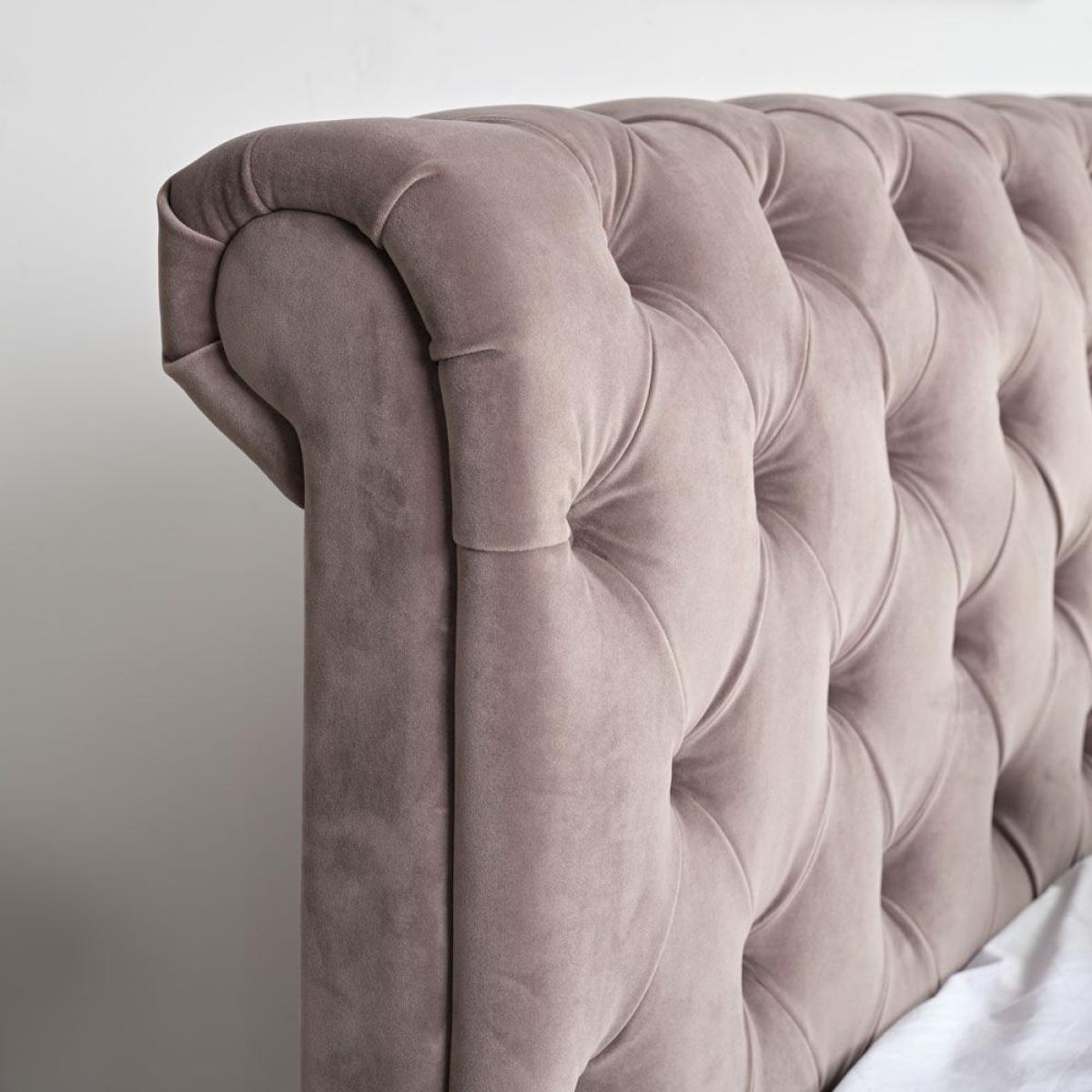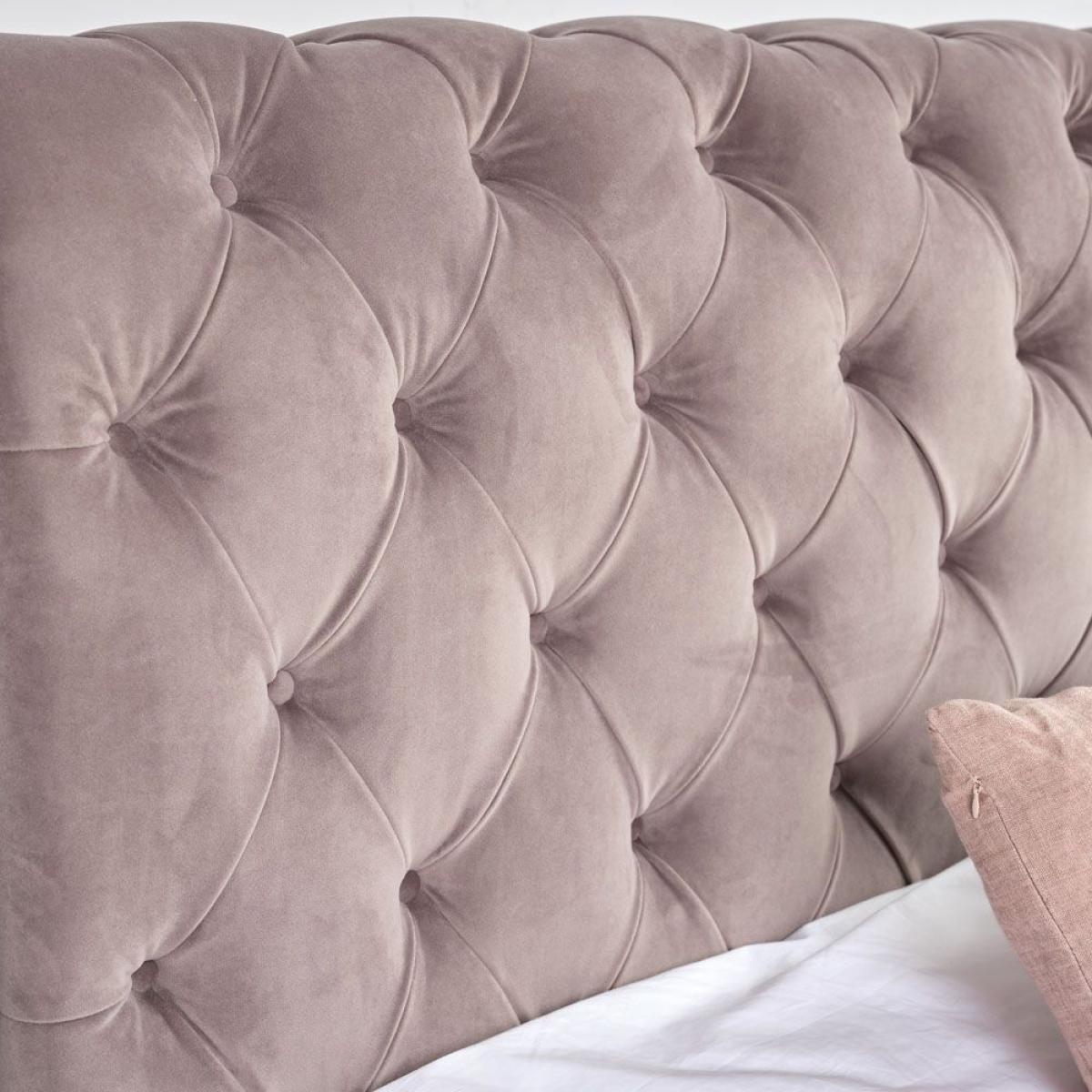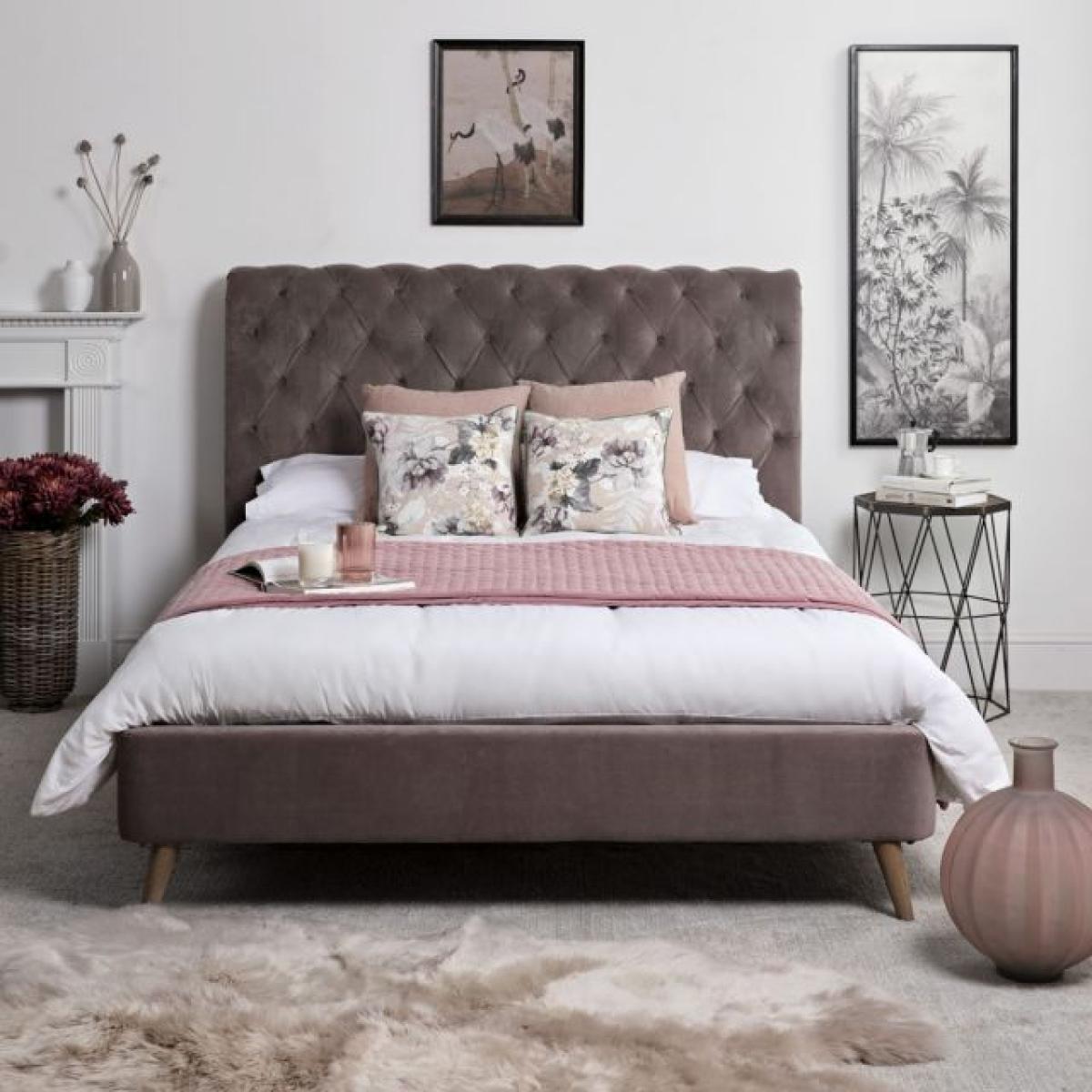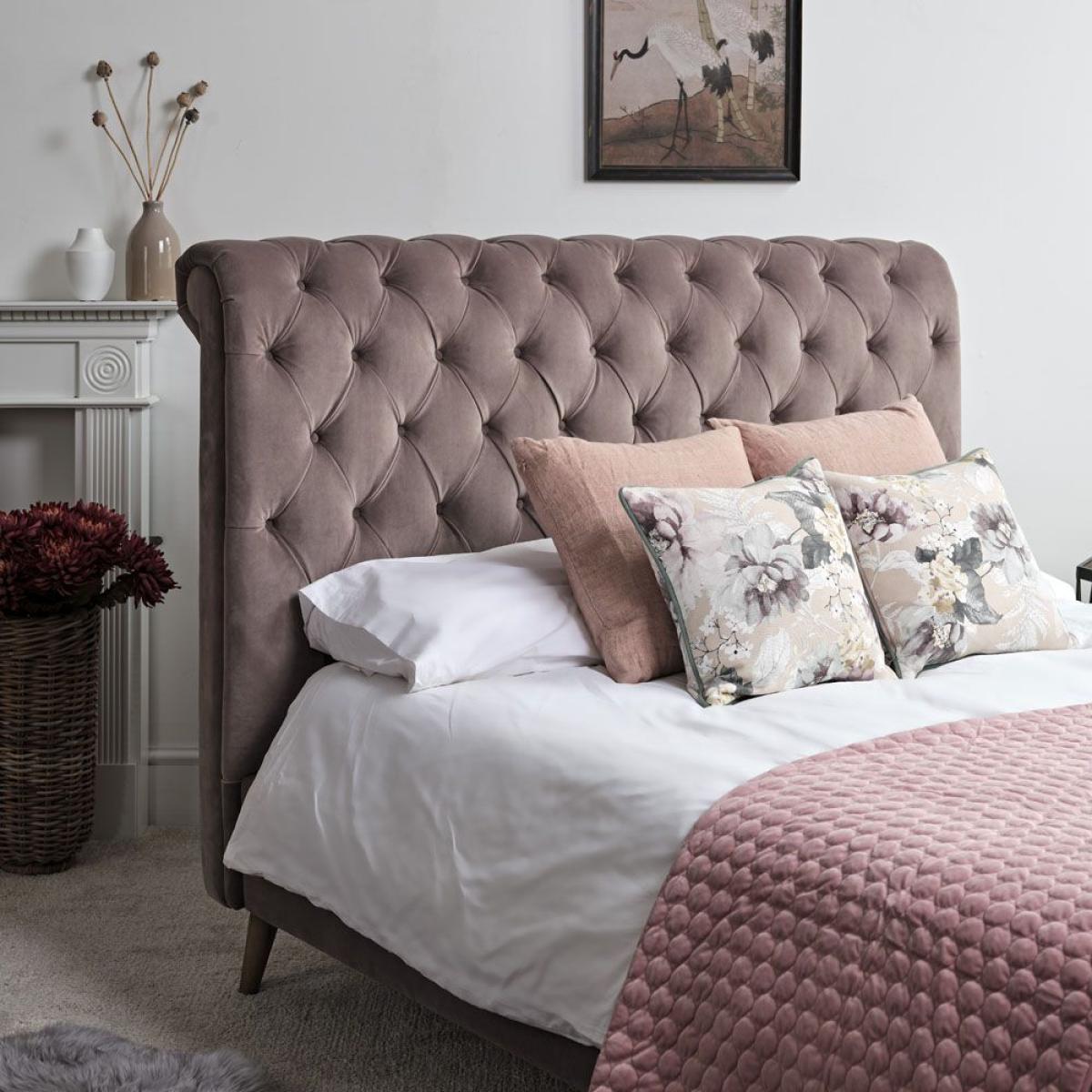The Amelia velvet bedframe in truffle features a traditional buttoned headboard with a scroll top. The bedframe is fully upholstered all down both siderails and footend and comes ready to assemble with an easy-fit slatted base which is held in place with velcro strips. The Amelia is a gorgeous bed and it's design lends itself to so many different home styles. Also available in grey.