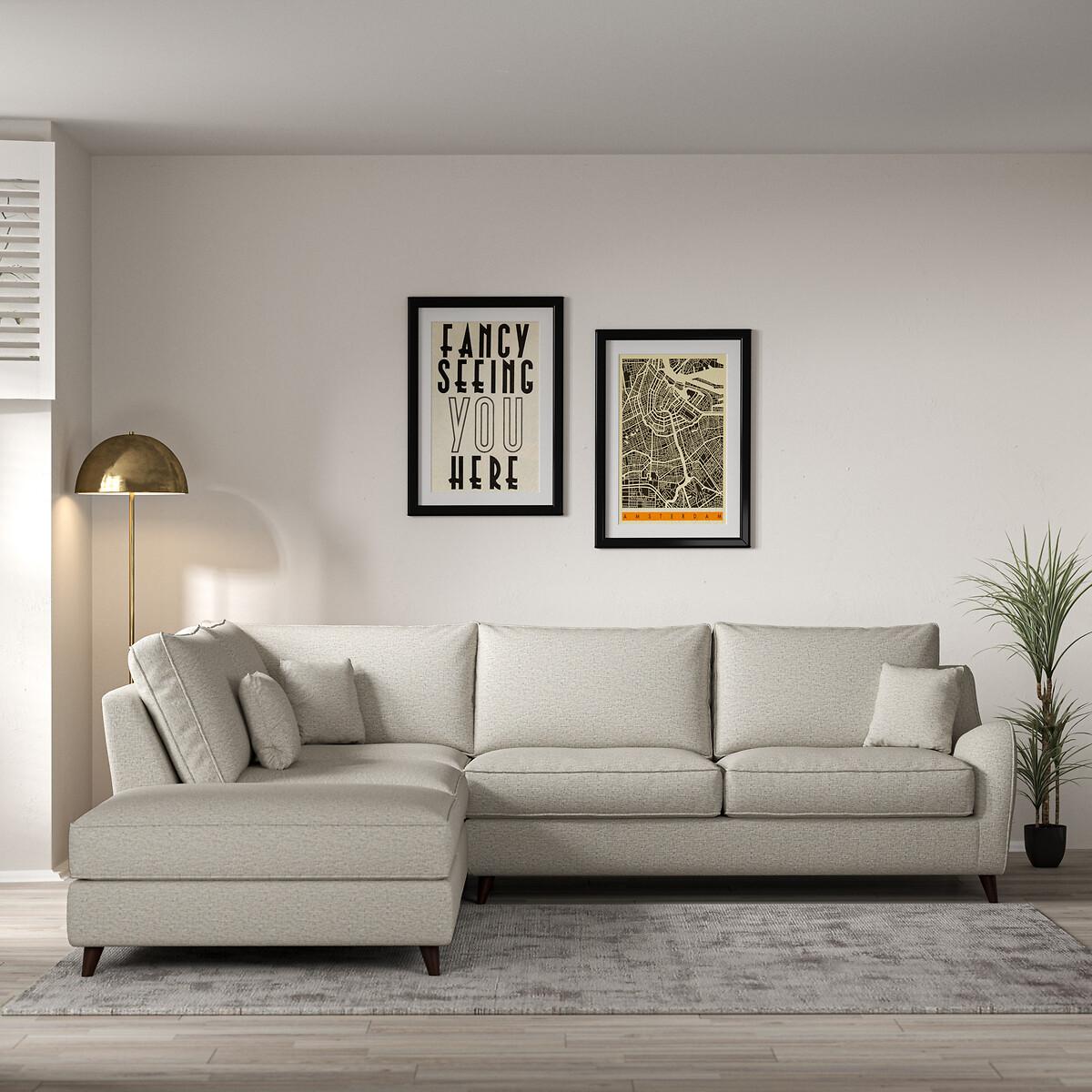 I love this corner sofa and modular footstool set for its versatile design and practical size, perfect for making the most of smaller or irregularly shaped living rooms. Its neutral tone allows it to slot seamlessly into a variety of interior styles-from Scandi minimalism to contemporary casual. The dark wood legs lend it a touch of warmth and sophistication, elevating the look without overpowering the space. Practical styling tips would include layering with textured cushions and throws to add comfort and visual interest, and pairing with a statement rug to anchor the seating area. It works well with both soft, light colour palettes or bolder accents, making it a versatile choice for most modern interiors.