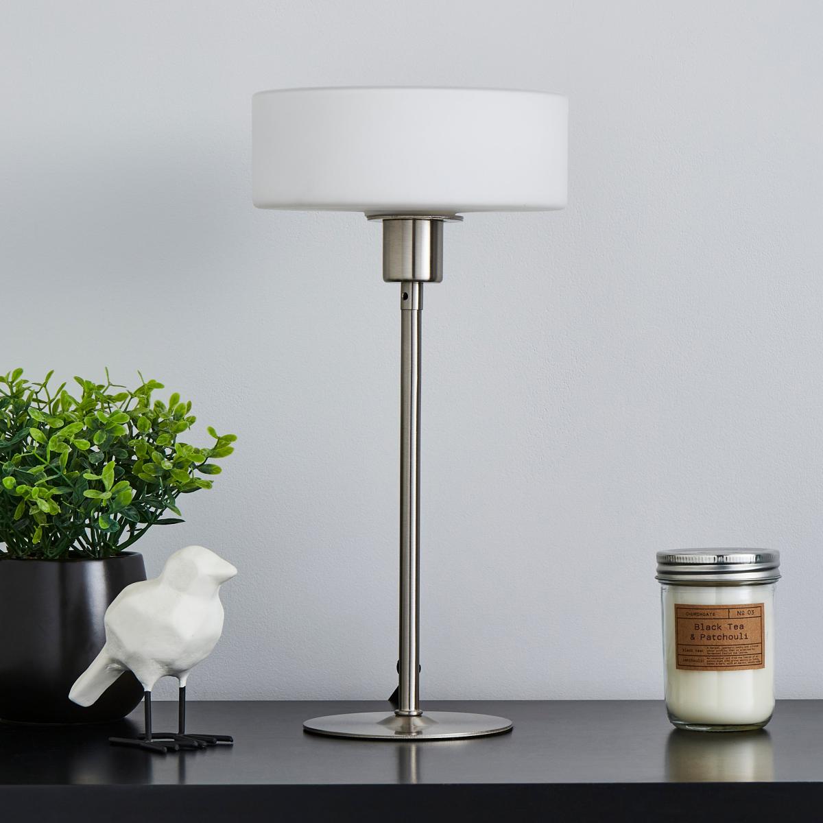 I really like this lamp for its clean and contemporary look. The opal glass shade provides a soft, diffused light that’s perfect for creating a cosy atmosphere in living rooms or bedrooms, while the satin nickel finish adds a touch of modern elegance. It's versatile enough to suit both minimalist interiors and more transitional styles. For styling tips, try pairing it with a simple, elegant side table or as a bedside lamp for added functionality. It works well with neutral palettes but can also add a touch of sophistication to spaces with darker or bolder colour schemes. Keep the surroundings understated to let this piece stand out, or layer with other metallic accents for a cohesive, contemporary feel.
